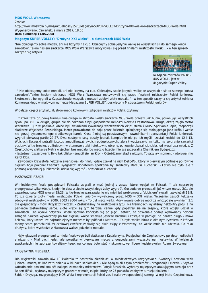 MOS WOLA Warszawa Źródło: http://www.moswola.pl/mos/aktualnosci/1570,Magazyn-SUPER-VOLLEY-Druzyna-XXI-wieku-o-siatkarzach-MOS-Wola.html Wygenerowano: Czwartek, 2 marca 2017, 18:55 Data publikacji 11.05.2008 Magazyn SUPER VOLLEY: "Drużyna XXI wieku" - o siatkarzach MOS Wola "Nie obiecujemy sobie medali, ani nie liczymy na cud. Obiecajmy sobie jedynie walkę ze wszystkich sił do samego końca zawodów".Takim hasłem siatkarze MOS Wola Warszawa motywowali się przed finałami mistrzostw Polski... - w ten sposób zaczyna się artykuł. To zdjęcie mistrzów Polski MOS WOLA - jest w Magazynie Super Volley. " Nie obiecujemy sobie medali, ani nie liczymy na cud. Obiecajmy sobie jedynie walkę ze wszystkich sił do samego końca zawodów".Takim hasłem siatkarze MOS Wola Warszawa motywowali się przed finałami mistrzostw Polski juniorów. Skutecznie , bo wygrali w Częstochowie wszystkie mecze i zdobyli złoty medal..." - w ten sposób zaczyna się artykuł Adriana Komorowskiego w majowym numerze Magazynu SUPER VOLLEY, poświęcony Mistrzostwom Polski Juniorów. W dalszej części artykułu, ilustrowanego kolorowym zdjęciem mistrzów Polski, czytamy: " Przez fazę grupową turnieju finałowego mistrzostw Polski siatkarze MOS Wola przeszli jak burza, pokonując wszystkich rywali po 3:0. W drugiej grupie nie do pokonania byli gospodarze Delic-Pol Norwid Częstochowa. Drugą lokatę zajęło Metro Warszawa i już w półfinale kibice byli świadkami rywalizacji warszawskich ekip: Metra i MOS. Spotkanie lepiej rozpoczęli siatkarze Wojciecha Szczuckiego. Metro prowadzone do boju przez świetnie spisującego się atakującego Jana Króla i wcale nie gorzej dysponowanego środkowego Karola Kłosa ( obaj są podstawowymi zawodnikami reprezentacji Polski juniorów), wygrali pierwszą partię 29:27. Dwa następne sety poszły jednak kompletnie nie po ich myśli - zostali rozbici do 12 i 13. Wojciech Szczucki potrafił jeszcze zmobilizować swoich podopiecznych, ale sił wystarczyło im tylko na wygranie czwartej odsłony. W tie-breaku, obfitującym w atomowe ataki i efektowne obrony, ponownie okazali się słabsi od rywali zza miedzy. Z Częstochowy siatkarze Metra wyjechali bez medalu, bo mecz o trzecie miejsce przegrali z Chemikiem Bydgoszcz. - Jesteśmy rozczarowani. Było tak blisko - smucił się Jan Król. - Odjeżdżamy stąd z niczym. To przykry moment - wtórował mu Karol Kłos. Zawodnicy Krzysztofa Felczaka awansowali do finału, gdzie czekał na nich Delic-Pol, który w pierwszym półfinale po równie ciężkim boju pokonał Chemika Bydgoszcz. Bohaterem spotkania był środkowy Mateusz Kucharski. - Łatwo nie było, ale z pomocą wspaniałej publiczności udało się wygrać - powiedział Kucharski. MAZOWSZE RZĄDZI W niedzielnym finale podopieczni Felczaka zagrali w myśl jednej z zasad, które wpajał im Felczak: " tak naprawdę przegrywasz tylko wtedy, kiedy nie dasz z siebie wszystkiego żeby wygrać". Gospodarze prowadzili już w tym meczu 2:1, ale czwartego seta MOS wygrał 25:23. W tie-breaku warszawianie nie mieli już problemów z "dobiciem" rywali i zwyciężyli 15:8. To już czwarty złoty medal mistrzostw Polski juniorów wywalczony przez MOS w XXI wieku. Wcześniej zespół Felczaka zdobywał mistrzostwo w 2000, 2003 i 2004 roku. - To był mecz walki, który równie dobrze mógł zakończyć się wynikiem 3:1 dla gospodarzy - mówi Krzysztof Felczak. - Zasłużyliśmy na mistrzowski tytuł. Na treningach wylaliśmy hektolitry potu, a na parkiecie zostawiliśmy serce. Złote krążki są tym bardziej cenne, gdy popatrzy się na zespoły, które wzięły udział w zawodach i na wyniki potyczek. Wiele spotkań kończyło się po pięciu setach, co doskonale oddaje wyrównany poziom zmagań. Sukces wywalczony po tak ciężkiej walce smakuje jeszcze bardziej i zostaje w pamięci na bardzo długo - mówi Felczak, kóry uważa, że najtrudniejszym meczem był półfinał z Metrem. - To była wielka bitwa z lokalnym rywalem, z którym mamy stare porachunki. W czołowej czwórce znalazły się dwie ekipy z Warszawy, co wcale mnie nie zdziwiło. Co roku drużyny, które wychodzą z Mazowsza walczą później o medale. Największymi przegranymi turnieju finałowego byli siatkarze z Kędzierzyna. Przyjechali do Częstochowy po złoto , odjechali z niczym. - Miał być medal, ale porażka w pierwszym meczu z gospodarzami wszystko nam ustawiła. W kolejnych spatkaniach nie zaprezentowaliśmy tego, na co nas było stać - skomentował libero kędzierzynian Adam Swaczyna. TA OSTATNIA NIEDZIELA Dla większości zawodników 13 kwietnia to "ostatnia niedziela": w młodzieżowych rozgrywkach. Skończyli bowiem wiek juniora i muszą szukać zatrudnienia w klubach seniorskich. - Nie będą mieli z tym problemów - prognozuje Felczak. - Szybko zatrudnienie powinni znaleźć najlepsi zawodnicy mistrzostw, Patryk Strzeżek, wybrany najlepszym atakującym turnieju oraz Robert Iliński, wybrany najlepszym graczem w mojej ekipie, który aż 25 punktów zdobył w turnieju blokiem ! Fabian Drzyzga, rozgrywający MOS Wola i reprezentacji Polski zasili najprawdopodobniej szeregi Wkręt-Metu Częstochowa. Kolejni kandydaci na szybki angaż w PLS to Karol Kłos i Janek Król z Metra. Obaj zagrali bardzo dobry i równy turniej. Kto jeszcze ? Mateusz Kucharski z Delic-Polu i Łukasz Wiśniewski, Sebastian Tylicki i Wojtek Kozłowski z Chemika, Grzesiek Wójtowicz i Adaś Swaczyna z MMKS-u Kędzierzyn Koźle. Już wkrótce o nich wszystkich powinno być głośno - dodał Felczak. W dalszej części artykułu autor opisuje turniej finałowy juniorek, który odbył się w Łańcucie. Zapraszamy do lektury majowego numeru Magazynu " SUPER VOLLEY ". Komentarz (0) dodaj komentarz Brak komentarzy dodaj komentarz