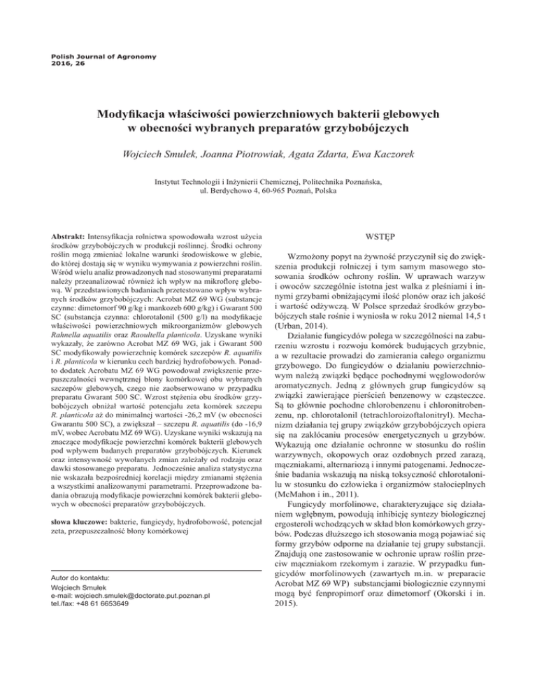 64 Polish Journal of Agronomy 2016, 26 Polish Journal of Agronomy, No. 26, 2016 Modyfikacja właściwości powierzchniowych bakterii glebowych w obecności wybranych preparatów grzybobójczych Wojciech Smułek, Joanna Piotrowiak, Agata Zdarta, Ewa Kaczorek Instytut Technologii i Inżynierii Chemicznej, Politechnika Poznańska, ul. Berdychowo 4, 60-965 Poznań, Polska Abstrakt: Intensyfikacja rolnictwa spowodowała wzrost użycia środków grzybobójczych w produkcji roślinnej. Środki ochrony roślin mogą zmieniać lokalne warunki środowiskowe w glebie, do której dostają się w wyniku wymywania z powierzchni roślin. Wśród wielu analiz prowadzonych nad stosowanymi preparatami należy przeanalizować również ich wpływ na mikroflorę glebową. W przedstawionych badaniach przetestowano wpływ wybranych środków grzybobójczych: Acrobat MZ 69 WG (substancje czynne: dimetomorf 90 g/kg i mankozeb 600 g/kg) i Gwarant 500 SC (substancja czynna: chlorotalonil (500 g/l) na modyfikacje właściwości powierzchniowych mikroorganizmów glebowych Rahnella aquatilis oraz Raoultella planticola. Uzyskane wyniki wykazały, że zarówno Acrobat MZ 69 WG, jak i Gwarant 500 SC modyfikowały powierzchnię komórek szczepów R. aquatilis i R. planticola w kierunku cech bardziej hydrofobowych. Ponadto dodatek Acrobatu MZ 69 WG powodował zwiększenie przepuszczalności wewnętrznej błony komórkowej obu wybranych szczepów glebowych, czego nie zaobserwowano w przypadku preparatu Gwarant 500 SC. Wzrost stężenia obu środków grzybobójczych obniżał wartość potencjału zeta komórek szczepu R. planticola aż do minimalnej wartości -26,2 mV (w obecności Gwarantu 500 SC), a zwiększał – szczepu R. aquatilis (do -16,9 mV, wobec Acrobatu MZ 69 WG). Uzyskane wyniki wskazują na znaczące modyfikacje powierzchni komórek bakterii glebowych pod wpływem badanych preparatów grzybobójczych. Kierunek oraz intensywność wywołanych zmian zależały od rodzaju oraz dawki stosowanego preparatu. Jednocześnie analiza statystyczna nie wskazała bezpośredniej korelacji między zmianami stężenia a wszystkimi analizowanymi parametrami. Przeprowadzone badania obrazują modyfikacje powierzchni komórek bakterii glebowych w obecności preparatów grzybobójczych. słowa kluczowe: bakterie, fungicydy, hydrofobowość, potencjał zeta, przepuszczalność błony komórkowej Autor do kontaktu: Wojciech Smułek e-mail: [email protected] tel./fax: +48 61 6653649 WSTĘP Wzmożony popyt na żywność przyczynił się do zwiększenia produkcji rolniczej i tym samym masowego stosowania środków ochrony roślin. W uprawach warzyw i owoców szczególnie istotna jest walka z pleśniami i innymi grzybami obniżającymi ilość plonów oraz ich jakość i wartość odżywczą. W Polsce sprzedaż środków grzybobójczych stale rośnie i wyniosła w roku 2012 niemal 14,5 t (Urban, 2014). Działanie fungicydów polega w szczególności na zaburzeniu wzrostu i rozwoju komórek budujących grzybnie, a w rezultacie prowadzi do zamierania całego organizmu grzybowego. Do fungicydów o działaniu powierzchniowym należą związki będące pochodnymi węglowodorów aromatycznych. Jedną z głównych grup fungicydów są związki zawierające pierścień benzenowy w cząsteczce. Są to głównie pochodne chlorobenzenu i chloronitrobenzenu, np. chlorotalonil (tetrachloroizoftalonitryl). Mechanizm działania tej grupy związków grzybobójczych opiera się na zakłócaniu procesów energetycznych u grzybów. Wykazują one działanie ochronne w stosunku do roślin warzywnych, okopowych oraz ozdobnych przed zarazą, mączniakami, alternariozą i innymi patogenami. Jednocześnie badania wskazują na niską toksyczność chlorotalonilu w stosunku do człowieka i organizmów stałocieplnych (McMahon i in., 2011). Fungicydy morfolinowe, charakteryzujące się działaniem wgłębnym, powodują inhibicję syntezy biologicznej ergosteroli wchodzących w skład błon komórkowych grzybów. Podczas dłuższego ich stosowania mogą pojawiać się formy grzybów odporne na działanie tej grupy substancji. Znajdują one zastosowanie w ochronie upraw roślin przeciw mączniakom rzekomym i zarazie. W przypadku fungicydów morfolinowych (zawartych m.in. w preparacie Acrobat MZ 69 WP) substancjami biologicznie czynnymi mogą być fenpropimorf oraz dimetomorf (Okorski i in. 2015). W. Smułek i in. – Modyfikacja właściwości powierzchniowych bakterii glebowych ... Dotychczas przeważająca część badań dotyczących fungicydów obejmowała określenie ich mechanizmu działania na komórki grzybów, wpływu na kondycję upraw oraz zdrowie człowieka. Należy jednak zwrócić uwagę na wpływ stosowanych preparatów grzybobójczych także na te mikroorganizmy bytujące w ekosystemie, które nie są celem działania preparatu. Należą do nich bakterie obecne w glebie, w której prowadzone są uprawy. Nawet w przypadku preparatów o niskiej toksyczności i nie zaburzających znacząco równowagi mikroflory, fungicydy mogą wpływać na zmiany w fizjologii i budowie komórek bakteryjnych, w tym ich właściwości powierzchniowe odpowiadające za interakcję ze składnikami gleby czy korzeniami roślin. Jednym z głównych efektów kontaktu z fungicydami są znaczące zmiany w przepuszczalności błony komórkowej. Równocześnie obserwowana jest zwiększona akumulacja tych środków grzybobójczych w biomasie bakteryjnej (Guven i in., 2005; Shrestha i in., 2013). Ponadto, chlorotalonil wykazuje właściwości toksyczne wobec mikroorganizmów glebowych, a jego biodegradacja w glebie jest utrudniona, ze względu na silną adsorpcję do cząstek stałych (Zhang i in., 2014). Szacuje się, że okres półtrwania chlorotalonilu w glebie w klimacie umiarkowanym wynosi do sześciu miesięcy, a jednym z najważniejszych etapów jego biodegradacji jest dehalogenacja prowadząca do usunięcia atomu chloru z cząsteczki (Liang i in., 2010). W analogicznych 