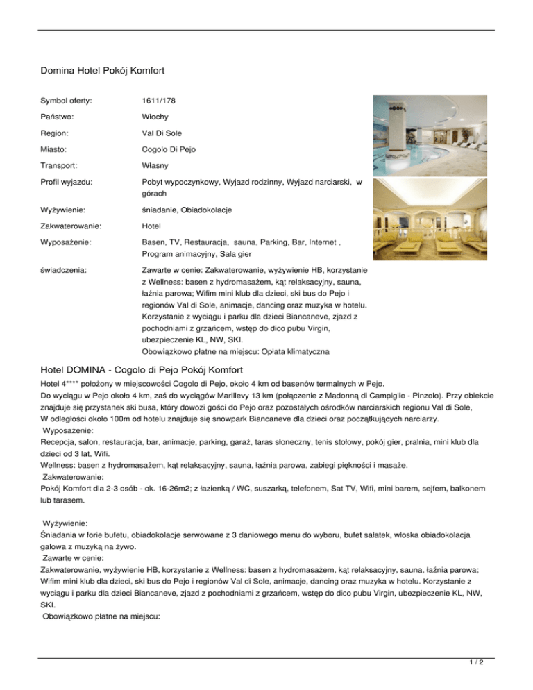 Domina Hotel Pokój Komfort Symbol oferty: 1611/178 Państwo: Włochy Region: Val Di Sole Miasto: Cogolo Di Pejo Transport: Własny Profil wyjazdu: Pobyt wypoczynkowy, Wyjazd rodzinny, Wyjazd narciarski, w Wyżywienie: śniadanie, Obiadokolacje Zakwaterowanie: Hotel Wyposażenie: Basen, TV, Restauracja, sauna, Parking, Bar, Internet , świadczenia: Zawarte w cenie: Zakwaterowanie, wyżywienie HB, korzystanie górach Program animacyjny, Sala gier z Wellness: basen z hydromasażem, kąt relaksacyjny, sauna, łaźnia parowa; Wifim mini klub dla dzieci, ski bus do Pejo i regionów Val di Sole, animacje, dancing oraz muzyka w hotelu. Korzystanie z wyciągu i parku dla dzieci Biancaneve, zjazd z pochodniami z grzańcem, wstęp do dico pubu Virgin, ubezpieczenie KL, NW, SKI. Obowiązkowo płatne na miejscu: Opłata klimatyczna Hotel DOMINA - Cogolo di Pejo Pokój Komfort Hotel 4**** położony w miejscowości Cogolo di Pejo, około 4 km od basenów termalnych w Pejo. Do wyciągu w Pejo około 4 km, zaś do wyciągów Marillevy 13 km (połączenie z Madonną di Campiglio - Pinzolo). Przy obiekcie znajduje się przystanek ski busa, który dowozi gości do Pejo oraz pozostałych ośrodków narciarskich regionu Val di Sole, W odległości około 100m od hotelu znajduje się snowpark Biancaneve dla dzieci oraz początkujących narciarzy. Wyposażenie: Recepcja, salon, restauracja, bar, animacje, parking, garaż, taras słoneczny, tenis stołowy, pokój gier, pralnia, mini klub dla dzieci od 3 lat, Wifi. Wellness: basen z hydromasażem, kąt relaksacyjny, sauna, łaźnia parowa, zabiegi piękności i masaże. Zakwaterowanie: Pokój Komfort dla 2-3 osób - ok. 16-26m2; z łazienką / WC, suszarką, telefonem, Sat TV, Wifi, mini barem, sejfem, balkonem lub tarasem. Wyżywienie: Śniadania w forie bufetu, obiadokolacje serwowane z 3 daniowego menu do wyboru, bufet sałatek, włoska obiadokolacja galowa z muzyką na żywo. Zawarte w cenie: Zakwaterowanie, wyżywienie HB, korzystanie z Wellness: basen z hydromasażem, kąt relaksacyjny, sauna, łaźnia parowa; Wifim mini klub dla dzieci, ski bus do Pejo i regionów Val di Sole, animacje, dancing oraz muzyka w hotelu. Korzystanie z wyciągu i parku dla dzieci Biancaneve, zjazd z pochodniami z grzańcem, wstęp do dico pubu Virgin, ubezpieczenie KL, NW, SKI. Obowiązkowo płatne na miejscu: 1/2 Opłata klimatyczna Opcjonalnie płatne na miejscu: Garaż (ograniczona ilość) - 5 EUR za dzień Zniżki dla dzieci przy 2 osobach pełnopłatnych: 0-1,99 lat - 100%. 2-3,99 lat - 70%. 4-8,99 lat - 50%. 9-14,99 lat - 30%. od 15 lat jako 3 os. w pokoju - 10% TERMINY: od: 2017-03-04 do: 2017-03-11 (8 dni), miejsca: zamów cena od: 2064 PLN = 498 EUR od: 2017-03-11 do: 2017-03-18 (8 dni), miejsca: zamów cena od: 2064 PLN = 498 EUR od: 2017-03-18 do: 2017-03-25 (8 dni), miejsca: zamów cena od: 1877 PLN = 453 EUR od: 2017-03-25 do: 2017-04-01 (8 dni), miejsca: zamów cena od: 1877 PLN = 453 EUR od: 2017-04-01 do: 2017-04-08 (8 dni), miejsca: zamów cena od: 1877 PLN = 453 EUR CENNIK: Długość pobytu: 8 dni 8 dni Grupa cenowa: A B 14 14 2.5 2.5 Ubezpieczenie (obligatoryjne) (*) Ubezpieczenie KL, NW, SKI (*) Turystyczny Fundusz Gwarancyjny Pobyt w obiekcie (do wyboru) (*) Pokój Komfort standardowo dla osób: 3 minimalnie: 2 (-) Rodzaj osoby (do wyboru) Dziecko 2-3 (*) Osoba dorosła Dziecko 4-8 Dziecko 0-1 3 osoba na dostawce Dziecko 9-14 (-) 132 145 439 484 220 242 (-) (-) 395 436 307 339 Waluta: EUR Aktualne ceny z systemu S.A.R.T. (-) - cena usługi, podatku kalkulowana przy osobie lub gratis (*) - kwota wliczona w cenę standardową 2/2