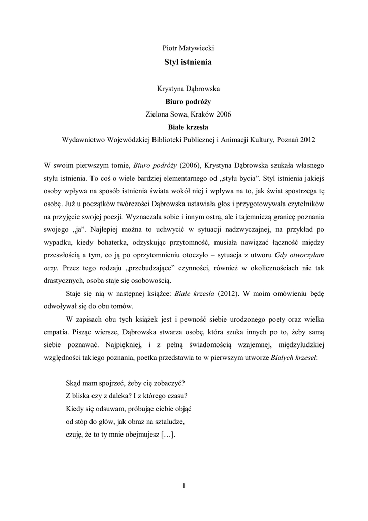 Piotr Matywiecki Styl istnienia Krystyna Dąbrowska Biuro podróży Zielona Sowa, Kraków 2006 Białe krzesła Wydawnictwo Wojewódzkiej Biblioteki Publicznej i Animacji Kultury, Poznań 2012 W swoim pierwszym tomie, Biuro podróży (2006), Krystyna Dąbrowska szukała własnego stylu istnienia. To coś o wiele bardziej elementarnego od „stylu bycia”. Styl istnienia jakiejś osoby wpływa na sposób istnienia świata wokół niej i wpływa na to, jak świat spostrzega tę osobę. Już u początków twórczości Dąbrowska ustawiała głos i przygotowywała czytelników na przyjęcie swojej poezji. Wyznaczała sobie i innym ostrą, ale i tajemniczą granicę poznania swojego „ja”. Najlepiej można to uchwycić w sytuacji nadzwyczajnej, na przykład po wypadku, kiedy bohaterka, odzyskując przytomność, musiała nawiązać łączność między przeszłością a tym, co ją po oprzytomnieniu otoczyło – sytuacja z utworu Gdy otworzyłam oczy. Przez tego rodzaju „przebudzające” czynności, również w okolicznościach nie tak drastycznych, osoba staje się osobowością. Staje się nią w następnej książce: Białe krzesła (2012). W moim omówieniu będę odwoływał się do obu tomów. W zapisach obu tych książek jest i pewność siebie urodzonego poety oraz wielka empatia. Pisząc wiersze, Dąbrowska stwarza osobę, która szuka innych po to, żeby samą siebie poznawać. Najpiękniej, i z pełną świadomością wzajemnej, międzyludzkiej względności takiego poznania, poetka przedstawia to w pierwszym utworze Białych krzeseł: Skąd mam spojrzeć, żeby cię zobaczyć? Z bliska czy z daleka? I z którego czasu? Kiedy się odsuwam, próbując ciebie objąć od stóp do głów, jak obraz na sztaludze, czuję, że to ty mnie obejmujesz […]. 1 Osoba mówiąca w tych wierszach wyznacza sobie zadanie najprostsze i najtrudniejsze: poddając się życiowemu przypadkowi, pojawić się w jakimkolwiek miejscu i uczynić je centrum świata. Tak się umiejscowić, żeby był to dom bytowania, ale też żeby nie znikł niepokój przypadkowego zaistnienia. Dobra literatura darzy nas takim egzystencjalnym szczęściem w samym środku bezdroża, na egzystencjalnym wygnaniu. To dar wrodzony: umiejętność znalezienia się i zagubienia w miejscu, w którym się przebywa. Poeta tak obdarowany ma jeden obowiązek: utrzymać swoją wypowiedź w takiej równowadze i czystości, żeby zadomowienie nie zagłuszyło niepokoju, i żeby niepokój nie wypłoszył go z miejsca, które sobie wybrał, które go wybrało. Słowa mają być jak ta miotła na podwórzu z jednego z wierszy, miotła, która wydaje uspokajający odgłos, ale „podcina dom jak kosa/ wygarnia spode mnie wszystkie piętra”. Za tą liryką, jak za fotograficznym aparatem, ukrywa się oko gotowe na niespodziankę i na rzeczywistość. Niespodziankę, która zbija rzeczywistość z tropu i rzeczywistość, która naprowadza oko z powrotem na przedmiot jego widzenia. Dobry fotograf nie wie, na co czeka jego obiektyw. Nie wiedząc tego, w mgnieniu oka zauważa owo długo oczekiwane zdarzenie. Dopiero kiedy powiedzie się i to długie oczekiwanie i ta momentalność, może być świadom tego, co zobaczył i upewnić się, że myślenie zadomawia się w sytuacji, którą sfotografował. Widzenie i refleksja są jednym i tym samym. A kiedy, jak powiadał wielki fotograf Henri Cartier-Bresson, „na jednej linii celu znajdą się głowa, oko i serce”, powstają wówczas tak wierne portrety jak te modeli z wiersza „Pozowali za marne pieniądze czy nieco zwariowanej „słowiańskiej baby” (wiersz pt. Pomponiasta czapa śmiech słowiańskiej baby). Jak to może się udać? – Dzięki specjalnemu poczuciu rzeczywistości. Rzeczywistość takich poetów rzadko ucieka w symbolizacje. I nie lubi martwych natur. Jeśli już zdecyduje się na alegorię, jak w wierszu Tego dnia nie starczyło piasku, tworzy obraz, który karmi mit rzeczywistością, a rzeczywistość sensem. Ale najchętniej rzeczywistość Krystyny Dąbrowskiej mieści się w opisach. Człowiek tej poezji to istota opisująca. Jego duszą jest dążenie ku opisowi i sama psychiczna czynność opisywania – nie tylko na kartce papieru, również w sobie samym. Istnieje coś, co nazwać można „atomem opisu”. To jest wyczucie trafności. Nic nie uratuje nawet najbardziej elokwentnego wiersza, jeśli nie ma w nim przejmująco trafnych nazw świata. Nie wiedzą o tym tylko ci poeci, którym nigdy taka odkrywcza rewelacja nie była dana. Oto takie trafne nazwy świata: 2 O chłopcu świętującym bar micwę powiada Dąbrowska: „Gdy Tora leży przed nim odsłonięta/ i otwierają się jej ramiona,/ a on czyta z niej pierwszy raz – jest już mężczyzną”. Albo w wierszu Henry Moore, w którym poetka daje opis dwóch rzeźb: Znalazł korzeń wyrzucony przez fale i zobaczył w nim matkę i dziecko […] Ono wspina się jak młoda foka na jej brzuch, szeroki i słoneczny. Znalazł korzeń wyrzucony przez fale i zobaczył w nim ciało wojownika […] głowa zaraz uderzy o ziemię obok ciemna jak przerębel tarcza. Znalazł kamień wyrzucony przez fale z wydrążonym na wylot otworem, schował się w nim drugi, mniejszy kamyk, jak ziarenko w mocnych objęciach, ukryte w skale, świdrujące oko wojownika, pępek niemowlęcia. W jednym opisie jednej rzeźby cała etyczna budowa świata. Kamień narodzin i kamień śmierci. Inny walor opisów w tej poezji: każda wypatrzona w świecie rzecz, sprawa, zdarzenie nie jest pozostawione samemu sobie, izolowane, nie jest też symbolem albo alegorią – jest milcząco porównywane z całym światem. To cały świat – prawie milcząco sugerowany – z właściwą sobie wszechstronnością szacuje rzecz, sprawę, zdarzenie, człowieka. Jak Sprzedawczyni mioteł: „Wokół wiruje bazar / na osiach / jej nieobecnych oczu”. Opis jest żywym, osobnym jestestwem, świadomością. Opis ma własną wolę, wybiera so bie to