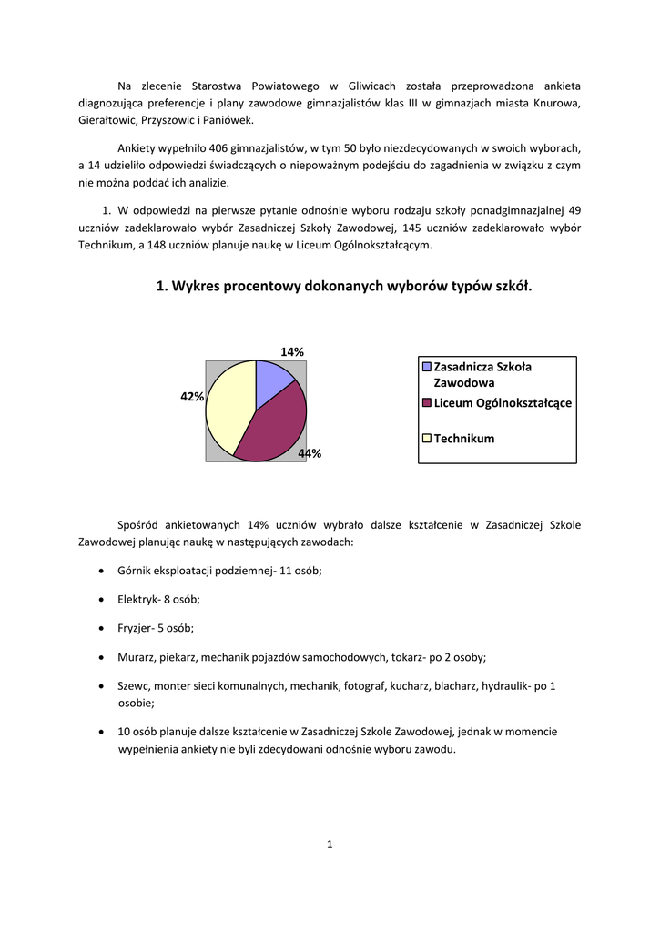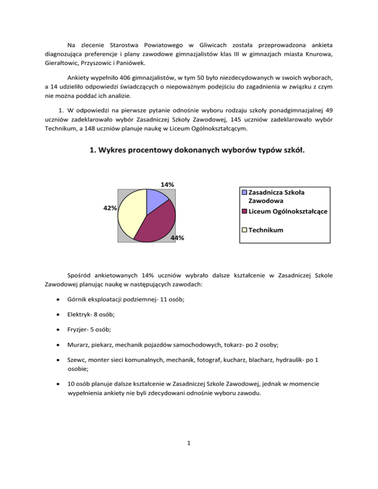 Na zlecenie Starostwa Powiatowego w Gliwicach została przeprowadzona ankieta diagnozująca preferencje i plany zawodowe gimnazjalistów klas III w gimnazjach miasta Knurowa, Gierałtowic, Przyszowic i Paniówek. Ankiety wypełniło 406 gimnazjalistów, w tym 50 było niezdecydowanych w swoich wyborach, a 14 udzieliło odpowiedzi świadczących o niepoważnym podejściu do zagadnienia w związku z czym nie można poddad ich analizie. 1. W odpowiedzi na pierwsze pytanie odnośnie wyboru rodzaju szkoły ponadgimnazjalnej 49 uczniów zadeklarowało wybór Zasadniczej Szkoły Zawodowej, 145 uczniów zadeklarowało wybór Technikum, a 148 uczniów planuje naukę w Liceum Ogólnokształcącym. 1. Wykres procentowy dokonanych wyborów typów szkół. 14% Zasadnicza Szkoła Zawodowa 42% Liceum Ogólnokształcące Technikum 44% Spośród ankietowanych 14% uczniów wybrało dalsze kształcenie w Zasadniczej Szkole Zawodowej planując naukę w następujących zawodach: Górnik eksploatacji podziemnej- 11 osób; Elektryk- 8 osób; Fryzjer- 5 osób; Murarz, piekarz, mechanik pojazdów samochodowych, tokarz- po 2 osoby; Szewc, monter sieci komunalnych, mechanik, fotograf, kucharz, blacharz, hydraulik- po 1 osobie; 10 osób planuje dalsze kształcenie w Zasadniczej Szkole Zawodowej, jednak w momencie wypełnienia ankiety nie byli zdecydowani odnośnie wyboru zawodu. 1 Spośród ankietowanych 42% uczniów wybrało dalsze kształcenie w Technikum planując naukę w następujących zawodach: Technik informatyk- 19 osób; Technik górnik- 16 osób; Technik elektryk- 15 osób; Technik żywienia i usług gastronomicznych- 15 osób; Technik mechanik monter maszyn i urządzeo- 13 osób; Technik ekonomista- 9 osób; Technik budownictwa- 6 osób; Technik mechanik pojazdów samochodowych- 4 osoby; Technik hotelarstwa- 4 osoby; Technik analityk- 4 osoby; Technik elektromechanik - 3 osoby; Technik obsługi turystycznej- 3 osoby; Technik mechanik lotnictwa, technik ochrony środowiska, technik handlowiec, technik organizacji reklamy- po 2 osoby; Technik fryzjer, technik logistyk - po 1 osobie; 24 osoby planują dalsze kształcenie w Technikum, jednak w momencie wypełnienia ankiety nie byli zdecydowani odnośnie wyboru zawodu. Spośród ankietowanych 44% uczniów wybrało dalsze kształcenie w Liceum Ogólnokształcącym planując naukę w następujących profilach: Przyrodniczy- 39 osób; Humanistyczny- 30 osób; Matematyczno-fizyczny- 26 osób; Mundurowy- 16 osób; Językowy- 11 osób; Sportowy- 9 osób; 2 Artystyczny- 5 osób; 2 osoby chcą kształcid się w konkretnych ściśle ukierunkowanych szkołach tj. Liceum Teatralne w Krakowie i Liceum Plastyczne w Zabrzu; 10 osób planuje dalsze kształcenie w Liceum Ogólnokształcącym, jednak w momencie wypełnienia ankiety nie byli zdecydowani odnośnie wyboru profilu. 2. W odpowiedzi na drugie pytanie odnośnie miejscowości w której planują dalsze kształcenie uczniowie najczęściej wybierali Knurów (161 osób), Gliwice (141 osób) i w dalszej kolejności Czerwionka-Leszczyny (13 osób), Ornontowice (7 osób) i inne (20 osób). 2. Wykres procentowy wyborów miejscowości w której uczniowie planują dalsze kształcenie. 2% 6% 4% Knurów Gliwice 47% Czerwionka-Leszczyny Ornontowice Inne 41% Uczniowie, którzy wybrali dalsze kształcenie w Knurowie (47%) podjęli taką decyzję z następujących powodów: Niewielka odległośd szkoły od miejsca zamieszkania- 130 osób; Szkoła oferuje interesujący dla ucznia kierunek kształcenia- 17 osób; Dobra opinia o szkole- 12 osób. Uczniowie, którzy wybrali dalsze kształcenie w Gliwicach (41%) podjęli taką decyzję z następujących powodów: Niewielka odległośd szkoły od miejsca zamieszkania- 33 osób; Szkoła oferuje interesujący dla ucznia kierunek kształcenia- 46 osób; Dobra opinia o szkole- 39 osób. 3 Uczniowie, którzy wybierali pozostałe miejscowości: Czerwionka-Leszczyny (4%), Ornontowice (2%) i inne (6%), podjęli taką decyzję z następujących powodów: Niewielka odległośd szkoły od miejsca zamieszkania- 12 osób; Szkoła oferuje interesujący dla ucznia kierunek kształcenia- 11 osób; Dobra opinia o szkole- 8 osób. Niektórzy uczniowie w uzasadnieniu swojego wyboru podawali więcej niż jeden powód np. niewielka odległośd od szkoły i interesujący kierunek. Poza wyżej wymienionymi powodami pojawiały się także: możliwośd poznania nowych osób, wybór szkoły ze względu na to, że wybiera ją również kolega, względy rodzinne, gwarancja pracy po zdobyciu danego zawodu. 3. Wykres prezentujący motywację wyboru szkoły w poszczególnych miejscowościach. 140 120 100 Gliwice 80 Knurów 60 Pozostałe miejscowości 40 20 0 Niewielka Szkoła oferuje odległośd szkoły interesujący od miejsca kierunek dla zamieszkania ucznia Dobra opinia o szkole 3. Uczniowie uzasadniając swoją decyzję wyboru danej szkoły ponadgimnazjalnej podawali następujące powody: Szkoła oferuje zawód którym uczeo jest zainteresowany- 253 uczniów; 4 Szkoła znajduje się blisko miejsca zamieszkania ucznia- 113 uczniów; Wybiera się do tej szkoły kolega/koleżanka- 52 uczniów; Do wyboru szkoły zachęcili ucznia starsi koledzy/koleżanki, uczniowie tej szkoły54 uczniów; Inne powody (powody rodzinne, gwarancja pracy, dobra opinia o szkole)- 24 uczniów. 4. Wykres procentowy prezentujący powody wyboru danej szkoły ponadgimnazjalnej. 11% Szkoła oferuje zawód którym uczeo jest zainteresowany 5% Szkoła znajduje się blisko miejsca zamieszkania ucznia 10% 51% Wybiera się do tej szkoły kolega/koleżanka Do wyboru szkoły zachęcili ucznia starsi koledzy/koleżanki, uczniowie tej szkoły 23% Inne powody 4. Podsumowanie Analiza powyższych danych nasuwa spostrzeżenie iż przeważająca liczba gimnazjalistów wybiera kształcenie na poziomie średnim (Liceum Ogólnokształcące i Technikum), a tylko około 1/6 spośród ankietowanych uczniów planuje kształcenie na poziomie zawodowym. 5 Młodzież