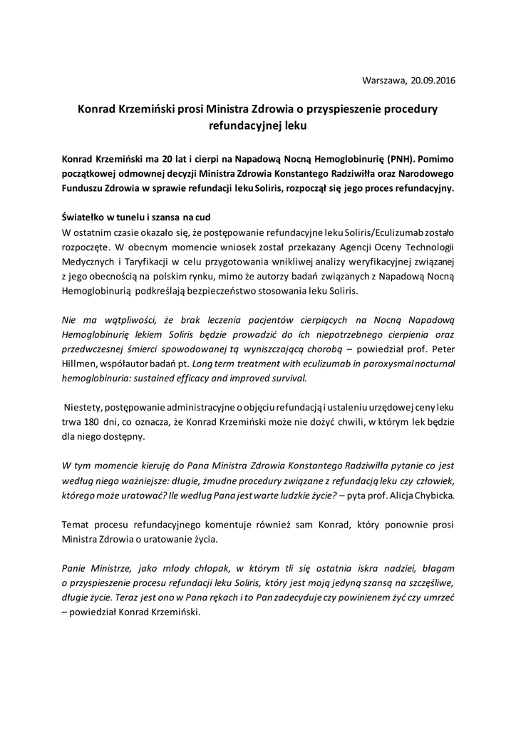 Warszawa, 20.09.2016 Konrad Krzemiński prosi Ministra Zdrowia o przyspieszenie procedury refundacyjnej leku Konrad Krzemiński ma 20 lat i cierpi na Napadową Nocną Hemoglobinurię (PNH). Pomimo początkowej odmownej decyzji Ministra Zdrowia Konstantego Radziwiłła oraz Narodowego Funduszu Zdrowia w sprawie refundacji leku Soliris, rozpoczął się jego proces refundacyjny. Światełko w tunelu i szansa na cud W ostatnim czasie okazało się, że postępowanie refundacyjne leku Soliris/Eculizumab zostało rozpoczęte. W obecnym momencie wniosek został przekazany Agencji Oceny Technologii Medycznych i Taryfikacji w celu przygotowania wnikliwej analizy weryfikacyjnej związanej z jego obecnością na polskim rynku, mimo że autorzy badań związanych z Napadową Nocną Hemoglobinurią podkreślają bezpieczeństwo stosowania leku Soliris. Nie ma wątpliwości, że brak leczenia pacjentów cierpiących na Nocną Napadową Hemoglobinurię lekiem Soliris będzie prowadzić do ich niepotrzebnego cierpienia oraz przedwczesnej śmierci spowodowanej tą wyniszczającą chorobą – powiedział prof. Peter Hillmen, współautor badań pt. Long term treatment with eculizumab in paroxysmal nocturnal hemoglobinuria: sustained efficacy and improved survival. Niestety, postępowanie administracyjne o objęciu refundacją i ustaleniu urzędowej ceny leku trwa 180 dni, co oznacza, że Konrad Krzemiński może nie dożyć chwili, w którym lek będzie dla niego dostępny. W tym momencie kieruję do Pana Ministra Zdrowia Konstantego Radziwiłła pytanie co jest według niego ważniejsze: długie, żmudne procedury związane z refundacją leku czy człowiek, którego może uratować? Ile według Pana jest warte ludzkie życie? – pyta prof. Alicja Chybicka. Temat procesu refundacyjnego komentuje również sam Konrad, który ponownie prosi Ministra Zdrowia o uratowanie życia. Panie Ministrze, jako młody chłopak, w którym tli się ostatnia iskra nadziei, błagam o przyspieszenie procesu refundacji leku Soliris, który jest moją jedyną szansą na szczęśliwe, długie życie. Teraz jest ono w Pana rękach i to Pan zadecyduje czy powinienem żyć czy umrzeć – powiedział Konrad Krzemiński. Trudne początki leczenia Chociaż chorobę Konrada zdiagnozowano zaledwie w drugiej połowie zeszłego roku, chłopak ma za sobą wielotygodniowe pobyty w szpitalu. Jego sytuacja znacznie się poprawiła po podaniu czterech ampułek leku Soliris/Eculizumab, które zakupił dla niego Szpital Wojewódzki w Szczecinie, jednak Narodowy Fundusz Zdrowia odmówił dalszego finansowania. Po odstawieniu leku stan zdrowia chłopaka drastycznie się pogorszył, co skutkowało drugim już przeszczepem wątroby (pierwszy przeszczep spowodowany był zakrzepicą żył wątrobowych). Ta niezrozumiała, tragiczna w skutkach decyzja o nieprzyznaniu Konradowi leku sprawiła, że przykuty do szpitalnego łóżka mógł liczyć jedynie na cud. Wsparcie z całego świata Za sprawą ludzi chcących pomóc Konradowi, informacje o jego losie dotarły aż do Kanady, gdzie sytuacją chłopaka zainteresowało się Canadian Association of PNH Patients. Prezes Stowarzyszenia postanowił napisać otwarty list do Ministra Zdrowia Konstantego Radziwiłła z prośbą o ratowanie jego życia. […]W obliczu tej sytuacji nasuwa mi się pytanie czy ktokolwiek z Państwa chciałby znaleźć się w pozycji, kiedy będzie trzeba wyjaśnić obywatelom ogromną tragedię z powodu biurokracji i kosztów akurat wtedy, kiedy życie ludzkie mogło zostać uratowane, zwłaszcza gdy skuteczność terapii jest udowodniona?[…]. – napisał Barry Katsof, Prezes Canadian Association of PNH Patients. Więcej informacji: Weronika Kendra Cohn & Wolfe [email protected] 609 850 222