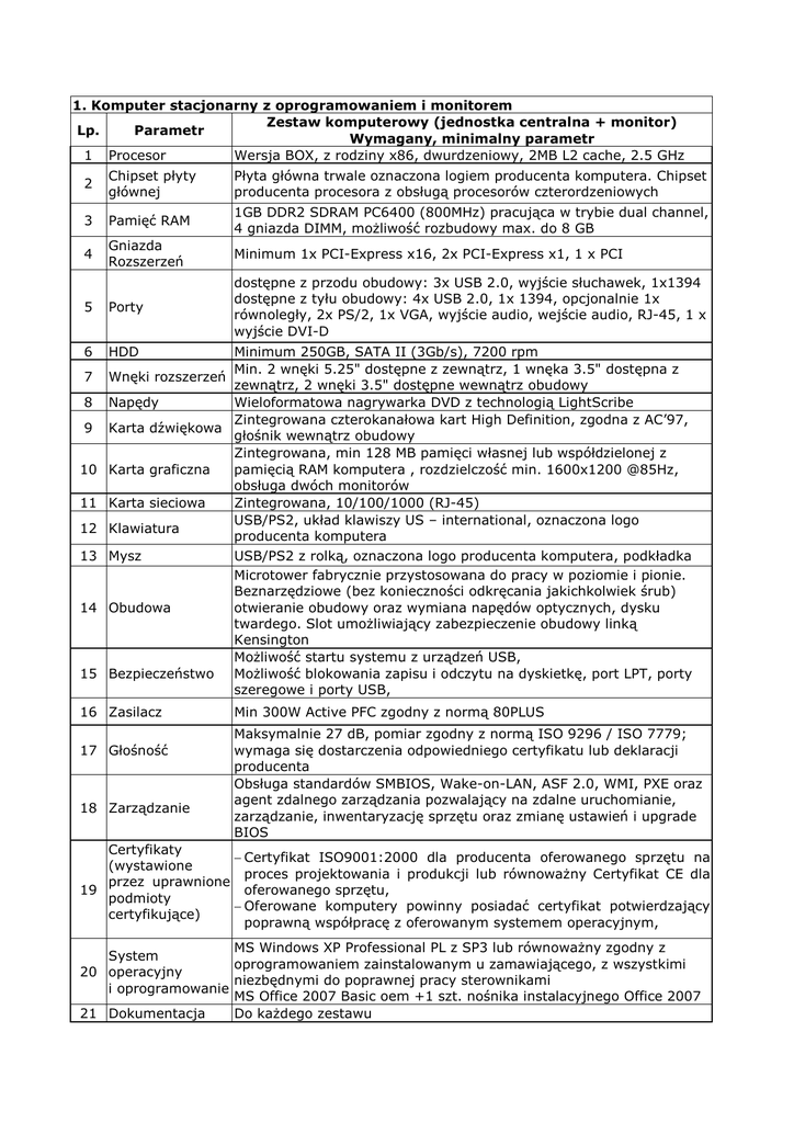 1. Komputer stacjonarny z oprogramowaniem i monitorem Zestaw komputerowy (jednostka centralna + monitor) Lp. Parametr Wymagany, minimalny parametr 1 Procesor Wersja BOX, z rodziny x86, dwurdzeniowy, 2MB L2 cache, 2.5 GHz 2 Chipset płyty głównej Płyta główna trwale oznaczona logiem producenta komputera. Chipset producenta procesora z obsługą procesorów czterordzeniowych 3 Pamięć RAM 1GB DDR2 SDRAM PC6400 (800MHz) pracująca w trybie dual channel, 4 gniazda DIMM, moŜliwość rozbudowy max. do 8 GB 4 Gniazda Rozszerzeń Minimum 1x PCI-Express x16, 2x PCI-Express x1, 1 x PCI 5 Porty dostępne z przodu obudowy: 3x USB 2.0, wyjście słuchawek, 1x1394 dostępne z tyłu obudowy: 4x USB 2.0, 1x 1394, opcjonalnie 1x równoległy, 2x PS/2, 1x VGA, wyjście audio, wejście audio, RJ-45, 1 x wyjście DVI-D 6 HDD Minimum 250GB, SATA II (3Gb/s), 7200 rpm Min. 2 wnęki 5.25" dostępne z zewnątrz, 1 wnęka 3.5" dostępna z 7 Wnęki rozszerzeń zewnątrz, 2 wnęki 3.5" dostępne wewnątrz obudowy 8 Napędy Wieloformatowa nagrywarka DVD z technologią LightScribe Zintegrowana czterokanałowa kart High Definition, zgodna z AC’97, 9 Karta dźwiękowa głośnik wewnątrz obudowy Zintegrowana, min 128 MB pamięci własnej lub współdzielonej z 10 Karta graficzna pamięcią RAM komputera , rozdzielczość min. 1600x1200 @85Hz, obsługa dwóch monitorów 11 Karta sieciowa Zintegrowana, 10/100/1000 (RJ-45) USB/PS2, układ klawiszy US – international, oznaczona logo 12 Klawiatura producenta komputera 13 Mysz USB/PS2 z rolką, oznaczona logo producenta komputera, podkładka Microtower fabrycznie przystosowana do pracy w poziomie i pionie. Beznarzędziowe (bez konieczności odkręcania jakichkolwiek śrub) 14 Obudowa otwieranie obudowy oraz wymiana napędów optycznych, dysku twardego. Slot umoŜliwiający zabezpieczenie obudowy linką Kensington MoŜliwość startu systemu z urządzeń USB, 15 Bezpieczeństwo MoŜliwość blokowania zapisu i odczytu na dyskietkę, port LPT, porty szeregowe i porty USB, 16 Zasilacz 17 Głośność 18 Zarządzanie Min 300W Active PFC zgodny z normą 80PLUS Maksymalnie 27 dB, pomiar zgodny z normą ISO 9296 / ISO 7779; wymaga się dostarczenia odpowiedniego certyfikatu lub deklaracji producenta Obsługa standardów SMBIOS, Wake-on-LAN, ASF 2.0, WMI, PXE oraz agent zdalnego zarządzania pozwalający na zdalne uruchomianie, zarządzanie, inwentaryzację sprzętu oraz zmianę ustawień i upgrade BIOS Certyfikaty − Certyfikat ISO9001:2000 dla producenta oferowanego sprzętu na (wystawione proces projektowania i produkcji lub równowaŜny Certyfikat CE dla przez uprawnione 19 oferowanego sprzętu, podmioty − Oferowane komputery powinny posiadać certyfikat potwierdzający certyfikujące) poprawną współpracę z oferowanym systemem operacyjnym, MS Windows XP Professional PL z SP3 lub równowaŜny zgodny z System oprogramowaniem zainstalowanym u zamawiającego, z wszystkimi 20 operacyjny niezbędnymi do poprawnej pracy sterownikami i oprogramowanie MS Office 2007 Basic oem +1 szt. nośnika instalacyjnego Office 2007 21 Dokumentacja Do kaŜdego zestawu techniczna 22 Gwarancja 36 miesięcy, realizowana przez autoryzowany Serwis producenta Monitor do zestawu komputerowego (oznaczony trwale logiem producenta komputera) 2. Specyfikacja techniczna monitora komputerowego. Matryca Aktywna TFT-TN Obszar widzialny [mm] 19 cali Plamka matrycy [mm] 0,285 mm Czas reakcji matrycy [ms] 5 ms Rozdzielczość 1440x900 Jasność [cd/m2] 300 cd/m2 Kontrast 1000:1 Częstotliwość pozioma [KHz] Częstotliwość pionowa [Hz] Kąt widzenia poziom 24-83 kHz 50-76 Hz 160 stopni Kąt widzenia pion 160 stopni Ilość kolorów [mln] 16,2 miliona Sterowanie Normy bezpieczeństwa Gniazda wejściowe Pobór mocy [W] Funkcja pivot OSD, regulacja ustawień monitora za pośrednictwem komputera poprzez dedykowane przez producenta oprogramowanie Wymagania zgodne z normą EN-ISO 13406-2 w zakresie ergonomii paneli LCD 15-pin D-Sub 37W brak MoŜliwość powieszenia na ścianie Zewnętrzne mocowanie VESA: standardowy układ 4 otworów, 100 mm Oprogramowanie Oprogramowanie producenta pozwalające zaprogramować tryb uśpienia oraz umoŜliwiające regulację ustawień wyświetlania za pomocą komputera i ochronę monitora przed kradzieŜą Kolor Opcje kontrolne w nawiązaniu do jednostki centralnej Jasność, kontrast, pozycja, temperatura kolorów, indywidualne ustawienia koloru , wybór wejścia, powrót do ustawień fabrycznych Oprogramowanie umoŜliwiające regulację ustawień monitora pozwalające uŜytkownikowi zaprogramować określony czas przejścia w tryb uśpienia, Gwarancja 36 miesięcy producenta 3. Drukarki laserowe Minimalne parametry techniczne drukarki: Technologia druku Rozdzielczość Szybkość druku ObciąŜenie miesięczne Rozmiar nośnika Pamięć standardowa Standardowe języki drukarki Druk dwustronny Standardowe połączenia Obsługiwane systemy operacyjne Opcje dodatkowe Gwarancja Laserowa 1200 x 1200 dpi 33 str/min 50 000 str./mies. A4, A5,A6,B5,B6,koperty 128 MB z moŜliwościa rozszerzenia PCL 6, PCL 5e, Postscript Level 3 emulacja z automatycznym przełączaniem języków Tak, automatyczny Port USB 2.0 , Fast Ethernet 10/100/1000 print server Windows 2000, Windows XP Home , Windows XP Prof., Windows 2003 Server, Vista , Linux Kabel drukarkowy USB 2.0 3m, patchcord kat 5e 3m 12 miesięcy 4. Drukarki atramentowe Minimalne parametry techniczne drukarki: Technologia druku Rozdzielczość Szybkość druku Szybkość druku Rozmiar nośnika Pamięć standardowa Druk dwustronny Standardowe połączenia Obsługiwane systemy operacyjne Opcje dodatkowe Gwarancja Atramentowa 1200 x 1200 dpi 25 str/min w czerni 20 str/min dla koloru A3, A4, A5,A6,B5,B6,koperty 32 MB Ręczny Port USB 2.0 Windows 2000, Windows XP Home , Windows XP Prof., Windows 2003 Server, Vista , Linux Kabel drukarkowy USB 2.0 3m, 12 miesięcy 5. Urządzenie wielofunkcyjne Minimalne parametry techniczne drukarki: Funkcja 