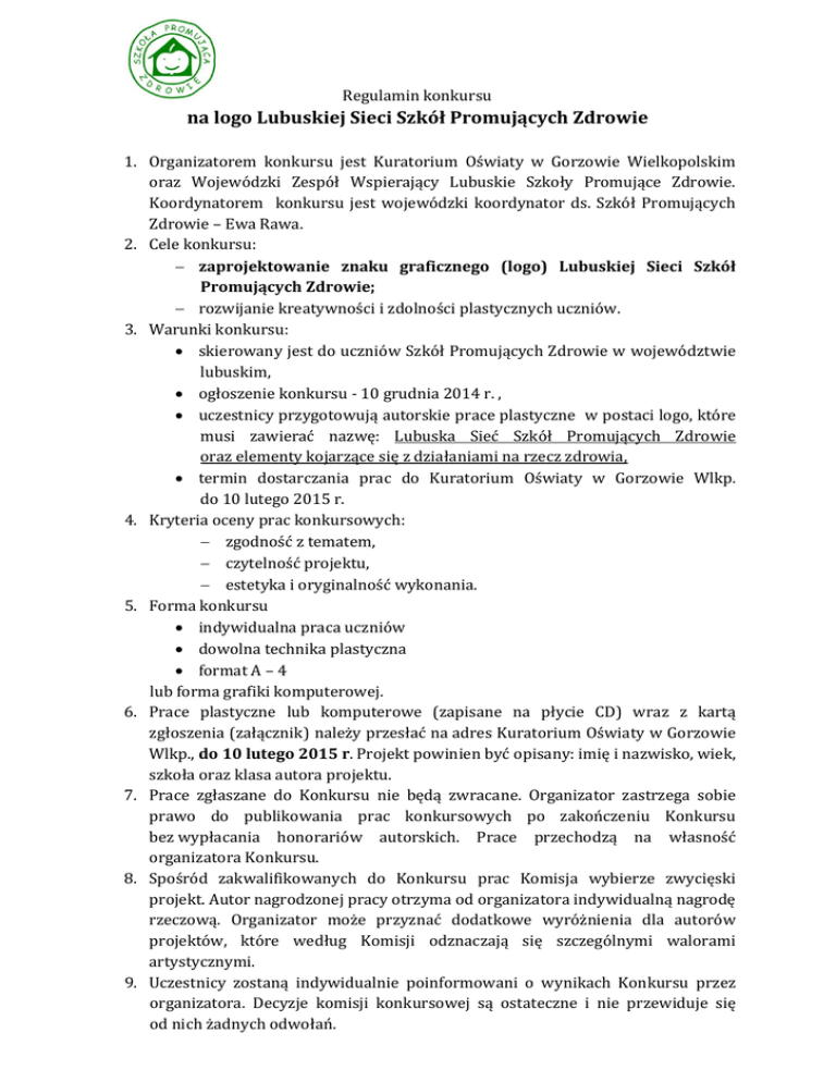 Regulamin konkursu na logo Lubuskiej Sieci Szkół Promujących Zdrowie 1. Organizatorem konkursu jest Kuratorium Oświaty w Gorzowie Wielkopolskim oraz Wojewódzki Zespół Wspierający Lubuskie Szkoły Promujące Zdrowie. Koordynatorem konkursu jest wojewódzki koordynator ds. Szkół Promujących Zdrowie – Ewa Rawa. 2. Cele konkursu: zaprojektowanie znaku graficznego (logo) Lubuskiej Sieci Szkół Promujących Zdrowie; rozwijanie kreatywności i zdolności plastycznych uczniów. 3. Warunki konkursu: skierowany jest do uczniów Szkół Promujących Zdrowie w województwie lubuskim, ogłoszenie konkursu - 10 grudnia 2014 r. , uczestnicy przygotowują autorskie prace plastyczne w postaci logo, które musi zawierać nazwę: Lubuska Sieć Szkół Promujących Zdrowie oraz elementy kojarzące się z działaniami na rzecz zdrowia, termin dostarczania prac do Kuratorium Oświaty w Gorzowie Wlkp. do 10 lutego 2015 r. 4. Kryteria oceny prac konkursowych: zgodność z tematem, czytelność projektu, estetyka i oryginalność wykonania. 5. Forma konkursu indywidualna praca uczniów dowolna technika plastyczna format A – 4 lub forma grafiki komputerowej. 6. Prace plastyczne lub komputerowe (zapisane na płycie CD) wraz z kartą zgłoszenia (załącznik) należy przesłać na adres Kuratorium Oświaty w Gorzowie Wlkp., do 10 lutego 2015 r. Projekt powinien być opisany: imię i nazwisko, wiek, szkoła oraz klasa autora projektu. 7. Prace zgłaszane do Konkursu nie będą zwracane. Organizator zastrzega sobie prawo do publikowania prac konkursowych po zakończeniu Konkursu bez wypłacania honorariów autorskich. Prace przechodzą na własność organizatora Konkursu. 8. Spośród zakwalifikowanych do Konkursu prac Komisja wybierze zwycięski projekt. Autor nagrodzonej pracy otrzyma od organizatora indywidualną nagrodę rzeczową. Organizator może przyznać dodatkowe wyróżnienia dla autorów projektów, które według Komisji odznaczają się szczególnymi walorami artystycznymi. 9. Uczestnicy zostaną indywidualnie poinformowani o wynikach Konkursu przez organizatora. Decyzje komisji konkursowej są ostateczne i nie przewiduje się od nich żadnych odwołań. 10. Uczestnicy konkursu wyrażają zgodę na przetwarzanie ich danych osobowych i udostępnianie wizerunku w rozumieniu ustawy z dnia 29 sierpnia 1997 r. o ochronie danych osobowych (Dz. U. z 2002r., Nr 101, poz. 926 ze zm.) przez organizatora w celach związanych z przeprowadzeniem konkursu, w szczególności wyłanianiem zwycięzców konkursu i przyznaniem nagród, wydawaniem, odbiorem i rozliczaniem nagród. 11. Wzięcie udziału w konkursie jest jednoznaczne z wyrażeniem zgody w przypadku uczniów - przez ich rodziców na przetwarzanie danych osobowych w ramach obowiązujących przepisów o ochronie danych osobowych w zakresie niezbędnym do należytego przeprowadzenia konkursu i jego promocji. Dodatkowa informacja, którą należy przekazać młodszym uczniom podczas ogłaszania konkursu: Co to jest „logo”? LOGO to znak graficzny spełniający rolę informacyjną poprzez skrótowe, ale łatwo zauważalne i łatwo zapamiętywane przedstawienie symbolu instytucji lub organizacji. LOGO musi być przede wszystkim czytelne, dlatego powinno mieć niezbyt skomplikowane kształty oraz niewielką liczbę kolorów. Według różnych źródeł logo może składać się z samego symbolu graficznego (godła), symbolu i nazwy lub samej nazwy. Koordynator konkursu: Ewa Rawa – Kuratorium Oświaty, ul. Jagiellończyka 10, 66-400 Gorzów Wlkp., tel. 95 7255030, e-mail: [email protected] Załącznik: Karta zgłoszenia do konkursu na logo Lubuskiej Sieci Szkół Promujących Zdrowie 1. 2. 3. 4. Imię i nazwisko uczestnika: Wiek: Szkoła/klasa: Adres szkoły: 5. Opiekun pracy konkursowej: 6. Wyrażam zgodę na przetwarzanie moich danych osobowych zawartych w karcie zgłoszenia na potrzeby bazy danych konkursu. ………………………. Podpis uczestnika ……………………………………….. Podpis opiekuna/nauczyciela ……………………………. Podpis rodzica