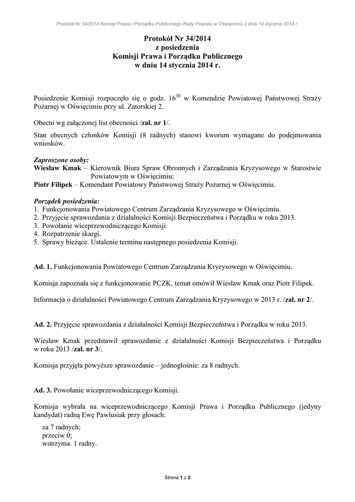 Protokół Nr 34/2014 Komisji Prawa i Porządku Publicznego Rady Powiatu w Oświęcimiu z dnia 14 stycznia 2014 r. Protokół Nr 34/2014 z posiedzenia Komisji Prawa i Porządku Publicznego w dniu 14 stycznia 2014 r. Posiedzenie Komisji rozpoczęło się o godz. 1630 w Komendzie Powiatowej Państwowej Straży Pożarnej w Oświęcimiu przy ul. Zatorskiej 2. Obecni wg załączonej list obecności /zał. nr 1/. Stan obecnych członków Komisji (8 radnych) stanowi kworum wymagane do podejmowania wniosków. Zaproszone osoby: Wiesław Kmak – Kierownik Biura Spraw Obronnych i Zarządzania Kryzysowego w Starostwie Powiatowym w Oświęcimiu; Piotr Filipek – Komendant Powiatowy Państwowej Straży Pożarnej w Oświęcimiu. Porządek posiedzenia: 1. Funkcjonowania Powiatowego Centrum Zarządzania Kryzysowego w Oświęcimiu. 2. Przyjęcie sprawozdania z działalności Komisji Bezpieczeństwa i Porządku w roku 2013. 3. Powołanie wiceprzewodniczącego Komisji. 4. Rozpatrzenie skargi. 5. Sprawy bieżące. Ustalenie terminu następnego posiedzenia Komisji. Ad. 1. Funkcjonowania Powiatowego Centrum Zarządzania Kryzysowego w Oświęcimiu. Komisja zapoznała się z funkcjonowanie PCZK, temat omówił Wiesław Kmak oraz Piotr Filipek. Informacja o działalności Powiatowego Centrum Zarządzania Kryzysowego w 2013 r. /zał. nr 2/. Ad. 2. Przyjęcie sprawozdania z działalności Komisji Bezpieczeństwa i Porządku w roku 2013. Wiesław Kmak przedstawił sprawozdanie z działalności Komisji Bezpieczeństwa i Porządku w roku 2013 /zał. nr 3/. Komisja przyjęła powyższe sprawozdanie – jednogłośnie: za 8 radnych. Ad. 3. Powołanie wiceprzewodniczącego Komisji. Komisja wybrała na wiceprzewodniczącego Komisji Prawa i Porządku Publicznego (jedyny kandydat) radną Ewę Pawlusiak przy głosach: za 7 radnych; przeciw 0; wstrzyma. 1 radny. Strona 1 z 2 Protokół Nr 34/2014 Komisji Prawa i Porządku Publicznego Rady Powiatu w Oświęcimiu z dnia 14 stycznia 2014 r. Ad. 4. Rozpatrzenie skargi. Dot. skargi złożonej przez Panx xxxxxxxxxx xxxxxxxxxx na działalność Pana Mariusza Tworusa – Dyrektora Centrum Kształcenia Praktycznego w Oświęcimiu, skierowanej do Komisji Prawa i Porządku Publicznego, celem rozpatrzenia i przygotowania dla Rady Powiatu propozycji rozstrzygnięcia /zał. nr 4/. W celu zbadania zasadności skargi, Komisja Prawa i Porządku Publicznego przeprowadziła postępowanie wyjaśniające: przeanalizowała materiały dotyczące sprawy. Komisja uznała skargę za bezzasadną – jednogłośnie: za 8 radnych. • Projekt uchwały w sprawie rozpatrzenia skargi na działalność Dyrektora Centrum Kształcenia Praktycznego w Oświęcimiu /zał. nr 5/. Ad. 5. Sprawy bieżące. Ustalenie terminu następnego posiedzenia Komisji. Przewodniczący Rady Powiatu skierował do Komisji list otwarty od Pana xxxxxxxxxx xxxxxxxxxx dot. herbu Powiatu Oświęcimskiego, z prośbą o zapoznanie się Komisji i zajęcie ewentualnego stanowiska /zał. nr 6/. Maciej Hejnowicz Ze względu na to, że obszar który był objęty nazwą Księstwo Oświęcimsko – Zatorskie zupełnie nie pasuje do Powiatu Oświęcimskiego. Nie nawiązuje do tradycji Księstwa Zatorsko – Oświęcimskiego, tylko do jakiejś nowej jednostki, której centrum jest Oświęcim. Czy zastosujemy w herbie orła, który był używany 500, czy 1.000 lat temu, jest kwestią wyboru. Skoro poprzednia Rada Powiatu dokonała takiego wyboru, to nie ma sensu przywiązywać zbyt dużej wagi i prowadzenia sporu w sytuacji, gdzie jest to tylko symbol. Symbol jest już w jakimś sposób utrwalony i wycofanie go byłoby zupełnie nie na miejscu. Przypisywanie orłowi czarnemu związku wyłącznie z Prusami jest błędne, gdyż orzeł Rosji Carskiej jest też czarny, jak również w herbie Wiednia. Komisja uznała fakt, że w przeszłości w herbie Księstwa Oświęcimsko – Zatorskiego używano różne orły oraz zwraca uwagę, iż aktualny obszar Powiatu Oświęcimski nie pokrywa się z ówczesnym Księstwem Oświęcimsko – Zatorskim. Dlatego uznaje zasadność wyboru herbu dokonanego przez Radę Powiatu I kadencji (uchwałą Nr XII/88/99 Rady Powiatu w Oświęcimiu z dnia 10 listopada 1999 r. w sprawie ustanowienia herbu i flagi Powiatu Oświęcimskiego) uważając, że pozostanie przy tym symbolu nie godzi w odczucia lokalnego patriotyzmu. Następne posiedzenie Komisji odbędzie się w dniu 11 lutego 2014 r. o godz. 1630 w Starostwie Powiatowym w Oświęcimiu, sala narad pok. 101 A. Temat: Zaopiniowanie bieżących projektów uchwał Rady Powiatu. Sprawy bieżące. Ustalenie terminu następnego posiedzenia Komisji. Na powyższym posiedzenie Komisji zakończono o godz. 1830. Przewodniczący Komisji Prawa i Porządku Publicznego Jacek Pyrek Protokołował: Tomasz Karcz Strona 2 z 2