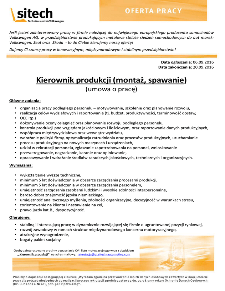 Jeśli jesteś zainteresowany pracą w firmie należącej do największego europejskiego producenta samochodów Volkswagen AG, w przedsiębiorstwie produkującym metalowe stelaże siedzeń samochodowych do aut marek: Volkswagen, Seat oraz Skoda - to do Ciebie kierujemy naszą ofertę! Dajemy Ci szansę pracy w innowacyjnym, międzynarodowym i stabilnym przedsiębiorstwie! Data ogłoszenia: 06.09.2016 Data zakończenia: 20.09.2016 Kierownik produkcji (montaż, spawanie) (umowa o pracę) Główne zadania: • • • • • • • • • • • organizacja pracy podległego personelu – motywowanie, szkolenie oraz planowanie rozwoju, realizacja celów wydziałowych i raportowanie (tj. budżet, produktywności, terminowość dostaw, OEE itp.) dokonywanie oceny osiągnięć oraz planowanie rozwoju podległego personelu, kontrola produkcji pod względem jakościowym i ilościowym, oraz raportowanie danych produkcyjnych, współpraca międzywydziałowa oraz wewnątrz wydziału, wdrażanie polityki firmy, optymalizacja zatrudnienia oraz procesów produkcyjnych, uruchamianie procesu produkcyjnego na nowych maszynach i urządzeniach, udział w rekrutacji personelu, zgłaszanie zapotrzebowania na personel, wnioskowanie przeszeregowanie, nagradzanie, karanie oraz opiniowanie, opracowywanie i wdrażanie środków zaradczych jakościowych, technicznych i organizacyjnych. Wymagania: • • • • • • • • wykształcenie wyższe techniczne, minimum 5 lat doświadczenia w obszarze zarządzania procesami produkcji, minimum 5 lat doświadczenia w obszarze zarządzania personelem, umiejętność zarządzania zasobami ludzkimi i wysokie zdolności interpersonalne, bardzo dobra znajomość języka niemieckiego, umiejętność analitycznego myślenia, zdolności organizacyjne, decyzyjność w warunkach stresu, zorientowanie na klienta i nastawienie na cel, prawo jazdy kat.B., dyspozycyjność. Oferujemy: • • • • stabilną i interesującą pracę w dynamicznie rozwijającej się firmie o ugruntowanej pozycji rynkowej, rozwój zawodowy w ramach struktur międzynarodowego koncernu motoryzacyjnego, atrakcyjne wynagrodzenie, bogaty pakiet socjalny. Osoby zainteresowane prosimy o przesłanie CV i listu motywacyjnego wraz z dopiskiem „ Kierownik produkcji” na adres mailowy: [email protected]