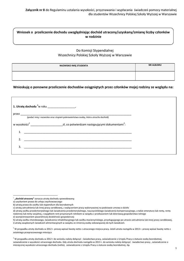 Załącznik nr 8 do Regulaminu ustalania wysokości, przyznawania i wypłacania świadczeń pomocy materialnej dla studentów Wszechnicy Polskiej Szkoły Wyższej w Warszawie Wniosek o przeliczenie dochodu uwzględniając dochód utracony/uzyskany/zmianę liczby członków w rodzinie Do Komisji Stypendialnej Wszechnicy Polskiej Szkoły Wyższej w Warszawie NR ALBUMU NAZWISKO IMIĘ STUDENTA Wnioskuję o ponowne przeliczenie dochodów osiągniętych przez członków mojej rodziny ze względu na: 1 1. Utratę dochodu w roku __________________, przez ________________________________________________________________________ (podać imię i nazwisko oraz stopień pokrewieństwa osoby, która utraciła dochód) 2 3 w wysokości _____________________zł, co potwierdzam następującymi dokumentami : 1. ______________________________________________________________________ 2. ______________________________________________________________________ 3. ______________________________________________________________________ 1 „dochód utracony” oznacza utratę dochodu spowodowaną: a) uzyskaniem prawa do urlopu wychowawczego b) utratą prawa do zasiłku lub stypendium dla bezrobotnych c) utratą zatrudnienia lub innej pracy zarobkowej, z wyłączeniem pracy wykonywanej na podstawie umowy o dzieło d) utratą zasiłku przedemerytalnego lub świadczenia przedemerytalnego, nauczycielskiego świadczenia kompensacyjnego, a także emerytury lub renty, renty rodzinnej lub renty socjalnej, z wyjątkiem rent przyznanych rolnikom w związku z przekazaniem lub dzierżawą gospodarstwa rolnego e) wyrejestrowaniem pozarolniczej działalności gospodarczej h) utratą zasiłku chorobowego, świadczenia rehabilitacyjnego lub zasiłku macierzyńskiego, przysługującego po utracie zatrudnienia lub innej pracy zarobkowej, i) utratą zasądzonych świadczeń alimentacyjnych w związku ze śmiercią osoby zobowiązanej do tych świadczeń. 2 W przypadku utraty dochodu w 2012 r. proszę wpisać kwotę netto z utraconego miejsca pracy. Jeżeli utrata nastąpiła w 2013 r. proszę wpisać kwotę netto z ostatniego przepracowanego miesiąca 3 W przypadku utraty dochodu w 2012 r do wniosku należy dołączyć : świadectwo pracy, zaświadczenie z Urzędu Pracy o statusie osoby bezrobotnej, zaświadczenie o wysokości utraconego dochodu. Gdy utrata dochodu nastąpiła w 2013 r. do wniosku należy dołączyć: świadectwo pracy , zaświadczenie o miesięcznej wysokości utraconego dochodu (netto), zaświadczenie z Urzędu Pracy o statusie osoby bezrobotnej, itp. 1 Załącznik nr 8 do Regulaminu ustalania wysokości, przyznawania i wypłacania świadczeń pomocy materialnej dla studentów Wszechnicy Polskiej Szkoły Wyższej w Warszawie 4 2. Uzyskanie dochodu w roku __________________ przez _________________________________________________________________________ (podać imię i nazwisko oraz stopień pokrewieństwa osoby, która uzyskała dochód) w wysokości (kwota netto z pełnego przepracowanego miesiąca) _________________zł, 5 co potwierdzam następującymi dokumentami : 1. ______________________________________________________________________ 2. ______________________________________________________________________ 3. ______________________________________________________________________ 3. Zwiększenie/zmniejszenie liczby członków rodziny (należy dołączyć dokumenty potwierdzające zmianę , np. akt urodzenia, akt zgonu, akt zawarcia związku małżeńskiego, orzeczenie rozwodu) co potwierdzam następującym dokumentem: 1. ______________________________________________________________________ W sprawach związanych z powyższymi dochodami mają zastosowanie przepisy ustawy z dn. 23 listopada 2003 roku o świadczeniach rodzinnych (Dz. U. Nr 228 poz. 2255 z późn. zmianami) ----------------------------miejscowość, dnia --------------------------------------------------czytelny podpis studenta 4 „dochód uzyskany” oznacza to uzyskanie dochód który został spowodowany: a) zakończeniem urlopu wychowawczego b) uzyskaniem prawa do zasiłku lub stypendium dla bezrobotnych c) uzyskaniem zatrudnienia lub innej pracy zarobkowej, z wyłączeniem pracy wykonanej na podstawie umowy o dzieło d) uzyskaniem zasiłku przedemerytalnego lub świadczenia przedemerytalnego, nauczycielskiego świadczenia kompensacyjnego, a także emerytury lub renty, renty rodzinnej lub renty socjalnej, z wyjątkiem rent przyznanych rolnikom w związku z przekazaniem lub dzierżawą gospodarstwa rolnego e) rozpoczęciem pozarolniczej działalności gospodarczej h) uzyskaniem zasiłku chorobowego, świadczenia rehabilitacyjnego lub zasiłku macierzyńskiego, przysługującego po utracie zatrudnienia lub innej pracy zarobkowej, 5 Do wniosku należy dołączyć dokument potwierdzający uzyskanie zatrudnienia, zaświadczenie o miesięcznym dochodzie netto. 2