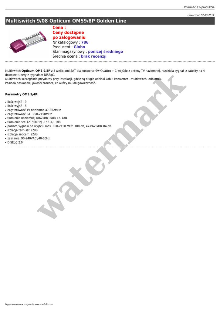 Informacje o produkcie Utworzono 02-03-2017 Multiswitch 9/08 Opticum OMS9/8P Golden Line Cena : Ceny dostępne po zalogowaniu Nr katalogowy : 786 Producent : Globo Stan magazynowy : poniżej średniego Średnia ocena : brak recenzji Parametry OMS 9/4P: ● ● ● ● ● ● ● ● ● ● ilość wejść - 9 ilość wyjść - 8 częstotliwość TV naziemna 47-862MHz częstotliwość SAT 950-2150MHz tłumienie naziemnej (862MHz) 5dB +/- 1dB tłumienie sat. (2150MHz) -1dB +/- 1dB poziom sygnału na wyjściu max. 950-2150 MHz 100 dB, 47-862 MHz 84 dB izolacja terr.-sat 22dB izolacja sat-terr. 22dB zasilanie: 90-240VAC /40-60Hz DiSEqC 2.0 w at ● er m ar k Multiswitch Opticum OMS 9/8P z 8 wejściami SAT dla konwerterów Quattro + 1 wejście z anteny TV naziemnej, rozdziela sygnał z satelity na 4 dowolne tunery z sygnałem DiSEqC. Multiswitch szczególnie przydatny przy instalacji, gdzie są długie odcinki kabli: konwerter - multiswitch -odbiornik. Posiada doskonałej jakości zasilacz, co wróży mu długowieczność. Wygenerowano w programie www.oscGold.com