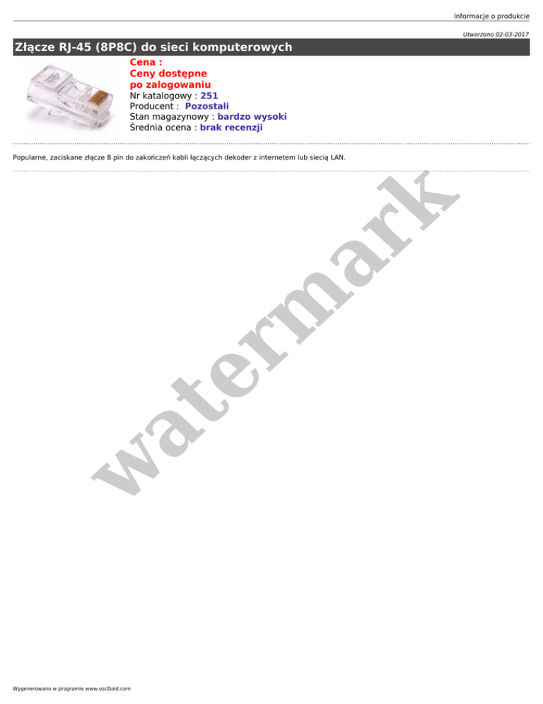 Informacje o produkcie Utworzono 02-03-2017 Złącze RJ-45 (8P8C) do sieci komputerowych Cena : Ceny dostępne po zalogowaniu Nr katalogowy : 251 Producent : Pozostali Stan magazynowy : bardzo wysoki Średnia ocena : brak recenzji w at er m ar k Popularne, zaciskane złącze 8 pin do zakończeń kabli łączących dekoder z internetem lub siecią LAN. Wygenerowano w programie www.oscGold.com
