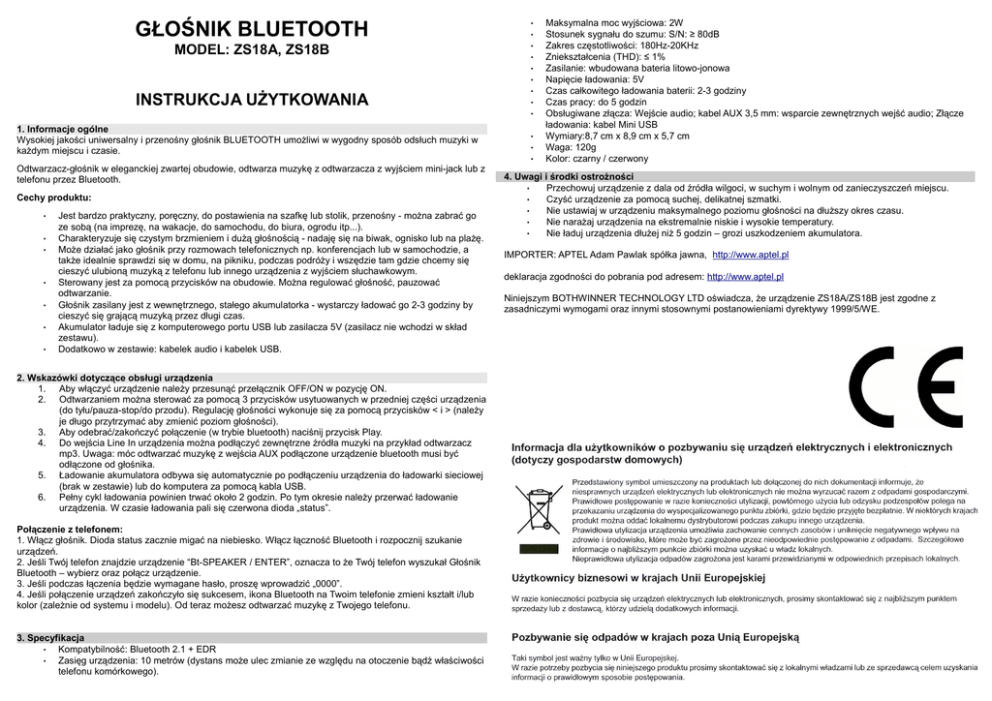 GŁOŚNIK BLUETOOTH MODEL: ZS18A, ZS18B INSTRUKCJA UŻYTKOWANIA 1. Informacje ogólne Wysokiej jakości uniwersalny i przenośny głośnik BLUETOOTH umożliwi w wygodny sposób odsłuch muzyki w każdym miejscu i czasie. Odtwarzacz-głośnik w eleganckiej zwartej obudowie, odtwarza muzykę z odtwarzacza z wyjściem mini-jack lub z telefonu przez Bluetooth. Cechy produktu: • • • • • • • Jest bardzo praktyczny, poręczny, do postawienia na szafkę lub stolik, przenośny - można zabrać go ze sobą (na imprezę, na wakacje, do samochodu, do biura, ogrodu itp...). Charakteryzuje się czystym brzmieniem i dużą głośnością - nadaję się na biwak, ognisko lub na plażę. Może działać jako głośnik przy rozmowach telefonicznych np. konferencjach lub w samochodzie, a także idealnie sprawdzi się w domu, na pikniku, podczas podróży i wszędzie tam gdzie chcemy się cieszyć ulubioną muzyką z telefonu lub innego urządzenia z wyjściem słuchawkowym. Sterowany jest za pomocą przycisków na obudowie. Można regulować głośność, pauzować odtwarzanie. Głośnik zasilany jest z wewnętrznego, stałego akumulatorka - wystarczy ładować go 2-3 godziny by cieszyć się grającą muzyką przez długi czas. Akumulator ładuje się z komputerowego portu USB lub zasilacza 5V (zasilacz nie wchodzi w skład zestawu). Dodatkowo w zestawie: kabelek audio i kabelek USB. 2. Wskazówki dotyczące obsługi urządzenia 1. Aby włączyć urządzenie należy przesunąć przełącznik OFF/ON w pozycję ON. 2. Odtwarzaniem można sterować za pomocą 3 przycisków usytuowanych w przedniej części urządzenia (do tyłu/pauza-stop/do przodu). Regulację głośności wykonuje się za pomocą przycisków < i > (należy je długo przytrzymać aby zmienić poziom głośności). 3. Aby odebrać/zakończyć połączenie (w trybie bluetooth) naciśnij przycisk Play. 4. Do wejścia Line In urządzenia można podłączyć zewnętrzne źródła muzyki na przykład odtwarzacz mp3. Uwaga: móc odtwarzać muzykę z wejścia AUX podłączone urządzenie bluetooth musi być odłączone od głośnika. 5. Ładowanie akumulatora odbywa się automatycznie po podłączeniu urządzenia do ładowarki sieciowej (brak w zestawie) lub do komputera za pomocą kabla USB. 6. Pełny cykl ładowania powinien trwać około 2 godzin. Po tym okresie należy przerwać ładowanie urządzenia. W czasie ładowania pali się czerwona dioda „status”. Połączenie z telefonem: 1. Włącz głośnik. Dioda status zacznie migać na niebiesko. Włącz łączność Bluetooth i rozpocznij szukanie urządzeń. 2. Jeśli Twój telefon znajdzie urządzenie “Bt-SPEAKER / ENTER”, oznacza to że Twój telefon wyszukał Głośnik Bluetooth – wybierz oraz połącz urządzenie. 3. Jeśli podczas łączenia będzie wymagane hasło, proszę wprowadzić „0000”. 4. Jeśli połączenie urządzeń zakończyło się sukcesem, ikona Bluetooth na Twoim telefonie zmieni kształt i/lub kolor (zależnie od systemu i modelu). Od teraz możesz odtwarzać muzykę z Twojego telefonu. 3. Specyfikacja • Kompatybilność: Bluetooth 2.1 + EDR • Zasięg urządzenia: 10 metrów (dystans może ulec zmianie ze względu na otoczenie bądź właściwości telefonu komórkowego). • • • • • • • • • • • • Maksymalna moc wyjściowa: 2W Stosunek sygnału do szumu: S/N: ≥ 80dB Zakres częstotliwości: 180Hz-20KHz Zniekształcenia (THD): ≤ 1% Zasilanie: wbudowana bateria litowo-jonowa Napięcie ładowania: 5V Czas całkowitego ładowania baterii: 2-3 godziny Czas pracy: do 5 godzin Obsługiwane złącza: Wejście audio; kabel AUX 3,5 mm: wsparcie zewnętrznych wejść audio; Złącze ładowania: kabel Mini USB Wymiary:8,7 cm x 8,9 cm x 5,7 cm Waga: 120g Kolor: czarny / czerwony 4. Uwagi i środki ostrożności • Przechowuj urządzenie z dala od źródła wilgoci, w suchym i wolnym od zanieczyszczeń miejscu. • Czyść urządzenie za pomocą suchej, delikatnej szmatki. • Nie ustawiaj w urządzeniu maksymalnego poziomu głośności na dłuższy okres czasu. • Nie narażaj urządzenia na ekstremalnie niskie i wysokie temperatury. • Nie ładuj urządzenia dłużej niż 5 godzin – grozi uszkodzeniem akumulatora. IMPORTER: APTEL Adam Pawlak spółka jawna, http://www.aptel.pl deklaracja zgodności do pobrania pod adresem: http://www.aptel.pl Niniejszym BOTHWINNER TECHNOLOGY LTD oświadcza, że urządzenie ZS18A/ZS18B jest zgodne z zasadniczymi wymogami oraz innymi stosownymi postanowieniami dyrektywy 1999/5/WE.