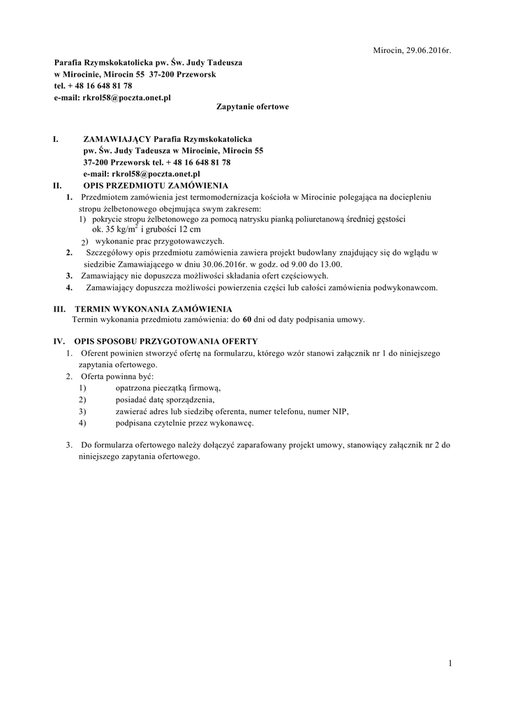 Mirocin, 29.06.2016r. Parafia Rzymskokatolicka pw. Św. Judy Tadeusza w Mirocinie, Mirocin 55 37-200 Przeworsk tel. + 48 16 648 81 78 e-mail: [email protected] Zapytanie ofertowe ZAMAWIAJĄCY Parafia Rzymskokatolicka pw. Św. Judy Tadeusza w Mirocinie, Mirocin 55 37-200 Przeworsk tel. + 48 16 648 81 78 e-mail: [email protected] II. OPIS PRZEDMIOTU ZAMÓWIENIA 1. Przedmiotem zamówienia jest termomodernizacja kościoła w Mirocinie polegająca na dociepleniu stropu żelbetonowego obejmująca swym zakresem: 1) pokrycie stropu żelbetonowego za pomocą natrysku pianką poliuretanową średniej gęstości I. ok. 35 kg/m2 i grubości 12 cm 2) wykonanie prac przygotowawczych. 2. 3. 4. III. IV. Szczegółowy opis przedmiotu zamówienia zawiera projekt budowlany znajdujący się do wglądu w siedzibie Zamawiającego w dniu 30.06.2016r. w godz. od 9.00 do 13.00. Zamawiający nie dopuszcza możliwości składania ofert częściowych. Zamawiający dopuszcza możliwości powierzenia części lub całości zamówienia podwykonawcom. TERMIN WYKONANIA ZAMÓWIENIA Termin wykonania przedmiotu zamówienia: do 60 dni od daty podpisania umowy. OPIS SPOSOBU PRZYGOTOWANIA OFERTY Oferent powinien stworzyć ofertę na formularzu, którego wzór stanowi załącznik nr 1 do niniejszego zapytania ofertowego. 2. Oferta powinna być: 1) opatrzona pieczątką firmową, 2) posiadać datę sporządzenia, 3) zawierać adres lub siedzibę oferenta, numer telefonu, numer NIP, 4) podpisana czytelnie przez wykonawcę. 1. 3. Do formularza ofertowego należy dołączyć zaparafowany projekt umowy, stanowiący załącznik nr 2 do niniejszego zapytania ofertowego. 1 V. MIEJSCE ORAZ TERMIN SKŁADANIA OFERT 1. Oferta powinna być przesłana za pośrednictwem: poczty elektronicznej na adres: [email protected] poczty lub kuriera do dnia 4 lipca 2016r. do godz. 10.00. Liczy się termin wpływu oferty do Zamawiającego, a nie data wysłania oferty. 2. Ocena ofert zostanie dokonana w dniu 4 lipca 2016r., a wyniki wyboru najkorzystniejszej oferty zostaną ogłoszone przez Zamawiającego poprzez umieszczenie na stronie internetowej pod adresem www.mirocin.przemyska.pl 3. Oferty złożone po terminie nie będą rozpatrywane. 4. Oferent może przed upływem terminu składania ofert zmienić lub wycofać swoją ofertę. 5. W toku badania i oceny ofert Zamawiający może żądać od oferentów wyjaśnień dotyczących treści złożonych ofert. VI. OCENA OFERT Zamawiający dokona oceny ważnych ofert na podstawie następujących kryteriów: Cena - 100% VII. INFORMACJE DOTYCZĄCE WYBORU NAJKORZYSTNIEJSZEJ OFERTY 1. O wyborze najkorzystniejszej oferty Zamawiający zawiadomi oferentów za pośrednictwem strony internetowej znajdującej się pod adresem www.mirocin.przemyska.pl 2. Okres związania ofertą wynosi 30 dni od dnia otwarcia ofert, tj. od dnia 4 lipca 2016r. VIII. DODATKOWE INFORMACJE Dodatkowych informacji udziela Ks. Ryszard Królicki pod numerem telefonu + 48 16 648 81 78 oraz adresem email: [email protected] IX. ZAŁĄCZNIKI 1. Załącznik nr 1 - Formularz ofertowy 3. Załącznik nr 2 - Projekt umowy Proboszcz Parafii Ks. Ryszard Królicki 2