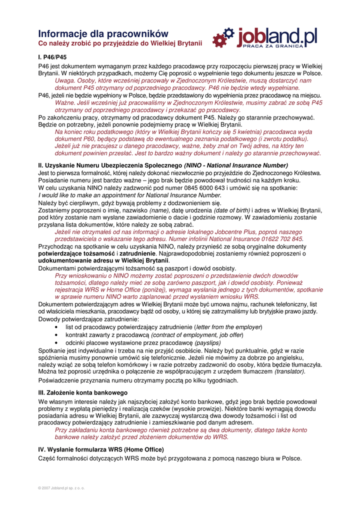 Informacje dla pracowników Co należy zrobić po przyjeździe do Wielkiej Brytanii I. P46/P45 P46 jest dokumentem wymaganym przez każdego pracodawcę przy rozpoczęciu pierwszej pracy w Wielkiej Brytanii. W niektórych przypadkach, możemy Cię poprosić o wypełnienie tego dokumentu jeszcze w Polsce. Uwaga. Osoby, które wcześniej pracowały w Zjednoczonym Królestwie, muszą dostarczyć nam dokument P45 otrzymany od poprzedniego pracodawcy. P46 nie będzie wtedy wypełniane. P46, jeżeli nie będzie wypełniony w Polsce, będzie przedstawiony do wypełnienia przez pracodawcę na miejscu. Ważne. Jeśli wcześniej już pracowaliśmy w Zjednoczonym Królestwie, musimy zabrać ze sobą P45 otrzymany od poprzedniego pracodawcy i przekazać go pracodawcy. Po zakończeniu pracy, otrzymamy od pracodawcy dokument P45. Należy go starannie przechowywać. Będzie on potrzebny, jeżeli ponownie podejmiemy pracę w Wielkiej Brytanii. Na koniec roku podatkowego (który w Wielkiej Brytanii kończy się 5 kwietnia) pracodawca wyda dokument P60, będący podstawą do ewentualnego zeznania podatkowego (i zwrotu podatku). Jeżeli już nie pracujesz u danego pracodawcy, ważne, żeby znał on Twój adres, na który ten dokument powinien przesłać. Jest to bardzo ważny dokument i należy go starannie przechowywać. II. Uzyskanie Numeru Ubezpieczenia Społecznego (NINO - National Insurance Number) Jest to pierwsza formalność, której należy dokonać niezwłocznie po przyjeździe do Zjednoczonego Królestwa. Posiadanie numeru jest bardzo ważne – jego brak będzie powodował trudności na każdym kroku. W celu uzyskania NINO należy zadzwonić pod numer 0845 6000 643 i umówić się na spotkanie: I would like to make an appointment for National Insurance Number. Należy być cierpliwym, gdyż bywają problemy z dodzwonieniem się. Zostaniemy poproszeni o imię, nazwisko (name), datę urodzenia (date of birth) i adres w Wielkiej Brytanii, pod który zostanie nam wysłane zawiadomienie o dacie i godzinie rozmowy. W zawiadomieniu zostanie przysłana lista dokumentów, które należy ze sobą zabrać. Jeżeli nie otrzymałeś od nas informacji o adresie lokalnego Jobcentre Plus, poproś naszego przedstawiciela o wskazanie tego adresu. Numer infolinii National Insurance 01622 702 845. Przychodząc na spotkanie w celu uzyskania NINO, należy przynieść ze sobą oryginalne dokumenty potwierdzające tożsamość i zatrudnienie. Najprawdopodobniej zostaniemy również poproszeni o udokumentowanie adresu w Wielkiej Brytanii. Dokumentami potwierdzającymi tożsamość są paszport i dowód osobisty. Przy wnioskowaniu o NINO możemy zostać poproszeni o przedstawienie dwóch dowodów tożsamości, dlatego należy mieć ze sobą zarówno paszport, jak i dowód osobisty. Ponieważ rejestracja WRS w Home Office (poniżej), wymaga wysłania jednego z tych dokumentów, spotkanie w sprawie numeru NINO warto zaplanować przed wysłaniem wniosku WRS. Dokumentem potwierdzającym adres w Wielkiej Brytanii może być umowa najmu, rachunek telefoniczny, list od właściciela mieszkania, pracodawcy bądź od osoby, u której się zatrzymaliśmy lub brytyjskie prawo jazdy. Dowody potwierdzające zatrudnienie: • list od pracodawcy potwierdzający zatrudnienie (letter from the employer) • kontrakt zawarty z pracodawcą (contract of employment, job offer) • odcinki płacowe wystawione przez pracodawcę (payslips) Spotkanie jest indywidualne i trzeba na nie przyjść osobiście. Należy być punktualnie, gdyż w razie spóźnienia musimy ponownie umówić się telefonicznie. Jeżeli nie mówimy za dobrze po angielsku, należy wziąć ze sobą telefon komórkowy i w razie potrzeby zadzwonić do osoby, która będzie tłumaczyła. Można też poprosić urzędnika o połączenie ze współpracującym z urzędem tłumaczem (translator). Poświadczenie przyznania numeru otrzymamy pocztą po kilku tygodniach. III. Założenie konta bankowego We własnym interesie należy jak najszybciej założyć konto bankowe, gdyż jego brak będzie powodował problemy z wypłatą pieniędzy i realizacją czeków (wysokie prowizje). Niektóre banki wymagają dowodu posiadania adresu w Wielkiej Brytanii, ale zazwyczaj wystarczą dwa dowody tożsamości i list od pracodawcy potwierdzający zatrudnienie i zamieszkiwanie pod danym adresem. Przy zakładaniu konta bankowego również potrzebne są dwa dokumenty, dlatego także konto bankowe należy założyć przed złożeniem dokumentów do WRS. IV. Wysłanie formularza WRS (Home Office) Część formalności dotyczących WRS może być przygotowana z pomocą naszego biura w Polsce. © 2007 Jobland.pl sp. z o. o. 1. Niezwłocznie po uzyskaniu numeru NINO, jednak w żadnym wypadku nie później niż jeden miesiąc po rozpoczęciu pracy należy uzupełnić (pisząc czarnym długopisem i drukowanymi literami) formularz WRS o brakujący adres zamieszkania. Należy go wpisać pod dwiema pozycjami w formularzu: • na stronie pierwszej, Section A: Contact details of the person paying for the application; • na stronie trzeciej, Section 3: Personal details of applicant, punkt 11. Na podany w formularzu WRS adres zamieszkania w Wielkiej Brytanii zostaną odesłane następujące dokumenty: wysłany uprzednio do Home Office dowód osobisty lub paszport, karta rejestracyjna WRS oraz zaświadczenie rejestracyjne. Ważne jest, aby podać właściwy adres! 2. Uzupełniony formularz należy umieścić w otrzymanej od jobland.pl kopercie, do której włożyć należy ponadto (uwaga, nie zaklejamy jeszcze tej koperty!): • 2 zdjęcia • dowód osobisty lub paszport • list od pracodawcy potwierdzający zatrudnienie 3. Z listem idziemy do Urzędu Pocztowego (Post Office) gdzie nadajemy przekaz pocztowy (Postal Order) na 90 funtów, wystawiony na Home Office, Work Permits (UK). W przypadku jakichkolwiek problemów, należy pokazać urzędnikowi poczty następująca prośbę o pomoc: Dear sir or madam, Unfortu