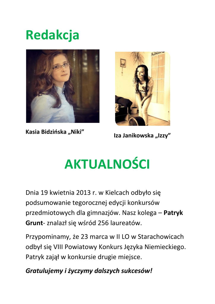 Redakcja Kasia Bidzińska „Niki” Iza Janikowska „Izzy” AKTUALNOŚCI Dnia 19 kwietnia 2013 r. w Kielcach odbyło się podsumowanie tegorocznej edycji konkursów przedmiotowych dla gimnazjów. Nasz kolega – Patryk Grunt- znalazł się wśród 256 laureatów. Przypominamy, że 23 marca w II LO w Starachowicach odbył się VIII Powiatowy Konkurs Języka Niemieckiego. Patryk zajął w konkursie drugie miejsce. Gratulujemy i życzymy dalszych sukcesów! Sport 26 kwietnia 2013 r. w Zespole Szkół w Baćkowicach rozegrana została druga runda turnieju Coca Cola Cup 2013. Nasze dziewczęta znowu okazały się najlepsze. Zdobywając komplet punktów awansowały do następnej rundy. Trzymamy kciuki!!! Naszą szkołę reprezentowały: Izabela Szmalec, Julia Puchała, Aleksandra Czaja, Karolina Puchała, Anna Kulik, Katarzyna Miśkiewicz, Iza Janikowska, Kinga Ziewiec, Paulina Dziułka, Nikola Surowiec, Karolina Styczyńska. W dniu 26 kwietnia w Zespole Szkół im. Jana Pawła II w Pawłowie odbyły się gminne zawody w piłce ręcznej szkół gimnazjalnych w kategorii dziewcząt. Nasze szczypiornistki znowu okazały się bezkonkurencyjne wygrywając wszystkie mecze. Humor Student przychodzi na egzamin z logiki i na bezczelnego pyta profesora - Pan się łapie w tej logice panie Profesorze? - Oczywiście, co za pytanie. - To ja mam taką propozycję panie Profesorze, zadam panu pytanie i jeśli pan nie odpowie stawia mi pan 5, a jeśli pan odpowie wywala mnie pan na zbity pysk. - OK niech pan pyta - Co obecnie jest legalne, ale nielogiczne, logiczne ale nielegalne, a co nie jest logiczne ani legalne? Profesor nie znal odpowiedzi postawił studentowi 5 i wola swojego najlepszego studenta i pyta go o odpowiedź. Ten mu natychmiast odpowiada: - Ma pan 65 lat i jest pan żonaty z 25-letnią kobietą, co jest legalne, ale nielogiczne. Pana żona ma 20letniego kochanka, co jest logiczne ale nielegalne. Pan stawia kochankowi swojej żony 5 chociaż powinien go pan wywalić na zbity pysk i to nie jest ani logiczne ani legalne. *** Jasiu biegnie do mamy i jej mówi: - Mamo, mamo termometr spadł. - O ile? - O 5 pięter. *** Łamaniec językowy Gdy Pomorze nie pomoże, to pomoże może morze, a gdy morze nie pomoże, to pomoże może Gdańsk. *** Mała muszka spod Łopuszki chciała mieć różowe nóżki – różdżką nóżki czarowała, lecz wciąż nóżki czarne miała. – Po cóż czary, moja muszko? Ruszże móżdżkiem, a nie różdżką! Wyrzuć wreszcie różdżkę wróżki i unurzaj w różu nóżki! *** Rozrywka Lista przebojów!! 1. John De Sohn – Dance Our Tears Away 2. Bastille – Pompeii 3. MKTO – Thank You 4. Robin Thicke / T.I. – Blurred Lines 5. One Direction - One Way Or Another 6. Wankelmut / Emma-Louie – My Head Is A Jungle 7. Rihanna – Stay 8. Macklemore / Ryan Lewis – Can’t Hold Us 9. One Republik – If Lose Myself 10. Disclosure / AlunaGeorge – White Noise Żródło : http://www.rmfmaxxx.pl/hopbec Filmy Straszny film Piąta część serii komediowych horrorów, które stały się najsłynniejszą parodią kina grozy. Tym razem w rolach głównych zobaczymy Charliego Sheena (Dwóch i pół),Lindsay Lohan oraz Ashley Tisdale. W domu młodego małżeństwa mają miejsce niepokojące zdarzenia, po tym jak wracają ze szpitala ze swoim nowonarodzonym potomkiem. Korzystając z pomocy kamer i sztabu specjalistów odkrywają, że ich dom jest opętany przez demona. (opis dystrybutora) Martwe Zło W remake'u filmu z roku 1981. Mia (Jane Levy) wraz z bratem i przyjaciółmi wyrusza do opuszczonego domku na odludziu. Kiedy odkrywają pozostawioną tam "Księgę umarłych", nieświadomie uwalniają demony uśpione w pobliskim lesie. Zaczyna się przerażająca walka o przetrwanie. Ciekawostki Dzień Matki – święto obchodzone corocznie w Polsce 26 maja jako wyraz szacunku dla wszystkich matek. W tym dniu są one zwykle obdarowywane laurkami, kwiatami oraz różnego rodzaju prezentami przez własne dzieci, rzadziej inne osoby. To święto ma na celu okazanie matkom szacunku, miłości, podziękowania za trud włożony w wychowanie. Życzymy Wszystkiego Najlepszego wszystkim Mamą Międzynarodowy Dzień Dziecka i Powszechny Dzień Dziecka – święto dzieci obchodzone corocznie w wielu krajach. W Polsce (jak również w innych krajach dawnego bloku socjalistycznego, jak Rosja, Chiny, Czechy, Słowacja, Ukraina, Rumunia, Bułgaria, wschodnie landy Niemiec, Kuba) Dzień Dziecka obchodzony jest od roku 1950 w dniu 1 czerwca. Po raz pierwszy zorganizowano go w związku z akcją zbierania podpisów pod Apelem sztokholmskim. Od 1952 r. stało się świętem stałym. Jego inicjatorem jest organizacja zwana International Union for Protection of Childhood, której celem było zapewnienie bezpieczeństwa dzieciom z całego świata .Od roku 1994 tego dnia w Warszawie obraduje Sejm Dzieci i Młodzieży. Z okazji Dnia Dziecka w szkołach często obchodzony jest dzień sportu; np. poprzez organizowanie rozgrywek międzyklasowych Foto galeria Kalendarium Typowych i Nietypowych Świąt Maj 1 maja - Międzynarodowe Święto Pracy 1 maja - Międzynarodowy Dzień Solidarności Ludzi Pracy 2 maja - Święto Polskiej Flagi/Dzień Flagi Rzeczpospolitej Polskiej 3 maja - Święto Konstytucji 3 maja 3 maja - Międzynarodowy Dzień Wolności Prasy 3 maja - Międzynarodowy Dzień Astmy i Alergii 3 maja - Dzień Słońca 4 maja - Dzień Strażaka 4 maja - Dzień Hutnika 4 maja - Dzień Kominiarza 5 maja - Dzień Europy 5 maja - Dzień Leśnika i Drzewiarza (Polska) 5 maja - Dzień Godności Osób Niepełnosprawnych Intelektualnie 8 maja - Międzynarodowy Dzień Zwycięstwa 8 maja - Międzynarodowy Dzień Czerwonego Krzyża i Półksiężyca 8 maja - Dzień Bibliotekarzy i Bibliotek 9 maja - Święto Unii Europejskiej 10 maja - Dzień Pracownika Gospodarki Komunalnej 12 maja - Międzynarodowy Dzień Pielęgniarek i Położnych 12 maja - Dzień Środków Społecznego Przekazu (Kościół Katol