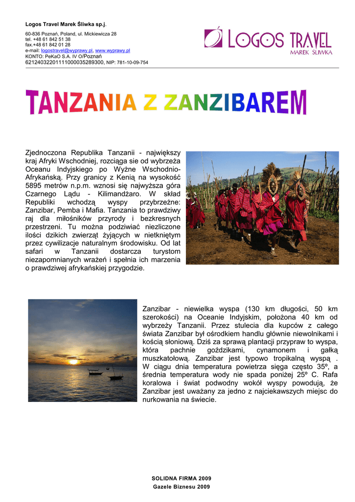 Logos Travel Marek Śliwka sp.j. 60-836 Poznań, Poland, ul. Mickiewicza 28 tel. +48 61 842 51 38 fax.+48 61 842 01 28 e-mail: [email protected], www.wyprawy.pl KONTO: PeKaO S.A. IV O/Poznań 62124032201111000035289300, NIP: 781-10-09-754 Zjednoczona Republika Tanzanii - największy kraj Afryki Wschodniej, rozciąga sie od wybrzeża Oceanu Indyjskiego po Wyżne WschodnioAfrykańską. Przy granicy z Kenią na wysokość 5895 metrów n.p.m. wznosi się najwyższa góra Czarnego Lądu - Kilimandżaro. W skład Republiki wchodzą wyspy przybrzeżne: Zanzibar, Pemba i Mafia. Tanzania to prawdziwy raj dla miłośników przyrody i bezkresnych przestrzeni. Tu można podziwiać niezliczone ilości dzikich zwierząt żyjących w nietkniętym przez cywilizacje naturalnym środowisku. Od lat safari w Tanzanii dostarcza turystom niezapomnianych wrażeń i spełnia ich marzenia o prawdziwej afrykańskiej przygodzie. Zanzibar - niewielka wyspa (130 km długości, 50 km szerokości) na Oceanie Indyjskim, położona 40 km od wybrzeży Tanzanii. Przez stulecia dla kupców z całego świata Zanzibar był ośrodkiem handlu głównie niewolnikami i kością słoniową. Dziś za sprawą plantacji przypraw to wyspa, która pachnie goździkami, cynamonem i gałką muszkatołową. Zanzibar jest typowo tropikalną wyspą . W ciągu dnia temperatura powietrza sięga często 35º, a średnia temperatura wody nie spada poniżej 25º C. Rafa koralowa i świat podwodny wokół wyspy powodują, że Zanzibar jest uważany za jedno z najciekawszych miejsc do nurkowania na świecie. SOLIDNA FIRMA 2009 Gazele Biznesu 2009 WSTEPNA PROPOZYCJA PROGRAMU Dzień 1. WARSZAWA /PORT EUROPEJSKI/ ARUSHA Zbiórka uczestników wyjazdu na lotnisku w Warszawie w terminalu nr I przy poczcie. Spotkanie z pilotem grupy. Przelot samolotem rejsowym do Arushy przez jeden z portów europejskich. Przylot do Tanzanii. Powitanie na lotnisku przez lokalnego przedstawiciela biura. Przejazd do hotelu np. Serena Mountain Village Lodge w miejscowosci Arusha (ok.1 godziny jazdy), która leży u stóp drugiej co do wielkości góry Tanzanii – Meru (4572 m). Zakwaterowanie. Drink powitalny Kolacja. Nocleg. Dzień 2. Arusha - Serengeti Wczesne Śniadanie. Przejazd na lotnisko. Przelot samolotem charterowym do Parku Narodowego Serengeti. Serengeti to jeden z najsłynniejszych parków narodowych świata. Nigdzie nie spotyka się tak wielkich stad zwierząt i tylu krążących wokół nich drapieżników. Żyje tu największa populacja czarnogrzywych lwów, a także słonie, żyrafy, gazele, antylopy, lamparty, gepardy, hipopotamy, krokodyle i inne zwierzęta. Krajobraz parku to bezkresne stepy z pojedynczymi, widocznymi z wielu kilometrów drzewami i wzgórzami. Krótkie i piękne wschody i zachody słońca stwarzają niepowtarzalną, bajkową atmosferę. Po przylocie do Serengeti zapraszamy na pierwsze safari. Przejazd 6-osobowymi samochodami z podnoszonym dachem przez tereny zamieszkałe przez najróżniejsze gatunki zwierząt. Przyjazd do obozowiska np. „Kirawira Tented Camp” w porze obiadowej. Zakwaterowanie. Obiad. Czas wolny na odpoczynek. Wyjazd na popołudniowe safari. Po zmierzchu powrót do obozowiska. Uroczysta kolacja powitalna. Nocleg np. w hotelu Mountain Village Lodge * * * * * (www.serenahotels.com) Dzień 3. Serengeti 06:30 wyjazd na poranne safari. Powrót do obozowiska na śniadanie. Czas wolny. Możliwość odpoczynku przy basenie. Obiad w obozowisku. Wyjazd na popołudniowe safari - zapraszamy na cocktail na sawannie o zachodzie słońca - przy wspaniałym widowisku wyreżyserowanym przez naturę. Powrót na kolacje i nocleg. Dzień 4. Serengeti - Ngorongoro 08:00 Śniadanie. Wyjazd na poranne safari. Powrót na obiad. Wykwaterowanie i przejazd do słynnego wąwozu Olduvai - miejsca, gdzie znaleziono najstarsze ślady praczłowieka na Ziemi. Przejazd na teren Rezerwatu Przyrody Ngorongoro, gdzie koczownicze plemię pasterskie Masajów ma prawo osiedlania się, budowania swoich wiosek i wypasu zwierząt hodowlanych. Fakultatywnie : „Z Masajami Na TY...” Przejazd do wioski Masajów, gdzie tubylcy powitają uczestników tańcami i pieśniami. Zwiedzanie wioski tubylców, zajrzymy do ich domów, odwiedzimy kowala, a miejscowy Szaman ukłuje cielę - demonstracja „picia krwi” wg miejscowego zwyczaju... a potem grupa zostanie podzielona na zespoły, zmagające się z następującymi zajęciami: - krzesaniem ognia - rzutem włócznią - łucznictwo - bieg – konkurencja wspólna z Masajami Następnie zjazd do krateru Ngorongoro (kilkaset metrów w głąb krateru), który uważany jest za jeden z „Cudów Świata”. Stożek wulkanu aktywnego przed ok. 8 mln lat zapadł się, tworząc kalderę o powierzchni 311 km2 – jedna z największych na świecie. Dno krateru porównuje się do arki Noego i rajskich ogrodów. To tu jest największa możliwość spotkania tzw. Wielkiej Piątki, czyli słonia, lwa, bawoła, nosorożca i lamparta, a także wiele gatunków wodnych ptaków nad wypełniającym dno krateru jeziorem. Przyjazd do Ngorongoro Crater Lodge. Powitanie przez afrykańskich muzyków, którzy zaprezentują wspaniały pokaz gry na bębnach ze śpiewami i tańcami folklorystycznymi. Zakwaterowanie np. wKirawira Camp * * * * * (www.serenahotels.com) Drink powitalny. Kolacja. Nocleg. Dzień 5. Ngorongoro Śniadanie. Zjazd na dno krateru na całodniowe safari. Obiad BBQ przy rozstawionych stołach w buszu. Powrót na kolacje i nocleg. Dzień 6. Ngorongoro - Arusha - Zanzibar 06:30 Śniadanie. Wykwaterowanie i przejazd na lotnisko w miejscowości Arusha (ok. 3,5 godziny). Odlot na Zanzibar. Przylot na Zanzibar i przejazd (ok. 15 min.) do Stown Town - starego miasta znajdującego się na liście UNESCO - na obiad do restauracji Mtoni Marine położonej przy plaży. Po obiedzie przejazd na wschodnie wybrzeże do np. Hotelu Breezes Beach Club (ok.1 godz.). Zakwaterowanie. Drink powitalny. Czas wolny. Kolacja. Nocleg. Dzień 7. Zanzi