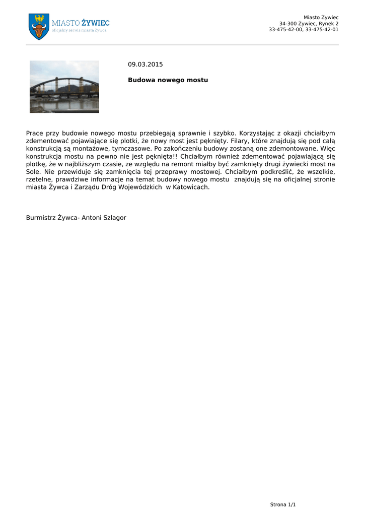 Miasto Żywiec 34-300 Żywiec, Rynek 2 33-475-42-00, 33-475-42-01 09.03.2015 Budowa nowego mostu Prace przy budowie nowego mostu przebiegają sprawnie i szybko. Korzystając z okazji chciałbym zdementować pojawiające się plotki, że nowy most jest pęknięty. Filary, które znajdują się pod całą konstrukcją są montażowe, tymczasowe. Po zakończeniu budowy zostaną one zdemontowane. Więc konstrukcja mostu na pewno nie jest pęknięta!! Chciałbym również zdementować pojawiającą się plotkę, że w najbliższym czasie, ze względu na remont miałby być zamknięty drugi żywiecki most na Sole. Nie przewiduje się zamknięcia tej przeprawy mostowej. Chciałbym podkreślić, że wszelkie, rzetelne, prawdziwe informacje na temat budowy nowego mostu znajdują się na oficjalnej stronie miasta Żywca i Zarządu Dróg Wojewódzkich w Katowicach. Burmistrz Żywca- Antoni Szlagor Strona 1/1 Powered by TCPDF (www.tcpdf.org)