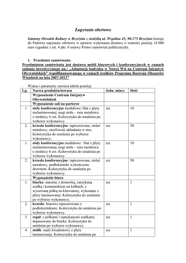 Zapytanie ofertowe Gminny Ośrodek Kultury w Brzeźniu z siedzibą ul. Wspólna 45, 98-275 Brzeźnio kieruje do Państwa zapytanie ofertowe w sprawie wykonania dostawy o wartości poniŜej 14 000 euro (zgodnie z art. 4 pkt. 8 ustawy Prawo zamówień publicznych). 1. Przedmiot zamówienia: Przedmiotem zamówienia jest dostawa mebli biurowych i konferencyjnych w ramach zadania inwestycyjnego pn.: „Adaptacja budynku w Nowej Wsi na Centrum Inicjatyw Obywatelskich” współfinansowanego w ramach środków Programu Rozwoju Obszarów Wiejskich na lata 2007-2013” Wykaz i parametry zawiera tabela poniŜej: Lp. Nazwa produktu/towaru WyposaŜenie Centrum Inicjatyw Obywatelskich WyposaŜenie sali na parterze 1. stoły konferencyjne modułowe: blat z płyty melaminowanej, nogi stołu – rura metalowa o średnicy 6 cm. Kolorystyka do ustalenia po wyborze wykonawcy. 2. krzesła konferencyjne: tapicerowane, stelaŜ metalowy, moŜliwość układania w stos. Kolorystyka do ustalenia po wyborze wykonawcy. 1. stoły konferencyjne modułowe: blat z płyty melaminowanej, nogi stołu – rura metalowa o średnicy 6 cm. Kolorystyka do ustalenia po wyborze wykonawcy. 2. krzesła konferencyjne: tapicerowane, stelaŜ metalowy, podłokietniki wykończone drewnem. Kolorystyka do ustalenia po wyborze wykonawcy. WyposaŜenie biura 1. biurko: naroŜne z dostawką, zamykaną szafką i kontenerkiem na kółkach, z wysuwaną półką na klawiaturę, wykonane z płyty laminowanej. Kolorystyka do ustalenia po wyborze wykonawcy. 2. krzesło: biurowe tapicerowane z podłokietnikami. Kolorystyka do ustalenia po wyborze wykonawcy. 3. regał: z półkami i zamykanymi szafkami, dopasowany do biurka. Kolorystyka do ustalenia po wyborze wykonawcy. 4. stolik: mały kwadratowy z płyty laminowanej. Kolorystyka do ustalenia po Jedn. miary Ilość szt. 10 szt. 50 szt. 10 szt. 50 szt. 1 szt. 1 szt. 1 szt. 1 5. wyborze wykonawcy. fotele: siedzisko oraz oparcie tapicerowane tkaniną, chromowana rama, podłokietniki wykończone drewnem. Kolorystyka do ustalenia po wyborze wykonawcy. szt. 2 Wykonawca na w/w meble udzieli gwarancji min. 24 m-ce. 2. Rodzaj zamówienia: dostawa 3. Kody ze słownika CPV 39 13 00 00 – 2 meble biurowe 39 15 30 00 – 9 meble konferencyjne 4. Miejsce dostawy: budynek Centrum Inicjatyw Obywatelskich w Nowej Wsi, Nowa Wieś 36, 98-275 Brzeźnio. 5. 6. Termin realizacji dostawy: Dostawa w ciągu 15 dni licząc od dnia podpisania umowy. 7. Warunki płatności: Przelew na rachunek bankowy dostawcy wskazany w fakturze w terminie do 30 dni od daty otrzymania prawidłowo wystawionej faktury. 8. Kryteria oceny ofert Przy wyborze najkorzystniejszej oferty Zamawiający będzie się kierował kryterium: Cena – 100% 9. Informacje dodatkowe: 1) Wykonawca udzieli gwarancji w wysokości …………………………………………. 2) Dostawca w formularzu ofertowym określi cenę jednostkową brutto i cenę brutto ogółem za całość zamówienia. 3) Zamawiający wybierze ofertę cenową dostawcy odpowiadającą wszystkim wymogom postawionym przez niego dla prawidłowej realizacji zamówienia i o najniŜszej cenie brutto za całość dostawy. 4) W sprawach dotyczących zapytania ofertowego informacji udziela GraŜyna Dziedzic w dni robocze od poniedziałku do piątku w godz. 7:30 – 15.30, tel. (43) 820-31-87, Pytania moŜna kierować równieŜ pisemnie na adres: Gminny Ośrodek Kultury w Brzeźniu, ul. Wspólna 45, 98-275 Brzeźnio lub e-mailem: [email protected] Ofertę cenową (formularz ofertowy) naleŜy złoŜyć w Sekretariacie Urzędu Gminy w Brzeźniu, ul. Wspólna 44, 98-275 Brzeźnio, I piętro, pok. 17 w formie pisemnej, w zamkniętej kopercie oznaczonej danymi dostawcy (pieczęć firmowa) oraz napisem: dostawa mebli biurowych i konferencyjnych w ramach zadania inwestycyjnego pn.: „Adaptacja budynku w Nowej Wsi na Centrum Inicjatyw Obywatelskich” współfinansowanego w ramach środków Programu Rozwoju Obszarów Wiejskich na lata 2007-2013” 5) Termin składania ofert: do dnia 10.09.2010r. godz. 15.00 (piątek) 6) Oferta cenowa złoŜona po terminie składania ofert podanym powyŜej nie będzie brana pod uwagę przy wyborze oferty najkorzystniejszej. 7) Dostawca moŜe wprowadzić zmiany lub wycofać złoŜoną ofertę cenową przed upływem terminu składania ofert. 8) Z dostawcą, którego oferta cenowa zostanie uznana za najkorzystniejszą w terminie do 5 dni od daty powiadomienia o wyborze oferty zostanie podpisana umowa. 9) Termin związania ofertą cenową wynosi 15 dni od dnia otwarcia ofert przez Zamawiającego. 10) PowyŜsze zapytanie ofertowe wraz z formularzem ofertowym zostało zamieszczone na stronie internetowej: www.brzeznio.finn.pl 11) W sprawach związanych z zapytaniem ofertowym dopuszcza się porozumiewanie drogą: - pisemną, telefoniczną lub faxem – nr (43) 820-31-87. W przypadku korzystania z innych niŜ pisemna form porozumiewania, Strony mogą Ŝądać potwierdzenia otrzymania informacji bądź dokumentu. 12) Rozstrzygniecie postępowania i zlecenie realizacji zamówienia O wynikach postępowania jego uczestnicy zostaną poinformowani drogą faxową lub e-mailową w ciągu dwóch dni od dnia rozstrzygnięcia, następnie w ciągu 5 dni od przesłania informacji o wyborze oferty najkorzystniejszej zostanie podpisana umowa z wybranym Wykonawcom. 14) Załączniki: - formularz ofertowy Brzeźnio, dn. 03.08.2010r. …………………………………… (podpis Kierownika Zamawiającego) Załącznik nr 1 do zapytania cenowego FORMULARZ OFERTOWY dla zamówień o wartości poniŜej 14 000 euro (zgodnie z art. 4 pkt. 8 ustawy Prawo zamówień publicznych) Dane dotyczące Dostawcy : Nazwa .................................................................................................................................... Siedziba ................................................................................................................................. Nr telefonu ...........