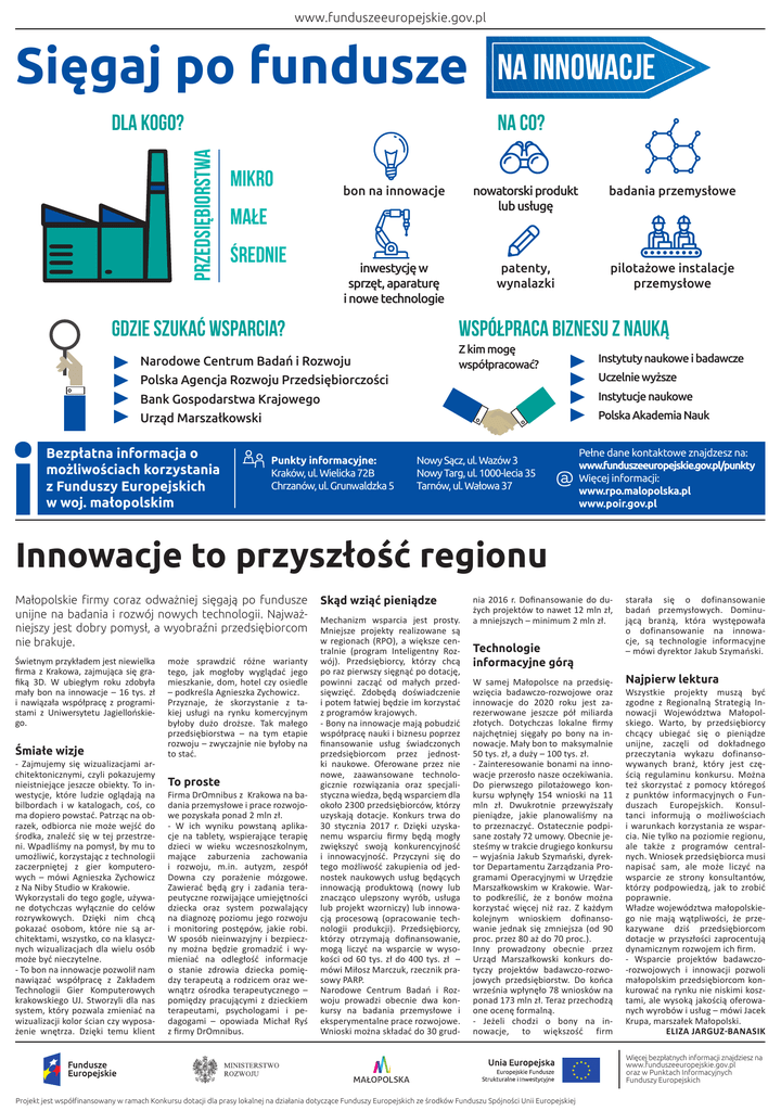www.funduszeeuropejskie.gov.pl Sięgaj po fundusze Dla kogo? na innowacje przedsiębiorstwa NA CO? Mikro bon na innowacje nowatorski produkt lub usługę badania przemysłowe inwestycję w sprzęt, aparaturę i nowe technologie patenty, wynalazki pilotażowe instalacje przemysłowe MaŁe Średnie Gdzie szukać wsparcia? WSPÓŁPRACA BIZNESu z nauką Z kim mogę współpracować? Narodowe Centrum Badań i Rozwoju Polska Agencja Rozwoju Przedsiębiorczości Bank Gospodarstwa Krajowego Urząd Marszałkowski Bezpłatna informacja o możliwościach korzystania z Funduszy Europejskich w woj. małopolskim Punkty informacyjne: Kraków, ul. Wielicka 72B Chrzanów, ul. Grunwaldzka 5 Instytuty naukowe i badawcze Uczelnie wyższe Instytucje naukowe Polska Akademia Nauk Nowy Sącz, ul. Wazów 3 Nowy Targ, ul. 1000-lecia 35 Tarnów, ul. Wałowa 37 Pełne dane kontaktowe znajdzesz na: www.funduszeeuropejskie.gov.pl/punkty Więcej informacji: www.rpo.malopolska.pl www.poir.gov.pl Innowacje to przyszłość regionu Małopolskie firmy coraz odważniej sięgają po fundusze unijne na badania i rozwój nowych technologii. Najważniejszy jest dobry pomysł, a wyobraźni przedsiębiorcom nie brakuje. Świetnym przykładem jest niewielka firma z Krakowa, zajmująca się grafiką 3D. W ubiegłym roku zdobyła mały bon na innowacje – 16 tys. zł i nawiązała współpracę z programistami z Uniwersytetu Jagiellońskiego. Śmiałe wizje - Zajmujemy się wizualizacjami architektonicznymi, czyli pokazujemy nieistniejące jeszcze obiekty. To inwestycje, które ludzie oglądają na bilbordach i w katalogach, coś, co ma dopiero powstać. Patrząc na obrazek, odbiorca nie może wejść do środka, znaleźć się w tej przestrzeni. Wpadliśmy na pomysł, by mu to umożliwić, korzystając z technologii zaczerpniętej z gier komputerowych – mówi Agnieszka Zychowicz z Na Niby Studio w Krakowie. Wykorzystali do tego gogle, używane dotychczas wyłącznie do celów rozrywkowych. Dzięki nim chcą pokazać osobom, które nie są architektami, wszystko, co na klasycznych wizualizacjach dla wielu osób może być nieczytelne. - To bon na innowacje pozwolił nam nawiązać współpracę z Zakładem Technologii Gier Komputerowych krakowskiego UJ. Stworzyli dla nas system, który pozwala zmieniać na wizualizacji kolor ścian czy wyposażenie wnętrza. Dzięki temu klient może sprawdzić różne warianty tego, jak mogłoby wyglądać jego mieszkanie, dom, hotel czy osiedle – podkreśla Agnieszka Zychowicz. Przyznaje, że skorzystanie z takiej usługi na rynku komercyjnym byłoby dużo droższe. Tak małego przedsiębiorstwa – na tym etapie rozwoju – zwyczajnie nie byłoby na to stać. To proste Firma DrOmnibus z Krakowa na badania przemysłowe i prace rozwojowe pozyskała ponad 2 mln zł. - W ich wyniku powstaną aplikacje na tablety, wspierające terapię dzieci w wieku wczesnoszkolnym, mające zaburzenia zachowania i rozwoju, m.in. autyzm, zespół Downa czy porażenie mózgowe. Zawierać będą gry i zadania terapeutyczne rozwijające umiejętności dziecka oraz system pozwalający na diagnozę poziomu jego rozwoju i monitoring postępów, jakie robi. W sposób nieinwazyjny i bezpieczny można będzie gromadzić i wymieniać na odległość informacje o stanie zdrowia dziecka pomiędzy terapeutą a rodzicem oraz wewnątrz ośrodka terapeutycznego – pomiędzy pracującymi z dzieckiem terapeutami, psychologami i pedagogami – opowiada Michał Ryś z firmy DrOmnibus. Skąd wziąć pieniądze Mechanizm wsparcia jest prosty. Mniejsze projekty realizowane są w regionach (RPO), a większe centralnie (program Inteligentny Rozwój). Przedsiębiorcy, którzy chcą po raz pierwszy sięgnąć po dotację, powinni zacząć od małych przedsięwzięć. Zdobędą doświadczenie i potem łatwiej będzie im korzystać z programów krajowych. - Bony na innowacje mają pobudzić współpracę nauki i biznesu poprzez finansowanie usług świadczonych przedsiębiorcom przez jednostki naukowe. Oferowane przez nie nowe, zaawansowane technologicznie rozwiązania oraz specjalistyczna wiedza, będą wsparciem dla około 2300 przedsiębiorców, którzy uzyskają dotacje. Konkurs trwa do 30 stycznia 2017 r. Dzięki uzyskanemu wsparciu firmy będą mogły zwiększyć swoją konkurencyjność i innowacyjność. Przyczyni się do tego możliwość zakupienia od jednostek naukowych usług będących innowacją produktową (nowy lub znacząco ulepszony wyrób, usługa lub projekt wzorniczy) lub innowacją procesową (opracowanie technologii produkcji). Przedsiębiorcy, którzy otrzymają dofinansowanie, mogą liczyć na wsparcie w wysokości od 60 tys. zł do 400 tys. zł – mówi Miłosz Marczuk, rzecznik prasowy PARP. Narodowe Centrum Badań i Rozwoju prowadzi obecnie dwa konkursy na badania przemysłowe i eksperymentalne prace rozwojowe. Wnioski można składać do 30 grud- nia 2016 r. Dofinansowanie do dużych projektów to nawet 12 mln zł, a mniejszych – minimum 2 mln zł. Technologie informacyjne górą W samej Małopolsce na przedsięwzięcia badawczo-rozwojowe oraz innowacje do 2020 roku jest zarezerwowane jeszcze pół miliarda złotych. Dotychczas lokalne firmy najchętniej sięgały po bony na innowacje. Mały bon to maksymalnie 50 tys. zł, a duży – 100 tys. zł. - Zainteresowanie bonami na innowacje przerosło nasze oczekiwania. Do pierwszego pilotażowego konkursu wpłynęły 154 wnioski na 11 mln zł. Dwukrotnie przewyższały pieniądze, jakie planowaliśmy na to przeznaczyć. Ostatecznie podpisane zostały 72 umowy. Obecnie jesteśmy w trakcie drugiego konkursu – wyjaśnia Jakub Szymański, dyrektor Departamentu Zarządzania Programami Operacyjnymi w Urzędzie Marszałkowskim w Krakowie. Warto podkreślić, że z bonów można korzystać więcej niż raz. Z każdym kolejnym wnioskiem dofinansowanie jednak się zmniejsza (od 90 proc. przez 80 aż do 70 proc.). Inny prowadzony obecnie przez Urząd Marszałkowski konku