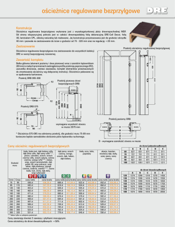 ościeżnice regulowane bezprzylgowe Konstrukcja Ościeżnica regulowana bezprzylgowa wykonana jest z wysokogatunkowej płyty drewnopochodnej MDF. Od strony ekspozycyjnej pokryta jest w całości drewnopodobną folią dekoracyjną DRE-Cell Decor, folią 3D, laminatem CPL, okleiną naturalną lub malowane. Jej konstrukcja przystosowana jest do grubości skrzydła 40 mm i pozwala na zastosowanie do ścian o grubości od 75 - 320 mm oraz na regulację +20 mm. Zastosowanie Przekrój ościeżnicy regulowanej bezprzylgowej Ościeżnica regulowana bezprzylgowa ma zastosowanie do wszystkich kolekcji DRE w wersji bezprzylgowej rozwiernej. 224 Zawartość kompletu 1717 630 Belka główna (element poziomy i dwa pionowe) wraz z szerokim kątownikiem (80 mm) o małych promieniach zaokrąglenia profilu przekroju poprzecznego (R2), uszczelka drzwiowa, zestaw zawiasów, komplet elementów przeznaczonych do zmontowania ościeżnicy wg dołączonej instrukcji. Ościeżnice pakowane są w opakowania kartonowe. Przekrój ORB 095-300 Przekrój pionowy drzwi R2 bezprzylgowych ORB R2 Przekrój ORB 075 Przekrój poziomy ORB wymagana wysokość otworu w murze 2079 mm * Ościeżnica 075-095 ma odmienny przekrój, dla grubości muru 75-89 mm konieczne będzie samodzielne skrócenie pióra kątownika ruchomego. D - wymagana szerokość otworu w murze Ceny ościeżnic regulowanych bezprzylgowych Grubość muru biały, biała mat, dąb bielony ryfla, dąb złoty ryfla, dąb szary ryfla***, jesion, calvados, orzech, orzech ciemny ryfla, orzech satyna, wiśnia ciemna, wenge ryfla***, heban, wiąz, orzech amerykański, dąb polski 3D, wiąz antracyt, wiąz tabac, dąb piaskowy, wenge ciemne, srebrna, wanilia***, sosna biała, buk, olcha, dąb złoty, wiąz syberyjski 3D Cmin Cmax 75 95 95 115 120 140 140 160 160 180 180 200 200 220 220 240 240 260 260 280 280 300 300 320 cena netto 436 zł 445 zł 453 zł 462 zł 471 zł 480 zł 489 zł 497 zł 506 zł 514 zł 523 zł 531 zł dąb jasny, orzech ciemny, wenge, orzech, dąb, heban, dąb bielony 3D cena brutto 536,28 zł 547,35 zł 557,19 zł 568,26 zł 579,33 zł 590,40 zł 601,47 zł 611,31 zł 622,38 zł 632,22 zł 643,29 zł 653,13 zł biały, ecru, latte, popielaty MALOWANE cena netto 608 zł 618 zł 628 zł 644 zł 660 zł 678 zł 694 zł 711 zł 728 zł 745 zł 762 zł 779 zł cena brutto cena netto 747,84 zł 522 zł 760,14 zł 534 zł 772,44 zł 545 zł 792,12 zł 557 zł 811,80 zł 568 zł 833,94 zł 579 zł 853,62 zł 591 zł 874,53 zł 602 zł 895,44 zł 613 zł 916,35 zł 623 zł 937,26 zł 634 zł 958,17 zł 646 zł ***dekor tylko w usłojeniu poziomym Ceny zawierają również 3 zawiasy z płytkami mocującymi. Cena ościeżnicy do drzwi dwuskrzydłowych: +50% akacja, kasztan, miodowy dąb, biały, szary jasny, szary ciemny MALOWANE cena brutto cena netto 642,06 zł 452 zł 656,82 zł 464 zł 670,35 zł 472 zł 685,11 zł 483 zł 698,64 zł 491 zł 712,17 zł 502 zł 726,93 zł 512 zł 740,46 zł 520 zł 753,99 zł 529 zł 766,29 zł 538 zł 779,82 zł 548 zł 794,58 zł 556 zł cena brutto 555,96 zł 570,72 zł 580,56 zł 594,09 zł 603,93 zł 617,46 zł 629,76 zł 639,60 zł 650,67 zł 661,74 zł 674,04 zł 683,88 zł 60 70 80 90 100 A 627 727 827 927 1027 do drzwi jednoskrzydłowych B C D E 651 671 711 811 751 771 811 911 851 871 911 1011 951 971 1011 1111 1051 1071 1111 1211 120 130 140 150 160 170 180 A 1274 1374 1474 1574 1674 1774 1874 do drzwi dwuskrzydłowych B C D E 1298 1318 1378 1458 1398 1418 1478 1558 1498 1518 1578 1658 1598 1618 1678 1758 1698 1718 1778 1858 1798 1818 1878 1958 1898 1918 1978 2058