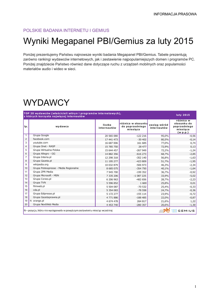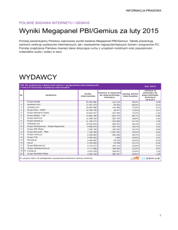 INFORMACJA PRASOWA POLSKIE BADANIA INTERNETU I GEMIUS Wyniki Megapanel PBI/Gemius za luty 2015 Poniżej prezentujemy Państwu najnowsze wyniki badania Megapanel PBI/Gemius. Tabele prezentują zarówno rankingi wydawców internetowych, jak i zestawienie najpopularniejszych domen i programów PC. Poniżej znajdziecie Państwo również dane dotyczące ruchu z urządzeń mobilnych oraz popularności materiałów audio i wideo w sieci. WYDAWCY T OP 20 wy d a wc ó w (wła śc ic ie li witry n i p ro gra m ó w inte rne to wy c h), z k tór y c h k o r zy sta na jwię c e j inte rna utó w luty 2015 1 Grupa Google # 20 565 080 -122 216 95,0% ró żnic a w sto sunk u do po prz e dnie go m ie sią c a (w p.p.) -0,56 2 facebook.com # 17 441 473 -30 402 80,5% -0,14 3 youtube.com # 16 687 006 161 685 77,0% 0,74 4 Grupa Onet - RASP # 15 785 750 28 477 72,9% 0,13 5 Grupa Wirtualna Polska # 15 644 457 -267 949 72,2% -1,24 6 Grupa Allegro - GG # 14 882 356 -616 273 68,7% -2,85 7 Grupa Interia.pl # 12 298 318 -352 140 56,8% -1,63 8 Grupa Gazeta.pl # 11 195 277 -423 809 51,7% -1,95 9 wikipedia.org # 10 032 879 -506 973 46,3% -2,34 10 Grupa Polskapresse - Media Regionalne # 8 685 075 -354 750 40,1% -1,64 11 Grupa ZPR Media # 7 945 700 -199 352 36,7% -0,92 12 Grupa Microsoft - MSN # 7 335 206 -1 087 225 33,9% -5,02 13 Grupa Ceneo.pl # 6 206 963 -482 656 28,7% -2,23 14 Grupa TVN # 5 596 852 1 669 25,8% 0,01 15 filmweb.pl # 5 504 087 -70 532 25,4% -0,33 16 cda.pl # 5 354 083 -78 558 24,7% -0,36 17 Grupa Edipresse.pl # 5 172 277 -155 114 23,9% -0,72 18 Grupa Gazetaprawna.pl # 4 771 886 -188 485 22,0% -0,87 # 4 674 478 264 817 21,6% 1,22 # 4 453 740 -280 357 20,6% -1,30 lp. 19 20 lic zba inte rna utów wy da wc a N orange.pl Grupa NextWeb Media ró ż nic a w sto sunk u za się g wśró d d o po pr ze dnie go inte r na utó w m ie sią c a N – pozycja, która nie występowała w powyższym zestawieniu miesiąc wcześniej 1 INFORMACJA PRASOWA T OP 20 wy da wc ów a udy towa ny c h (wła śc ic ie li a udy to wa ny c h witry n i pr ogra m ów inte rne towy c h)*, z k tór y c h k or zy sta na jwię c e j inte rna utów luty 2015 1 Grupa Onet - RASP # 15 785 750 28 477 72,9% różnic a w stosunk u do poprz e dnie go m ie sią c a (w p .p.) 0,13 2 Grupa Wirtualna Polska # 15 644 457 -267 949 72,2% -1,24 3 Grupa Allegro - GG # 14 882 356 -616 273 68,7% -2,85 4 Grupa Interia.pl # 12 298 318 -352 140 56,8% -1,63 5 Grupa Gazeta.pl # 11 195 277 -423 809 51,7% -1,95 6 Grupa Polskapresse - Media Regionalne # 8 685 075 -354 750 40,1% -1,64 7 Grupa ZPR Media # 7 945 700 -199 352 36,7% -0,92 8 Grupa Ceneo.pl # 6 206 963 -482 656 28,7% -2,23 9 Grupa TVN # 5 596 852 1 669 25,8% 0,01 10 11 filmweb.pl # # # -70 532 -78 558 25,4% 24,7% -0,33 -0,36 12 cda.pl Grupa Edipresse.pl 5 504 087 5 354 083 5 172 277 -155 114 23,9% -0,72 13 Grupa Gazetaprawna.pl # 4 771 886 -188 485 22,0% -0,87 14 Grupa NextWeb Media # 4 453 740 -280 357 20,6% -1,30 15 Grupa Cyfrowy Polsat # 3 889 829 -410 993 18,0% -1,90 16 Grupa Demotywatory.pl # 3 686 990 -348 065 17,0% -1,61 17 Grupa Panorama Firm # 3 618 781 -70 630 16,7% -0,32 18 Grupa TVP # 3 442 918 -502 487 15,9% -2,32 19 tekstowo.pl # 2 709 971 -166 842 12,5% -0,77 # 2 618 050 -38 575 12,1% -0,18 lp. 20 lic zba inte rna utów wy d a wc a N Grupa Bankier.pl róż nic a w stosunk u za się g wśród d o pop rze d nie go inte r na utów m ie sią c a *ranking obejmuje wydawców objętych audytem site-centric (dzięki skryptom badawczym wpiętym w kod stron www, ruch na witrynach należących do tych wydawców jest mierzony za pomocą pełnego zestawu wskaźników; inaczej jest w przypadku wydawców, którzy nie są objęci audytem i są mierzeni za pomocą dwóch wskaźników, tj. liczby internautów i zasięgu) N – pozycja, która nie występowała w powyższym zestawieniu miesiąc wcześniej T OP 20 wy d a wc ów a udy towa ny c h (wła śc ic ie li a udy towa ny c h witry n i pr ogra m ów inte r ne to wy c h)*, na k tór y c h inte rna uc i wy k onują na j wię c e j o dsłon z Polsk i lp. ods ło ny k ra jo we ogółe m wy d a wc a różnic a w stosunk u d o popr ze dnie go m ie s ią c a różnic a luty 2015 lic zba inte rna utów różnic a % 1 Grupa Allegro - GG** # 4 698 420 910 -709 462 384 -13,1% 14 882 356 2 Grupa Wirtualna Polska** # 4 048 585 498 -344 732 018 -7,8% 15 644 457 3 Grupa Onet - RASP** # 3 521 609 910 -31 211 094 -0,9% 15 785 750 4 Grupa Interia.pl # 1 187 634 846 -108 157 409 -8,3% 12 298 318 5 Grupa Gazeta.pl # 748 827 899 -64 523 769 -7,9% 11 195 277 6 Grupa Fotka.pl # 336 199 700 -24 296 542 -6,7% 1 591 142 7 Grupa Polskapresse - Media Regionalne** # 327 836 345 -56 418 169 -14,7% 8 685 075 8 Grupa Demotywatory.pl # 325 487 059 -42 416 069 -11,5% 3 686 990 9 filmweb.pl** # 242 734 549 -39 581 778 -14,0% 5 504 087 10 Grupa TVN** # 166 898 670 -9 540 172 -5,4% 5 596 852 11 cda.pl # 137 967 026 -13 963 467 -9,2% 5 354 083 12 bezuzyteczna.pl # 131 061 153 -12 275 938 -8,6% 2 226 702 13 Grupa ZPR Media** # 108 464 746 -7 111 519 -6,2% 7 945 700 14 ulub.pl # 99 339 369 10 941 231 12,4% 1 098 062 15 Grupa Edipresse.pl # 77 437 128 -7 023 197 -8,3% 5 172 277 16 Grupa Ceneo.pl # 76 531 706 -12 028 946 -13,6% 6 206 963 17 wiocha.pl # 76 200 927 -9 714 600 -11,3% 1 148 327 18 N wykop.pl # 67 892 110 -13,3% 1 822 975 -18,9% 3 889 829 -4,2% 1 827 526 19 Grupa Cyfrowy Polsat 0 64 291 113 -10 395 042 -15 011 130 20 Grupa Pracuj 0 56 389 129 -2 472 651 *ranking obejmuje wydawców objętych audytem site-centric (dzięki skryptom badawczym wpiętym w kod stron www, ruch na witrynach należących do tych wydawców jest mierzony za pomocą pełnego zestawu wskaźników; inaczej jest w przypadku wydawców, którzy nie są objęci audytem i są mierzeni za pomocą dwóch wskaźników, tj. liczby internautów i zasięgu) **wydawca korzysta z nowej definicji odsłony N – pozycja, która nie występowała w powyższym zestawieniu miesiąc wcześniej 2 INFORMACJA PRASOWA DOMENY T OP20 dom