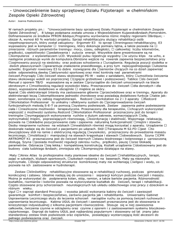 Zespół Opieki Zdrowotnej w Chełmnie - Unowocześnienie bazy sprzętowej Działu Fizjoterapii w chełmińskim Zespole Opieki Zdrowotnej Autor: Joanna Podkościelna W ramach projektu pn.: "Unowocześnienie bazy sprzętowej Działu Fizjoterapii w chełmińskim Zespole Opieki Zdrowotnej", 8 lutego podpisana została umowa z Województwem Kujawsko–Pomorskim. Dofinansowanie ze środków PFRON „Programu wyrównania różnic między regionami II” obszar A, wynosi 60 % wartości projektu. Sprzęt rehabilitacyjny służący rehabilitacji osób niepełnosprawnych, który został zakupiony: Ergometr E3 to sprzęt treningowo-rehabilitacyjny. E3 wyposażony jest w komputer treningowy, który dokonuje pomiaru tętna, a także pozwala na zmierzenie różnych parametrów treningu: mocy, czasu, odległości, całkowitej liczby kilometrów, prędkości, częstotliwości pedałowania i zużycia energii. Wszystkie dane prezentowane są na komputerze z wyświetlaczem LCD. Wysokość pulsu rejestruje wygodny w użyciu klips na ucho, a następnie przekazuje wynik do komputera.Obniżone wejście na rowerek zapewnia bezpieczeństwo przy zajmowaniu pozycji na siedzisku oraz podczas schodzenia z urządzenia. Regulacja pozycji siodełka w dwóch płaszczyznach gwarantuje znalezienie prawidłowego, a przy tym najwygodniejszego ułożenia sylwetki. Ergometr rowerowy E3 to dobre rozwiązanie dla seniorów chcących na co dzień zapewniać sobie odpowiednią dawkę aktywności sportowej oraz mieć kontrolę nad parametrami ćwiczeń.Przyrządy do ćwiczeń stawu skokowego PS-W - walec z sandałami, który umożliwia ćwiczenia stawu skokowego wokół osi poprzecznej (zgięcie grzbietowe i podeszwowe) Tablice do ćwiczeń Manual z oporem TB/O wyposażone są w zestaw przyrządów do ćwiczeń umocowanych na blacie obrotowym z możliwością regulacji wysokości blatu. Przeznaczone do ćwiczeń dla dorosłych i dla dzieci, wyposażone dodatkowo w obciążniki miękkie ze skóry. Aparat do elektroterapii Interdy ma zastosowanie głównie przeciwbólowe oraz w treningu. Aparaty do elektroterapii leczą skomplikowane jednostki chorobowe oraz posiadają dodatkowo funkcje takie jak: laser, sonoterapia czy zabieg magnetoterapii. Redcord workstation na 2 i 3 aparaty Redcord Workstation Professional to unikalny i efektywny system do przeprowadzenia ćwiczeń funkcjonalnych metodą S-E-T za pomocą systemu podwieszek. Zestaw zapewnia pełne podwieszenie ciała i niezliczone możliwości terapeutyczne. Przeznaczony dla terapeutów, chcących wykorzystać większość z możliwości systemu.Redcord Workstation Professional przeznaczony jest do terapii i treningów wymagających wykonywania ruchów o dużym zakresie, wzmacniających siłę, wytrzymałość mięśni, poprawiających równowagę, koordynację i stabilność. Wspomaga relaksację, pozwala na dokładne pozycjonowanie ciała i zapewnia naturalną funkcjonalność mięśni i stawów. Osoby niesprawne ruchowo na wózkach inwalidzkich również mogą korzystać z aparatu. Urządzenie doskonale nadaje się do ćwiczeń z pacjentami po udarach. Stół Terapeuta M S2.FO jest to dwuczęściowy stół na ramie z elektryczną regulacją wysokości, przeznaczony do prowadzenia masażu leczniczego, mobilizacji i manipulacji na stawach kręgosłupa i stawach obwodowych. Szyna CPM ARTROMOT K1 przeznaczona jest do ćwiczeń biernych stawu biodrowego i kolanowego z uproszczoną obsługą. Szyna posiada możliwość regulacji zakresu ruchu, prędkości, pauzę oraz blokadę parametrów. Odznacza się lekką i kompaktową konstrukcją. Kształt urządzenia dostosowany jest do budowy ciała ludzkiego – zmniejsza siły kompresyjne działające na stawy. Maty Airex Atlas to profesjonalne maty piankowe idealne do ćwiczeń rehabilitacyjnych, terapii, zajęć w szkołach, klubach sportowych, szkołach rodzenia i na basenach. Maty są niezwykle wytrzymałe. Dzięki odpowiedniej strukturze komórkowej maty nie wchłaniają wilgoci i wody, co pozwala na ich zastosowane w hydroterapii. Zestaw klinówKliny rehabilitacyjne stosowane są w rehabilitacji ruchowej, podczas gimnastyki korekcyjnej i zabawy. Idealnie nadają się do unoszenia i separacji kończyn podczas ćwiczeń i masażu. Można je wykorzystać do podpierania kolan, stóp, ramion, a także barków pacjenta. Różnorodność kształtów, rozmiarów i kolorów pozwala na wykorzystanie kształtek do ćwiczeń, terapii i rehabilitacji. Często stosowane przy schorzeniach neurologicznych lub układu oddechowego oraz pracy z dzieckiem w różnym wieku. Ugul + osprzęt standard Precyzja i wysoka jakość wykonania kabiny do ćwiczeń i zawieszeń gwarantuje komfort i bezpieczeństwo, zarówno pacjenta jak i rehabilitanta. Uniwersalny Gabinet Usprawniania Leczniczego służy do leczenia schorzeń narządów ruchu za pomocą ćwiczeń ruchowych i usprawniania leczniczego. Kabina UGUL do ćwiczeń i zawieszeń przeznaczona jest do stosowania w kinezyterapii indywidualnej z kilkoma pacjentami równocześnie. Stosuje się w niej zawieszenia całkowite, ćwiczenia czynne w odciążeniu oraz czynne z oporem i z zastosowaniem systemu bloczkowociężarkowego. Osprzęt do kabiny UGUL jest najbardziej popularnym i stosowany od lat znany jako standardowy zestaw linek podwieszek oraz ciężarków, posiadający wystarczającą ilość akcesorii do pełnego podwieszenia oraz ćwiczeń. http://www.zoz.chelmno.pl/zoz Kreator PDF Utworzono 2 March, 2017, 16:56 Zespół Opieki Zdrowotnej w Chełmnie Parawan 3-częściowyParawany służą do zapewnienia pacjentowi godnych warunków i intymności podczas przeprowadzania procedur medycznych, w tym: podczas przebierania się, przeprowadzania badań, oględzin, itp. Wykonanie gwarantuje stabilność, a dzięki gumowanym kółkom pod stopkami parawan łatwo jest złożyć lub przestawić. Stół rehabilitacyjny M-S7.FO to stół do masażu i rehabilitacji z elektryczną regulacją wysokości. Przeznaczony 