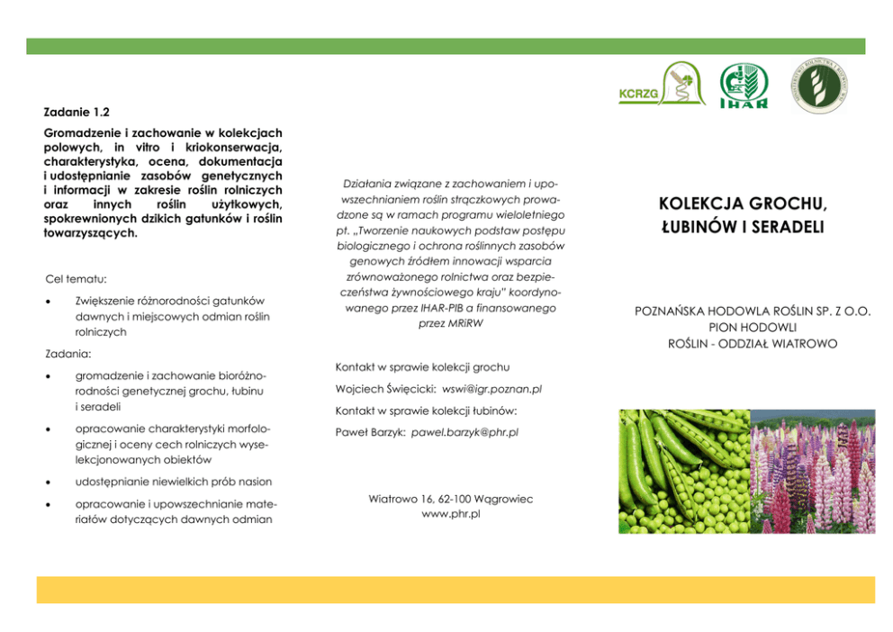 Zadanie 1.2 Gromadzenie i zachowanie w kolekcjach polowych, in vitro i kriokonserwacja, charakterystyka, ocena, dokumentacja i udostępnianie zasobów genetycznych i informacji w zakresie roślin rolniczych oraz innych roślin użytkowych, spokrewnionych dzikich gatunków i roślin towarzyszących. Cel tematu: Zwiększenie różnorodności gatunków dawnych i miejscowych odmian roślin rolniczych Działania związane z zachowaniem i upowszechnianiem roślin strączkowych prowadzone są w ramach programu wieloletniego pt. „Tworzenie naukowych podstaw postępu biologicznego i ochrona roślinnych zasobów genowych źródłem innowacji wsparcia zrównoważonego rolnictwa oraz bezpieczeństwa żywnościowego kraju” koordynowanego przez IHAR-PIB a finansowanego przez MRiRW Zadania: gromadzenie i zachowanie bioróżnorodności genetycznej grochu, łubinu i seradeli opracowanie charakterystyki morfologicznej i oceny cech rolniczych wyselekcjonowanych obiektów udostępnianie niewielkich prób nasion opracowanie i upowszechnianie materiałów dotyczących dawnych odmian Kontakt w sprawie kolekcji grochu Wojciech Święcicki: [email protected] Kontakt w sprawie kolekcji łubinów: Paweł Barzyk: [email protected] Wiatrowo 16, 62-100 Wągrowiec www.phr.pl KOLEKCJA GROCHU, ŁUBINÓW I SERADELI POZNAŃSKA HODOWLA ROŚLIN SP. Z O.O. PION HODOWLI ROŚLIN - ODDZIAŁ WIATROWO KOLEKCJA GROCHU KOLEKCJA ŁUBINÓW Łubin żółty JANTAR W kolekcji zgromadzono około 3 tys. obiektów z rodzaju Pisum, w tym dzikie gatunki i populacje oraz stare i nowe odmiany reprezentujące wszystkie kierunki użytkowania grochu. Szczególną wartość ma tzw. bank genów w którym zgromadzono linie typowe dla genów o znanych funkcjach, sposobie dziedziczenia i lokalizacji na chromosomach. Ta część kolekcji ma szczególne znaczenie edukacyjne, a także dla hodowli roślin. W kolekcji znajduje się ponad 1,2 tys. obiektów z rodzaju Lupinus - są to dawne odmiany gatunków uprawnych (łubin żółty, łubin wąskolistny i łubin biały) oraz formy dzikie należące do ponad 20 gatunków. Stare odmiany są nadal uprawiane ze względu na walory użytkowe takie jak odporność na choroby czy wysoki plon zielonej masy (tradycyjna uprawa na zielony nawóz). Materiały kolekcyjne łubinu, w tym i dzikie gatunki, bywają rozmnażane i uprawiane jako formy ozdobne. Formy uprawne, jak i dzikie z kolekcji służą jako dodatkowy materiał genetyczny dla hodowli w celu poszerzenia zmienności genetycznej. Bardzo często materiały kolekcyjne są wykorzystywane przez instytucje naukowobadawcze do badań o charakterze podstawowym i wdrożeniowym, zmierzających do poznania i lepszego wykorzystania potencjału tkwiącego w zasobach genetycznych łubinów. Dawna odmiana łubinu żółtego wyhodowana w Poznańskiej Hodowli Roślin Sp. z o. o. W rejestrze odmian w latach 1974-1981. Odmiana ta wyróżniała się wysokim plonem zielonej masy i była uprawiana często na zielony nawóz. Dobrze przystosowana do wegetacji na glebach lekkich, piaszczystych. Z czasem została zastąpiona przez nowsze odmiany bardziej uniwersalne w użytkowaniu, czyli zielonkowo-nasienne i nasienne, o obniżonym poziomie alkaloidów. Obecnie bywa na nowo rozmnażana i wykorzystywana w praktyce rolniczej, dzięki rozwojowi upraw o walorach ekologicznych. gen fas, b gen uni
