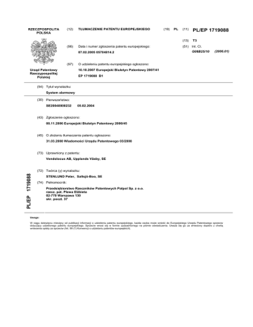 RZECZPOSPOLITA POLSKA (12) (96) TŁUMACZENIE PATENTU EUROPEJSKIEGO Data i numer zgłoszenia patentu europejskiego: 07.02.2005 05704814.2 (97) Urząd Patentowy Rzeczypospolitej Polskiej (19) PL (11) PL/EP 1719088 (13) T3 (51) Int. Cl. G08B25/10 (2006.01) O udzieleniu patentu europejskiego ogłoszono: 10.10.2007 Europejski Biuletyn Patentowy 2007/41 EP 1719088 B1 (54) Tytuł wynalazku: System alarmowy (30) Pierwszeństwo: SE20040000232 05.02.2004 (43) Zgłoszenie ogłoszono: 08.11.2006 Europejski Biuletyn Patentowy 2006/45 (45) O złożeniu tłumaczenia patentu ogłoszono: 31.03.2008 Wiadomości Urzędu Patentowego 03/2008 (73) Uprawniony z patentu: Vendolocus AB, Upplands Väsby, SE PL/EP 1719088 (72) Twórca (y) wynalazku: STENLUND Peter, Saltsjö-Boo, SE (74) Pełnomocnik: Przedsiębiorstwo Rzeczników Patentowych Patpol Sp. z o.o. rzecz. pat. Plewa Elżbieta 02-770 Warszawa 130 skr. poczt. 37 Uwaga: W ciągu dziewięciu miesięcy od publikacji informacji o udzieleniu patentu europejskiego, każda osoba może wnieść do Europejskiego Urzędu Patentowego sprzeciw dotyczący udzielonego patentu europejskiego. Sprzeciw wnosi się w formie uzasadnionego na piśmie oświadczenia. Uważa się go za wniesiony dopiero z chwilą wniesienia opłaty za sprzeciw (Art. 99 (1) Konwencji o udzielaniu patentów europejskich). V1492PL00/PE EP 1 719 088 B1 System alarmowy Dziedzina wynalazku [0001] Przedmiotowy wynalazek dotyczy, zgodnie z pierwszym aspektem, systemu alarmowego przeznaczonego do uruchamiania sygnału alarmowego po wystąpieniu odchylenia, od co najmniej jednego, zależnego od otoczenia stanu odniesienia, uprzednio określonego dla danego otoczenia. [0002] Zgodnie z drugim aspektem, przedmiotowy wynalazek dotyczy sposobu uruchamiania sygnału alarmowego za pomocą systemu alarmowego. [0003] Zgodnie z trzecim aspektem, przedmiotowy wynalazek dotyczy, co najmniej jednego, produktu oprogramowania komputerowego do uruchamiania sygnału alarmowego. Tło wynalazku [0004] nieruchomym Dokument pojeździe US-B1-6,639,512 mechanicznym, ujawnia zwłaszcza system do samotnych ochrony dzieci i pasażerów zwierząt, w przed niebezpiecznymi stanami, które występują we wnętrzu pojazdu. System ten zawiera czujnik, który wykrywa niebezpieczne stany otoczenia, takie jak wysokie temperatury w pojeździe. W korzystnym przykładzie realizacji czujnik ten jest stosowany razem z nadajnikiem do ciągłego nadawania dźwięku wykrywanego we wnętrzu kabiny pasażerskiej pojazdu, jak również przesyłania informacji o wystąpieniu jakichkolwiek stanów niebezpiecznych do osoby znajdującej się w pewnej odległości. W drugim przykładzie realizacji, stany niebezpieczne wyzwalają alarm związany z pojazdem. Alarm wzmacnia dźwięk wykrywany w pojeździe, taki jak płacz dziecka lub szczekanie psa, oraz generuje standardowy dźwięk alarmowy naprzemiennie ze wzmocnionym komunikatem głosowym wyjaśniającym stan niebezpieczny, a także wzmacnia dźwięk we wnętrzu pojazdu, taki jak płacz dziecka. Trzeci przykład realizacji wynalazku zawiera moduł ostrzegania otoczenia, który może być zamocowany do telefonu bezprzewodowego. Gdy zostanie wykryty stan niebezpieczny, moduł wykorzystuje telefon bezprzewodowy do zgłoszenia wiadomości do osoby znajdującej się w odległości. Wiadomość ta może być przesłana za pośrednictwem innego telefonu lub za pośrednictwem pagera. [0005] Wadą wyżej wymienionego, znanego systemu jest to, że nie jest to rozwiązanie elastyczne. Rozwiązanie to dotyczy jedynie wykrywania stanów zagrożenia w nieruchomym pojeździe. Drugą wadą jest to, że system ten nie jest dynamiczny i nie może być automatycznie aktualizowany. [0006] Dokument US-B1-6,441,731 ujawnia przenośny system alarmowy do stosowania w mieszkaniu, na łodzi, w biurze albo w jakiejkolwiek innej budowli, która może korzystać z nadzoru ochrony. Ten przenośny system alarmowy 10 jest zawarty w przenośnej obudowie 12. System alarmowy 10 zawiera panel klawiatury 14 połączony z mikroprocesorem 20. Panel klawiatury 14 może, między innymi, być stosowany do programowania systemu alarmowego 10 zgodnie ze specyficznymi potrzebami użytkownika. Korzystnie, w obudowie 12 jest zastosowana lampka -2odmierzania czasu 16. System alarmowy 10 może inicjować połączenia do stanowiska nadzoru ochrony za pomocą, na przykład techniki bezprzewodowej. Ten system alarmowy 10 może również zawierać czujnik wibracji/uderzenia, w celu uruchamiania funkcji alarmu, jeżeli urządzenie przenośne zostanie przemieszczone lub, gdy czynione są usiłowania zniszczenia tego urządzenia przenośnego. [0007] Wadą wyżej wymienionego znanego systemem alarmowego jest to, że zajmuje on stosunkowo dużo miejsca, ponieważ, między innymi, zawiera on między innymi panel klawiatury. Kolejną wadą jest to, że ten system alarmowy nie jest dynamiczny i nie może być automatycznie aktualizowany. [0008] Znane rozwiązania, wskazane powyżej, są częściowo albo całkowicie nieprzydatne z powodu wad wymienionych poniżej. - Wymagają one znacznych powierzchni i nie mogą być umieszczane opcjonalnie. - Rozwiązania te są drogie. - Nie mogą być sterowane opcjonalnie ze stacjonarnego lub mobilnego telefonu, albo z urządzenia radiowego. - Nie wskazują położenia. - Nie mają one tak zwanej „funkcji czarnej skrzynki”. - Nie zawierają one żadnej bazy danych. - Rozwiązania te nie są dynamiczne czy interaktywne i nie mogą być sterowane za pośrednictwem sieci lub WAP. - Rozwiązania te zawierają przyciski i/lub wyświetlacze, które czynią je droższymi i stanowią źródła błędu, a także czynią trudniejszymi dla użytkowników. - Rozwiązania są trudne lub niemożliwe do zamontowanie w instalacjach ukrytych, w dowolnie dobranym otoczeniu. - Nie ma uniwersalnego rozwiązania standardowego do zastosowań mobilnych lub stacjonarnych, które byłoby przeznaczone do np. zliczania impulsów, pomiaru wibracji, w