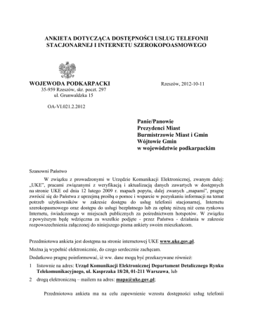 ANKIETA DOTYCZĄCA DOSTĘPNOŚCI USŁUG TELEFONII STACJONARNEJ I INTERNETU SZEROKOPOASMOWEGO Rzeszów, 2012-10-11 WOJEWODA PODKARPACKI 35-959 Rzeszów, skr. poczt. 297 ul. Grunwaldzka 15 OA-VI.021.2.2012 Panie/Panowie Prezydenci Miast Burmistrzowie Miast i Gmin Wójtowie Gmin w województwie podkarpackim Szanowni Państwo W związku z prowadzonymi w Urzędzie Komunikacji Elektronicznej, zwanym dalej: „UKE”, pracami związanymi z weryfikacją i aktualizacją danych zawartych w dostępnych na stronie UKE od dnia 12 lutego 2009 r. mapach popytu, dalej zwanych „mapami”, pragnę zwrócić się do Państwa z uprzejmą prośbą o pomoc i wsparcie w pozyskaniu informacji na temat potrzeb użytkowników w zakresie dostępu do usług telefonii stacjonarnej, Internetu szerokopasmowego oraz dostępu do usługi bezpłatnego lub za opłatę niższą niż cena rynkowa Internetu, świadczonego w miejscach publicznych za pośrednictwem hotspotów. W związku z powyższym będę wdzięczna za wszelkie podjęte - przez Państwa - działania w zakresie rozpowszechnienia załączonej do niniejszego pisma ankiety swoim mieszkańcom. Przedmiotowa ankieta jest dostępna na stronie internetowej UKE www.uke.gov.pl. Można ją wypełnić elektronicznie, do czego serdecznie zachęcam. Dodatkowo pragnę poinformować, iż ww. dane mogą być przekazywane również: 1 listownie na adres: Urząd Komunikacji Elektronicznej Departament Detalicznego Rynku Telekomunikacyjnego, ul. Kasprzaka 18/20, 01-211 Warszawa, lub 2 drogą elektroniczną – mailem na adres: [email protected]; Przedmiotowa ankieta ma na celu zapewnienie wzrostu dostępności usług telefonii stacjonarnej oraz Internetu szerokopasmowego dla społeczeństwa, jak również podnoszenie świadomości społecznej w zakresie możliwości korzystania z bezpłatnego lub za opłatę niższą niż cena rynkowa dostępu do Internetu. Każda wypełniona i przesłana do UKE ankieta (czy to na piśmie, czy też w formie elektronicznej), zawierająca informację o zapotrzebowaniu na wspomniane powyżej usługi, znajdzie swoje odzwierciedlenie w mapach popytu i będzie stanowiła cenną informacją o obszarach, gdzie popyt na te usługi istnieje i pomimo dynamicznie rozwijającego się z roku na rok polskiego rynku telekomunikacyjnego – jest on w dalszym ciągu niezaspokojony. W przypadku pytań lub wątpliwości proszę kontaktować się z pracownikami Urzędu Komunikacji Elektronicznej pod numerem: (22) 53 49 182. Załączniki: 1. Ankieta WOJEWODA PODKARPACKI Dokument podpisany bezpiecznym podpisem elektronicznym Małgorzata Chomycz-Śmigielska