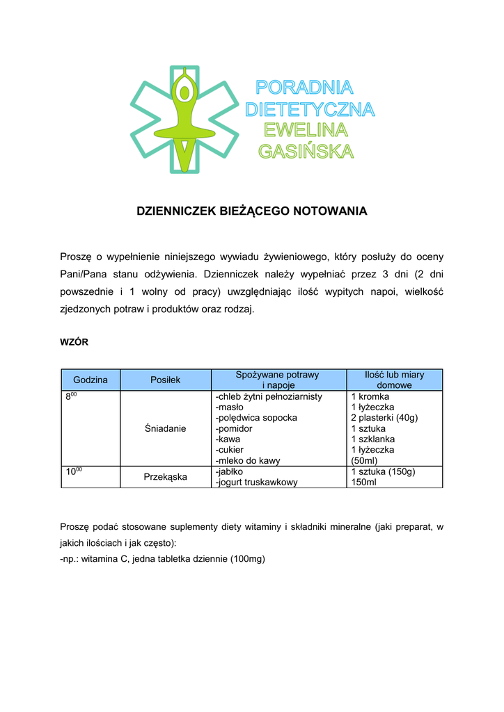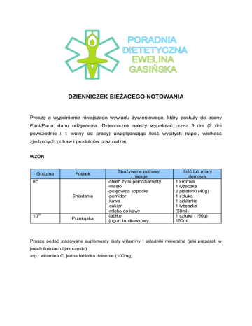 DZIENNICZEK BIEŻĄCEGO NOTOWANIA Proszę o wypełnienie niniejszego wywiadu żywieniowego, który posłuży do oceny Pani/Pana stanu odżywienia. Dzienniczek należy wypełniać przez 3 dni (2 dni powszednie i 1 wolny od pracy) uwzględniając ilość wypitych napoi, wielkość zjedzonych potraw i produktów oraz rodzaj. WZÓR Godzina Posiłek 800 Śniadanie 1000 Przekąska Spożywane potrawy i napoje -chleb żytni pełnoziarnisty -masło -polędwica sopocka -pomidor -kawa -cukier -mleko do kawy -jabłko -jogurt truskawkowy Ilość lub miary domowe 1 kromka 1 łyżeczka 2 plasterki (40g) 1 sztuka 1 szklanka 1 łyżeczka (50ml) 1 sztuka (150g) 150ml Proszę podać stosowane suplementy diety witaminy i składniki mineralne (jaki preparat, w jakich ilościach i jak często): -np.: witamina C, jedna tabletka dziennie (100mg) Dzień 1 Godzina Posiłek Spożywane potrawy i napoje Ilość lub miary domowe Śniadanie Przekąska Obiad Przekąska Kolacja Przekąska Proszę podać stosowane suplementy diety witaminy i składniki mineralne (jaki preparat, w jakich ilościach i jak często): Dzień 2 Godzina Posiłek Spożywane potrawy i napoje Ilość lub miary domowe Śniadanie Przekąska Obiad Przekąska Kolacja Przekąska Proszę podać stosowane suplementy diety witaminy i składniki mineralne (jaki preparat, w jakich ilościach i jak często): Dzień 3 Godzina Posiłek Spożywane potrawy i napoje Ilość lub miary domowe Śniadanie Przekąska Obiad Przekąska Kolacja Przekąska Proszę podać stosowane suplementy diety witaminy i składniki mineralne (jaki preparat, w jakich ilościach i jak często):