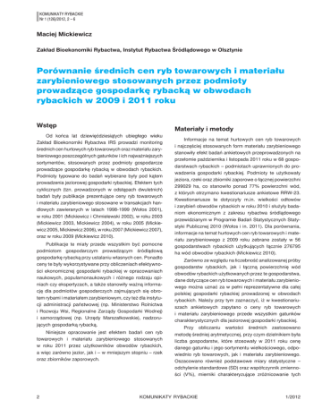 KOMUNIKATY RYBACKIE Nr 1 (126)/2012, 2 – 6 Maciej Mickiewicz Zak³ad Bioekonomiki Rybactwa, Instytut Rybactwa Œródl¹dowego w Olsztynie Porównanie œrednich cen ryb towarowych i materia³u zarybieniowego stosowanych przez podmioty prowadz¹ce gospodarkê ryback¹ w obwodach rybackich w 2009 i 2011 roku Wstêp Materia³y i metody Od koñca lat dziewiêædziesi¹tych ubieg³ego wieku Zak³ad Bioekonomiki Rybactwa IRS prowadzi monitoring œrednich cen hurtowych ryb towarowych oraz materia³u zarybieniowego poszczególnych gatunków i ich najwa¿niejszych sortymentów, stosowanych przez podmioty gospodarcze prowadz¹ce gospodarkê ryback¹ w obwodach rybackich. Podmioty typowane do badañ wybierane by³y pod k¹tem prowadzenia jeziorowej gospodarki rybackiej. Efektem tych cyklicznych (tzn. prowadzonych w odstêpach dwuletnich) badañ by³y publikacje prezentuj¹ce ceny ryb towarowych i materia³u zarybieniowego stosowane w transakcjach handlowych zawieranych w latach 1998-1999 (Wo³os 2001), w roku 2001 (Mickiewicz i Chmielewski 2002), w roku 2003 (Mickiewicz 2003, Mickiewicz 2004), w roku 2005 (Mickiewicz 2005, Mickiewicz 2006), w roku 2007 (Mickiewicz 2007), oraz w roku 2009 (Mickiewicz 2010). Informacje na temat hurtowych cen ryb towarowych i najczêœciej stosowanych form materia³u zarybieniowego stanowi³y efekt badañ ankietowych przeprowadzonych na prze³omie paŸdziernika i listopada 2011 roku w 68 gospodarstwach rybackich – podmiotach uprawnionych do prowadzenia gospodarki rybackiej. Podmioty te u¿ytkowa³y jeziora, rzeki oraz zbiorniki zaporowe o ³¹cznej powierzchni 299029 ha, co stanowi³o ponad 77% powierzchni wód, z których otrzymano kwestionariusze ankietowe RRW-23. Kwestionariusze te dotyczy³y m.in. wielkoœci od³owów i zarybieñ obwodów rybackich w roku 2010 i s³u¿y³y badaniom ekonomicznym z zakresu rybactwa œródl¹dowego przewidzianym w Programie Badañ Statystycznych Statystyki Publicznej 2010 (Wo³os i in. 2011). Dla porównania, informacje na temat hurtowych cen ryb towarowych i materia³u zarybieniowego z 2009 roku zebrane zosta³y w 56 Publikacje te mia³y przede wszystkim byæ pomocne podmiotom gospodarczym prowadz¹cym œródl¹dow¹ gospodarkê ryback¹ przy ustalaniu w³asnych cen. Ponadto ceny te by³y wykorzystywane przy obliczeniach efektywnoœci ekonomicznej gospodarki rybackiej w opracowaniach naukowych, popularnonaukowych i ró¿nego rodzaju opiniach czy ekspertyzach, a tak¿e stanowi³y wa¿n¹ informacjê dla podmiotów gospodarczych zajmuj¹cych siê obrotem rybami i materia³em zarybieniowym, czy te¿ dla instytucji administracji pañstwowej (np. Ministerstwo Rolnictwa i Rozwoju Wsi, Regionalne Zarz¹dy Gospodarki Wodnej) i samorz¹dowej (np. Urzêdy Marsza³kowskie), nadzoruj¹cych gospodark¹ ryback¹. gospodarstwach rybackich u¿ytkuj¹cych ³¹cznie 276795 ha wód obwodów rybackich (Mickiewicz 2010). Zarówno ze wzglêdu na liczebnoœæ analizowanej próby gospodarstw rybackich, jak i ³¹czn¹ powierzchniê wód obwodów rybackich u¿ytkowanych przez te gospodarstwa, dane dotycz¹ce cen ryb towarowych i materia³u zarybieniowego mo¿na uznaæ za w pe³ni reprezentatywne dla ca³ej polskiej gospodarki rybackiej prowadzonej w obwodach rybackich. Nale¿y przy tym zaznaczyæ, i¿ w kwestionariuszach ankietowych zapytano o ceny ryb towarowych i materia³u zarybieniowego przede wszystkim gatunków charakterystycznych dla jeziorowej gospodarki rybackiej. Przy obliczaniu wartoœci œrednich zastosowano Niniejsze opracowanie jest efektem badañ cen ryb metodê œredniej arytmetycznej, przy czym dzielnikiem by³a towarowych i materia³u zarybieniowego stosowanych liczba gospodarstw, które stosowa³y w 2011 roku cenê w roku 2011 przez u¿ytkowników obwodów rybackich, danego gatunku i jego sortymentu wielkoœciowego, odpo- a wiêc zarówno jezior, jak i – w mniejszym stopniu – rzek wiednio ryb towarowych, jak i materia³u zarybieniowego. oraz zbiorników zaporowych. Oszacowano równie¿ podstawowe miary statystyczne – odchylenie standardowe (SD) oraz wspó³czynnik zmiennoœci (V%), mierniki charakteryzuj¹ce zró¿nicowanie tych 2 KOMUNIKATY RYBACKIE 1/2012 œrednich. Wzrost lub spadek porównywanych œrednich cen karskiego). Czêœæ gospodarstw dzia³a w rejonach o mniej- ryb i materia³u zarybieniowego z 2009 roku i z 2011 roku szej konkurencji ze strony innych producentów danych okreœlono wartoœci¹ bezwzglêdn¹ (z³/kg) oraz wyra¿ono gatunków/sortymentów ryb, a zatem mog¹ one ustalaæ spadkiem lub wzrostem ceny z roku 2011 (w %) w stosunku relatywnie wy¿sze ceny, ni¿ w rejonach, gdzie dzia³a kilka do ceny z roku 2009 uznanej za 100%. gospodarstw o zbli¿onym profilu produkcji. Do wymienio- Uzyskane wyniki porównano ze œrednimi cenami hurto- nych przyczyn szerokiego zakresu cen ryb towarowych zali- wymi ryb towarowych i materia³u zarybieniowego stosowanych w gospodarstwach rybackich w 2009 roku (Mickiewicz czyæ mo¿na te¿ ró¿nice w wielkoœci po³owów poszczegól- 2010). po³awiaj¹ce do kilkudziesiêciu kilogramów siei rocznie nych gatunków czy sortymentów ryb. Gospodarstwo mo¿e prowadziæ jej sprzeda¿ po stosunkowo wy¿szych Wyniki i dyskusja cenach, ni¿ gospodarstwo ³owi¹ce kilka ton siei rocznie. Inn¹ przyczyn¹ mog¹ byæ ró¿ne regionalne tradycje kulinarne. W regionie, gdzie tradycyjnie stynka s³ynie ze swoich Œrednie hurtowe ceny ryb towarowych w roku 2011 walorów kulinarnych, warto jest dokonywaæ jej po³owów, Œrednie hurtowe ceny ryb od³awianych przez bada- a tak¿e ³atwiej jest j¹ sprzedaæ po wy¿szej cenie. Ostatni¹ nych u¿ytkowników obwodów rybackich charakteryzowa³ zmienn¹ wp³ywaj¹c¹ na ceny ryb mog¹ byæ czynniki du¿y zakres wartoœci (tab. 1). losowe, klimatyczne, zwi¹zane z por¹ roku dokonania od³owu danego gatunku/sortymentu, a zw³aszcza jego jedTABELA 1 Œrednie ceny hurtowe ryb towarowych, stosowane w 2011 roku, obliczone na podstawie informacji podanyc
