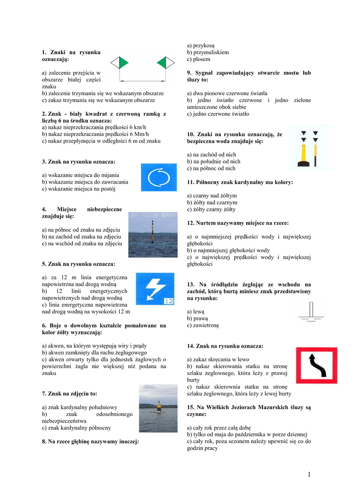 1. Znaki na rysunku oznaczają: a) zalecenie przejścia w obszarze białej części znaku b) zalecenie trzymania się we wskazanym obszarze c) zakaz trzymania się we wskazanym obszarze 2. Znak - biały kwadrat z czerwoną ramką z liczbą 6 na środku oznacza: a) nakaz nieprzekraczania prędkości 6 km/h b) nakaz nieprzekraczania prędkości 6 Mm/h c) nakaz przepłynięcia w odległości 6 m od znaku a) przykosą b) przymuliskiem c) plosem 9. Sygnał zapowiadający otwarcie mostu lub śluzy to: a) dwa pionowe czerwone światła b) jedno światło czerwone i jedno zielone umieszczone obok siebie c) jedno czerwone światło 10. Znaki na rysunku oznaczają, że bezpieczna woda znajduje się: 3. Znak na rysunku oznacza: a) na zachód od nich b) na południe od nich c) na północ od nich a) wskazanie miejsca do mijania b) wskazanie miejsca do zawracania c) wskazanie miejsca na postój 11. Północny znak kardynalny ma kolory: 4. Miejsce znajduje się: niebezpieczne a) czarny nad żółtym b) żółty nad czarnym c) żółty czarny żółty 12. Nurtem nazywamy miejsce na rzece: a) na północ od znaku na zdjęciu b) na zachód od znaku na zdjęciu c) na wschód od znaku na zdjęciu 5. Znak na rysunku oznacza: a) za 12 m linia energetyczna napowietrzna nad drogą wodną b) 12 linii energetycznych napowietrznych nad drogą wodną c) linia energetyczna napowietrzna nad drogą wodną na wysokości 12 m 6. Boje o dowolnym kształcie pomalowane na kolor żółty wyznaczają: a) akwen, na którym występują wiry i prądy b) akwen zamknięty dla ruchu żeglugowego c) akwen otwarty tylko dla jednostek żaglowych o powierzchni żagla nie większej niż podana na znaku 7. Znak na zdjęciu to: a) znak kardynalny południowy b) znak odosobnionego niebezpieczeństwa c) znak kardynalny północny 8. Na rzece głębinę nazywamy inaczej: a) o najmniejszej prędkości wody i największej głębokości b) o najmniejszej głębokości wody c) o największej prędkości wody i największej głębokości 13. Na śródlądziu żeglując ze wschodu na zachód, którą burtą miniesz znak przedstawiony na rysunku: a) lewą b) prawą c) zawietrzną 14. Znak na rysunku oznacza: a) zakaz skręcania w lewo b) nakaz skierowania statku na stronę szlaku żeglownego, która leży z prawej burty c) nakaz skierownia statku na stronę szlaku żeglownego, która leży z lewej burty 15. Na Wielkich Jeziorach Mazurskich śluzy są czynne: a) cały rok przez całą dobę b) tylko od maja do października w porze dziennej c) cały rok, poza sezonem należy upewnić się co do godzin pracy 1 16. Płynąc rzeką w kierunku w górę, którą burtą miniesz znak przedstawiony na rysunku: b) odosobnione niebezpieczeństwo c) bezpieczną wodę 24. Do śluzy wpływamy zgodnie z: a) lewą b) zawietrzną c) prawą a) kolejnością przybycia b) kolejnością przybycia i prawem pierwszeństwa c) prawem drogi 17. Znak na rysunku oznacza: a) zezwolenie na ruch żeglugowy tylko statków sportowych b) zezwolenie na ruch żeglugowy tylko małych statków sportowych c) zezwolenie na ruch żeglugowy statków sportowych i turystycznych oraz małych statków 25. Znak na rysunku oraz światła czerwone nad białym oznaczają: a) zakaz przejścia b) zakaz cumowania c) zakaz wytwarzania fali 26. Znak na rysunku oznacza: 18. W śluzie cumujemy: a) węzłem cumowym żeglarskim b) na biegowo, cały czas kontrolując napięcie liny c) węzłem palowym podwójnym 19. Płynąc rzeką w kierunku w dół, którą burtą miniesz znaki przedstawione na rysunku: a) nawietrzną b) prawą c) lewą 20. Wejście do kanału oznakowane jest za pomocą: a) zielonej tablicy w kształcie rombu b) ażurowej białej tablicy w kształcie rombu c) kwadratu pomalowanego w pasy czerwony biały czerwony 21. Boje w kolorze żółtym umieszczone w bliskiej od siebie odległości oznaczają: a) miejsce połowu b) miejsce niebezpieczne c) miejsce zamknięte dla żeglugi 22. Przepływając przez kanał należy: a) płynąć jak najszybciej b) trzymać się prawej strony kanału i zachować bezpieczną prędkość c) czekać na większą ilość jachtów aby z nimi przepłynąć 23. Znaki na rysunku oznaczają: a) miejsca niebezpieczne na środku drogi wodnej a) zakaz wodowania i wciągania statków na brzeg b) zakaz postoju statków o długości powyżej 7 m c) zakaz korzystania z pochylni 27. Farwater jest to: a) uregulowany odcinek rzeki b) ślad na wodzie po płynącym statku c) szlak żeglowny 28. W Polsce przejście przez śluzy jest: a) bezpłatne b) płatne c) płatne tylko kartą 29. Przedstawiony na rysunku znak spotkany na jeziorze oznacza: a) granicę lewej strony szlaku żeglownego b) rozgałęzienie szlaku żeglownego c) granicę prawej strony szlaku żeglownego 30. Znak na rysunku oznacza: a) zezwolenie na ruch żeglugowy statków o napędzie mechanicznym b) zezwolenie na ruch statków żaglowych c) zezwolenie na ruch żeglugowy statków żeglujących na samym grocie 31. Boja kulista, w pasy poziome czerwono-zielone oznacza: a) prawą stronę szlaku żeglownego (w kursie na zachód) b) rozgałęzienie szlaku żeglownego 2 c) miejsce, w którym można rzucić kotwicę (kotwicowisko) 32. Niebieski znak z białą błyskawicą i cyfrą arabską w lewym dolnym rogu oznacza: a) zagrożenie burzami z wyładowaniami atmosferycznymi b) linie wysokiego napięcia c) miejsce gdzie można naładować akumulatory 33. Budowla wodna piętrząca wodę to: a) ostroga b) jaz c) pirs 34. Znaki na rysunku oznaczają, że przeszkoda znajduje się: a) na wschód od nich b) na zachód od nich c) na północ od nich rozgałęzienia szlaku pływające rozgałęzienia szlaku 39. Znajdujące się na przęśle mostu tablice lub światła podane na rysunku oznaczają: a) zalecenie przejścia w jednym kierunku pod przęsłem mostu, ruch z przeciwnego kierunku dozwolony b) zalecenie przejścia w jednym kierunku pod przęsłem mostu, ruch z przeciwnego kierunku zabroniony c) zalecenie przejścia w oby