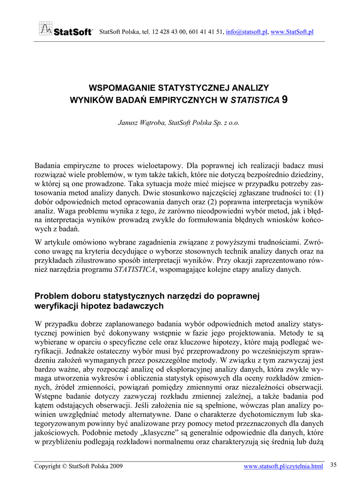 StatSoft Polska, tel. 12 428 43 00, 601 41 41 51, [email protected], www.StatSoft.pl WSPOMAGANIE STATYSTYCZNEJ ANALIZY WYNIKÓW BADAŃ EMPIRYCZNYCH W STATISTICA 9 Janusz Wątroba, StatSoft Polska Sp. z o.o. Badania empiryczne to proces wieloetapowy. Dla poprawnej ich realizacji badacz musi rozwiązać wiele problemów, w tym także takich, które nie dotyczą bezpośrednio dziedziny, w której są one prowadzone. Taka sytuacja może mieć miejsce w przypadku potrzeby zastosowania metod analizy danych. Dwie stosunkowo najczęściej zgłaszane trudności to: (1) dobór odpowiednich metod opracowania danych oraz (2) poprawna interpretacja wyników analiz. Waga problemu wynika z tego, że zarówno nieodpowiedni wybór metod, jak i błędna interpretacja wyników prowadzą zwykle do formułowania błędnych wniosków końcowych z badań. W artykule omówiono wybrane zagadnienia związane z powyższymi trudnościami. Zwrócono uwagę na kryteria decydujące o wyborze stosownych technik analizy danych oraz na przykładach zilustrowano sposób interpretacji wyników. Przy okazji zaprezentowano również narzędzia programu STATISTICA, wspomagające kolejne etapy analizy danych. Problem doboru statystycznych narzędzi do poprawnej weryfikacji hipotez badawczych W przypadku dobrze zaplanowanego badania wybór odpowiednich metod analizy statystycznej powinien być dokonywany wstępnie w fazie jego projektowania. Metody te są wybierane w oparciu o specyficzne cele oraz kluczowe hipotezy, które mają podlegać weryfikacji. Jednakże ostateczny wybór musi być przeprowadzony po wcześniejszym sprawdzeniu założeń wymaganych przez poszczególne metody. W związku z tym zazwyczaj jest bardzo ważne, aby rozpocząć analizę od eksploracyjnej analizy danych, która zwykle wymaga utworzenia wykresów i obliczenia statystyk opisowych dla oceny rozkładów zmiennych, źródeł zmienności, powiązań pomiędzy zmiennymi oraz niezależności obserwacji. Wstępne badanie dotyczy zazwyczaj rozkładu zmiennej zależnej, a także badania pod kątem odstających obserwacji. Jeśli założenia nie są spełnione, wówczas plan analizy powinien uwzględniać metody alternatywne. Dane o charakterze dychotomicznym lub skategoryzowanym powinny być analizowane przy pomocy metod przeznaczonych dla danych jakościowych. Podobnie metody „klasyczne” są generalnie odpowiednie dla danych, które w przybliżeniu podlegają rozkładowi normalnemu oraz charakteryzują się średnią lub dużą Copyright © StatSoft Polska 2009 www.statsoft.pl/czytelnia.html 35 StatSoft Polska, tel. 12 428 43 00, 601 41 41 51, [email protected], www.StatSoft.pl liczebnością. W niektórych przypadkach, np. dla danych dotyczących zliczeń lub przeżyć z obserwacjami uciętymi, wymagane są specjalne techniki modelowania. Każdy model lub metoda statystyczna posiada ma swój odrębny zestaw założeń, które powinny być sprawdzane łącznie z dopasowaniem modelu. Wymaga to zazwyczaj badania odchyleń pomiędzy wartościami rzeczywistymi i przewidywanymi przez model (odchylenia te są nazywane resztami). Za pomocą wykresów często udaje się zidentyfikować trendy lub inne problemy z rozkładem reszt. Przed rozpoczęciem analizy należy również wziąć pod uwagę, że większość metod statystycznych zakłada, że badane obserwacje są niezależne. Założenie to jest naruszone dla obserwacji, które zostały zebrane dla tych samych jednostek. Czasami sytuacja taka ma też miejsce w przypadku, gdy dane są w określony sposób „zgrupowane”, np. pacjenci leczeni przez tego samego lekarza. W takich przypadkach model statystyczny wykorzystywany do analizy danych powinien zawierać efekt lub efekty losowe. Trudno jest w ogólny sposób opisać analizę statystyczną, ponieważ każdy zbiór danych ma swoją specyfikę. Innym zagadnieniem, które często występuje zwłaszcza w przypadku badań medycznych, jest problem brakujących danych. Należy podkreślić, że sposób podejścia do takich danych zależy od tego, czy ich wystąpienie jest czysto losowe, czy też pojawiają się w sposób systematyczny. W tym drugim przypadku istnieje duże ryzyko wystąpienia zjawiska obciążenia danych (ang. bias). Kluczowym zagadnieniem przy wyborze metod statystycznych, które mają być zastosowane, jest realizacja szczegółowych celów badawczych oraz sprawdzenie głównych hipotez. Po przełożeniu pytań i hipotez badawczych do postaci hipotez statystycznych trzeba zbadać inne związane z danymi warunki. W przypadku wielu badań występuje wiele zmiennych zależnych, stąd też analizę prowadzi się zazwyczaj odrębnie dla każdej z uwzględnionych zmiennych. W przypadku gdy celem badawczym jest ocena zróżnicowania przeciętnego poziomu badanych cech w grupach badanych jednostek, do oceny statystycznej istności różnic stosuje się tzw. testy istotności. Jest kilka kryteriów, które należy brać pod uwagę przy wyborze odpowiedniego testu. Pierwsze kryterium dotyczy schematu badań. Mogą być dwa rodzaje schematów badań: (1) zaplanowane w grupach zależnych oraz (2) zaplanowane w grupach niezależnych. Kolejne kryterium to liczba porównywanych grup (2 lub więcej niż 2). Następne kryteria dotyczą skali, na jakiej mierzono zmienną zależną (ilościowa, porządkowa lub nominalna), oraz założeń dotyczących normalności rozkładu badanej zmiennej i równości wariancji w obrębie porównywanych grup badanych jednostek. Wymienione kryteria można przedstawić w postaci uproszczonego schematu, który w efektywny sposób wspomaga wybór odpowiedniego testu istotności. Dla zilustrowania użyteczności schematu przedstawionego na rys. 1 zaprezentowane zostaną przykłady doboru testów istotności, analizy w środowisku STATISTICA oraz interpretacje wyników. 36 www.statsoft.pl/czytelnia.html Copyright © StatSoft Polska 2009 StatSoft Polska, tel. 12 428 43 00, 601 41 41 51, [email protected], www.StatSoft.pl porównyw