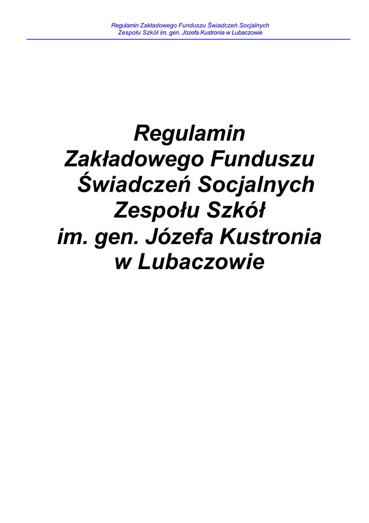 Regulamin Zakładowego Funduszu Świadczeń Socjalnych Zespołu Szkół im. gen. Józefa Kustronia w Lubaczowie Regulamin Zakładowego Funduszu Świadczeń Socjalnych Zespołu Szkół im. gen. Józefa Kustronia w Lubaczowie Regulamin Zakładowego Funduszu Świadczeń Socjalnych Zespołu Szkół im. gen. Józefa Kustronia w Lubaczowie Regulamin Zakładowego Funduszu Świadczeń Socjalnych Zespołu Szkół im. gen. Józefa Kustronia w Lubaczowie I. PODSTAWY OPRACOWANIA REGULAMINU §1. 1. Zasady tworzenia Zakładowego Funduszu Świadczeń Socjalnych ( ZFŚS) i zasady gospodarowania jego środkami określają przepisy: - Ustawy z dnia 04.03.1994 r. o Zakładowym Funduszu Świadczeń Socjalnych (Tekst jednolity Dz. U. z 1996 r. Nr 70, poz.335 z późn. zm.). - Ustawy z dnia 23.05.1991r. o Związkach Zawodowych ( Tekst jednolity Dz. U. Nr 55,poz. 234 z późn. zm. ). - Ustawa z dnia 26.01.1982 r. Karta Nauczyciela (Tekst jednolity Dz. U. z 1977 r. Nr 56, poz. 357 z póŜn. zm.). - Rozporządzenie Ministra Pracy i Polityki Socjalnej z dnia 14.03.1994 r. w sprawie naliczania odpisu na fundusz świadczeń socjalnych (Tekst jednolity Dz. U. Nr 43, poz. 168). II. POSTANOWIENIA OGÓLNE §2. Podstawą gospodarowania środkami ZFŚS stanowi roczny plan rzeczowo - finansowy, określający podział tych środków na poszczególne cele, rodzaje i formy działalności socjalnej, organizowanej przez zakład pracy na rzecz osób uprawnionych do korzystania z ZFŚS §3. 1. 2. 3. Plan rzeczowo - finansowy, opracowuje dyrektor szkoły w uzgodnieniu z organizacjami związkowymi. Środkami ZFŚS administruje dyrektor. Decyzje w sprawie przyznania świadczenia z ZFŚS wymagają uzgodnienia z organizacjami związkowymi (w przypadku braku organizacji związkowej rolę tą spełniają wybrani przedstawiciele pracowników). §4. 1. 2. 3. 4. 5. 6. 7. 8. 9. 1 2 ZFŚS tworzy się z corocznego odpisu podstawowego obciąŜającego koszty działalności zakładu pracy. Dla nauczycieli i pracowników pedagogicznych tworzy się ZFŚS w wysokości 110 % kwoty bazowej 1 na osobę. Dla pracowników nie będących nauczycielami tworzy się ZFŚS w wysokości 37,5% podstawy naliczenia2 na kaŜdego pracownika. Dla nauczycieli rencistów i emerytów w wysokości 5 % pobieranych przez nich rent i emerytur. Dla emerytów i rencistów nie będących nauczycielami w wysokości 6,25% podstawy naliczenia na osobę. Kwota ZFŚS uzupełniona jest odpisem socjalnym pracowników warsztatów szkolnych. Środki ZFŚS mogą być zwiększone o środki pozyskane zgodnie z art. 7 Ustawy o Zakładowym Funduszu Świadczeń Socjalnych Ze środków wymienionych w pkt. 1.1-1.6.tworzy się jeden ZFŚS. Środki ZFŚS są gromadzone na odrębnym rachunku bankowym. Ustalanej na podstawie Art.30 ust. 3 KN Podstawa naliczenia - Przeciętne miesięczne wynagrodzenie w drugim półroczu roku poprzedniego. Regulamin Zakładowego Funduszu Świadczeń Socjalnych Zespołu Szkół im. gen. Józefa Kustronia w Lubaczowie 10. Środki ZFŚS nie wykorzystane w danym roku kalendarzowym przechodzą na rok następny. §5. 1. 2. Świadczenia socjalne nie mają charakteru roszczeniowego tzn. od decyzji podjętych w trybie określonym w § 3 pracownikom nie przysługuje prawo odwołania. W sprawach nie uregulowanych postanowieniami niniejszego regulaminu stosuje się powszechnie obowiązujące zasady i przepisy prawa, w tym Kodeksu Postępowania Cywilnego. §6. Pracownik ubiegający się o przyznanie świadczenia ZFŚS jest zobowiązany złoŜyć do dyrektora szkoły wniosek o przyznanie świadczenia w trybie i terminie określonym w dalszych postanowieniach regulaminu. III. PRZEZNACZENIE ZFŚS §7. 1. Środki z ZFŚS przeznaczone są na dofinansowanie części kosztów w zakresie: a) róŜnych form wypoczynku urlopowego dla osób uprawnionych; b) dofinansowania udziału osób uprawnionych w imprezach kulturalnych, oświatowych, sportowych i rekreacyjnych; c) pomocy materialnej w formie rzeczowej dla osób uprawnionych; d) bezzwrotnej pomocy finansowej lub rzeczowej dla osób uprawnionych znajdujących się w trudnej sytuacji finansowej lub losowej; e) pomocy w formie poŜyczek zwrotnych na cele mieszkaniowe. f) pomocy finansowej dla nauczycieli, oraz pracowników administracji i obsługi, podnoszących swoje kwalifikacje zawodowe w wysokości do 50% ponoszonych kosztów dokształcania. Wnioski będą rozpatrywane po złoŜeniu zaświadczenia o wysokości ponoszonych opłat lub kserokopii dowodu wpłaty. §8. ZFŚS jest funduszem spoŜycia zbiorowego, co oznacza, Ŝe nie korzystanie z usług i świadczeń organizowanych przy pomocy środków tego funduszu nie uprawnia pracowników i ich rodzin do Ŝądania ekwiwalentu. §9. 1. ZFŚS przeznacza się na poszczególne zadania socjalne w następujących proporcjach procentowych: a) wypoczynek wakacyjny pracowników i ich rodzin -10 % b) świadczenia urlopowe dla nauczycieli - 22 % c) imprezy okolicznościowe - 5 % d) działalność kulturalna, sportowa - 5 % e) zapomogi losowe - 7 % f) pomoc socjalna rzeczowa i finansowa - 10 % g) pomoc mieszkaniowa - 35 % Regulamin Zakładowego Funduszu Świadczeń Socjalnych Zespołu Szkół im. gen. Józefa Kustronia w Lubaczowie h) rezerwa ( z moŜliwością wykorzystania na świadczenia zawarte w pkt. a - g w zaleŜności od doraźnych potrzeb) - 6% 2. W razie nierównomiernego wykorzystania środków przeznaczonych na świadczenia określone w pkt. 1 lit. a - g mogą występować przesunięcia środków na poszczególne rodzaje działalności. IV. OSOBY UPRAWNIONE DO KORZYSTANIA ZE ŚWIADCZEŃ §10. 1. Do korzystania ze świadczeń ZFŚS uprawnieni są: a) pracownicy w pełnym i niepełnym wymiarze czasu pracy na podstawie powołania, wyboru, mianowania, umowy o pracę na czas nieokreślony i określony. b) pracownicy przebywający na urlopach wychowawczych, nauczyciele przebywający na urlopach zdrowotnych oraz nauczyciele przeniesieni w stan nieczynny. c) emeryci i renciści byli pracown