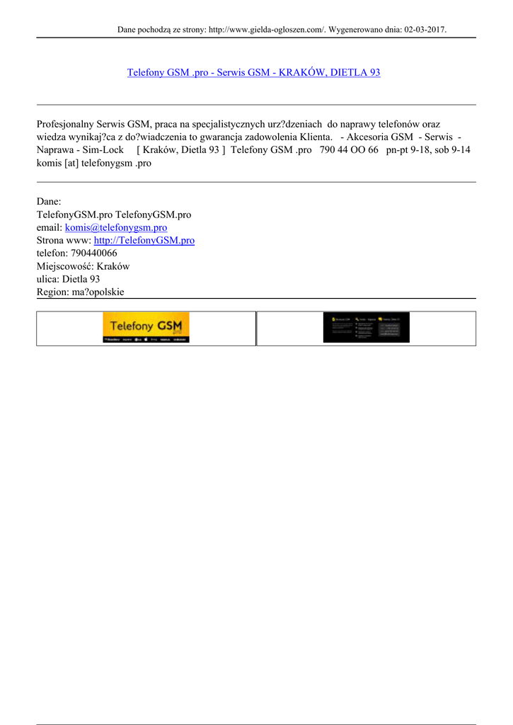 Dane pochodzą ze strony: http://www.gielda-ogloszen.com/. Wygenerowano dnia: 02-03-2017. Telefony GSM .pro - Serwis GSM - KRAKÓW, DIETLA 93 Profesjonalny Serwis GSM, praca na specjalistycznych urz?dzeniach do naprawy telefonów oraz wiedza wynikaj?ca z do?wiadczenia to gwarancja zadowolenia Klienta. - Akcesoria GSM - Serwis Naprawa - Sim-Lock [ Kraków, Dietla 93 ] Telefony GSM .pro 790 44 OO 66 pn-pt 9-18, sob 9-14 komis [at] telefonygsm .pro Dane: TelefonyGSM.pro TelefonyGSM.pro email: [email protected] Strona www: http://TelefonyGSM.pro telefon: 790440066 Miejscowość: Kraków ulica: Dietla 93 Region: ma?opolskie