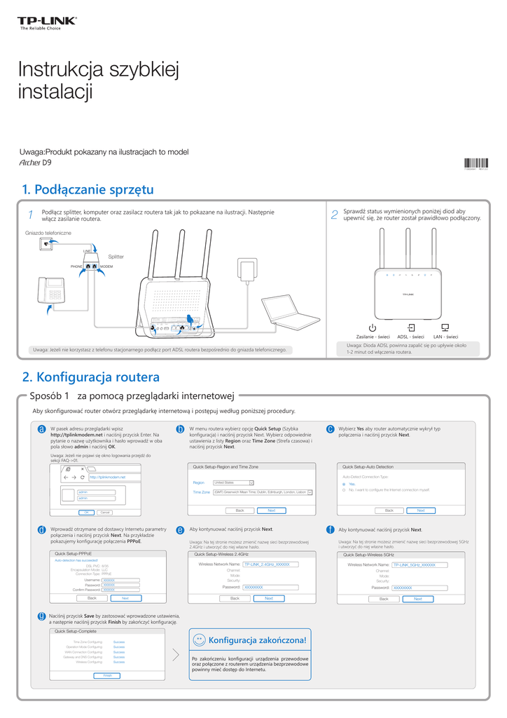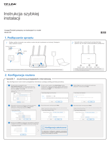 Instrukcja szybkiej instalacji Uwaga:Produkt pokazany na ilustracjach to model 7106504941 REV1.0.0 1. Podłączanie sprzętu 1 Podłącz splitter, komputer oraz zasilacz routera tak jak to pokazane na ilustracji. Następnie włącz zasilanie routera. 2 Sprawdź status wymienionych poniżej diod aby upewnić się, że router został prawidłowo podłączony. Gniazdo telefoniczne Splitter ADSL WPS WiFi ON/OFF USB 3.0 LAN1 LAN2 LAN3 LAN4/WAN POWER ON/OFF POWER Zasilanie - świeci ADSL - świeci LAN - świeci Uwaga: Dioda ADSL powinna zapalić się po upływie około 1-2 minut od włączenia routera. Uwaga: Jeżeli nie korzystasz z telefonu stacjonarnego podłącz port ADSL routera bezpośrednio do gniazda telefonicznego. 2. Konfiguracja routera Sposób 1 za pomocą przeglądarki internetowej Aby skonfigurować router otwórz przeglądarkę internetową i postępuj według poniższej procedury. a W pasek adresu przeglądarki wpisz http://tplinkmodem.net i naciśnij przycisk Enter. Na pytanie o nazwę użytkownika i hasło wprowadź w oba pola słowo admin i naciśnij OK. b W menu routera wybierz opcję Quick Setup (Szybka konfiguracja) i naciśnij przycisk Next. Wybierz odpowiednie ustawienia z listy Region oraz Time Zone (Strefa czasowa) i naciśnij przycisk Next. c Wybierz Yes aby router automatycznie wykrył typ połączenia i naciśnij przycisk Next. Uwaga: Jeżeli nie pojawi się okno logowania przejdź do sekcji FAQ->01. Quick Setup-Region and Time Zone Quick Setup-Auto Detection http://tplinkmodem.net Auto-Detect Connection Type: admin Region United States Time Zone (GMT) Greenwich Mean Time; Dublin, Edinburgh, London, Lisbon Yes. No. I want to configure the Internet connection myself. admin OK d Wprowadź otrzymane od dostawcy Internetu parametry połączenia i naciśnij przycisk Next. Na przykładzie pokazujemy konfigurację połączenia PPPoE. e Quick Setup-PPPoE Aby kontynuować naciśnij przycisk Next. Uwaga: Na tej stronie możesz zmienić nazwę sieci bezprzewodowej 2.4GHz i utworzyć do niej własne hasło. Quick Setup-Wireless 2.4GHz Auto-detection has succeeded! Wireless Network Name: DSL PVC: 8/35 Encapsulation Mode: LLC Connection Type: PPPoE Back Password: Next Back TP-LINK_2.4GHz_XXXXXX Time Zone Configuring: Success Operation Mode Configuring: Success WAN Connection Configuring: Success Gateway and DNS Configuring: Success Wireless Configuring: Success Finish f Aby kontynuować naciśnij przycisk Next. Uwaga: Na tej stronie możesz zmienić nazwę sieci bezprzewodowej 5GHz i utworzyć do niej własne hasło. Wireless Network Name: TP-LINK_5GHz_XXXXXX Channel: Mode: Security: XXXXXXXX Password: Next Naciśnij przycisk Save by zastosować wprowadzone ustawienia, a następnie naciśnij przycisk Finish by zakończyć konfigurację. Quick Setup-Complete Next Back Quick Setup-Wireless 5GHz Channel: Mode: Security: Username: XXXXXX Password: XXXXXX Confirm Password: XXXXXX g Next Back Cancel Konfiguracja zakończona! Po zakończeniu konfiguracji urządzenia przewodowe oraz połączone z routerem urządzenia bezprzewodowe powinny mieć dostęp do Internetu. Back XXXXXXXX Next Sposób 2 za pomocą płyty CD Uwaga: Konfigurując router za pomocą komputera na którym nie można skorzystać z płyty mini CD należy użyć Sposobu 1. a b Włoż płytę CD do napędu. Wybierz język polski, Archer D9 i naciśnij przycisk Wstępna Instalacja. Program Easy Setup Assistant przeprowadzi cię krok po kroku przez proces konfiguracji routera. c Naciśnij przycisk ZAKOŃCZ aby zakończyć konfigurację. Welcome Uwaga: Jeżeli program instalacyjny nie zostanie automatycznie uruchomiony przejdź do zawartości płyty CD i uruchom program autorun.exe . Install ADSL Device Configure ADSL Device Congratulations! Confirm Settings Choose your language: FINISH English Archer D9 Start Setup Konfiguracja zakończona! User Guide Printer Sharing Setup Browse CD Po zakończeniu konfiguracji urządzenia przewodowe oraz połączone z routerem urządzenia bezprzewodowe powinny mieć dostęp do Internetu. EXIT Funkcje USB Porty USB2.0 oraz USB3.0 mogą być wykorzystane do udostępniania mediów, plików oraz drukarek w sieci lokalnej. Ponadto, dzięki funkcji serwera FTP, możesz korzystać ze swoich plików z dowolnego miejsca na świecie, poprzez sieć Internet. USB 2.0 Umieszczone na panelu bocznym Porty USB2.0 oraz USB3.0 Uwaga: Aby uzyskać więcej informacji na temat funkcji USB odwiedź stronę www.tp-link.com.pl lub przeskanuj kod QR. Zdalny dostęp do plików poprzez serwer FTP Udostępnianie multimediów Udostępni anie dysków Udostępnianie drukarek FAQ (Często zadawane pytania) P1. Co mogę zrobić, jeżeli nie wyświetla się okno ekranu logowania? P3. Jak mogę przywrócić fabryczne ustawienia routera? O1. Jeżeli na karcie sieciowej komputera został ustawiony statyczny adres IP skonfiguruj kartę tak, by uzyskiwała adres IP automatycznie. O2. Upewnij się że prawidłowo wpisujesz w pasek adresu przeglądarki ‘http://tplinkmodem.net’ . O3. Spróbuj ponownie z użyciem innej przeglądarki internetowej. O4. Wyłącz, a następnie włącz router i spróbuj ponownie. O5. Wyłącz, a następnie włącz używaną do połączenia z routerem kartę sieciową i spróbuj ponownie. O1. Przy włączonym zasilaniu urządzenia przytrzymaj przycisk znajdujący się w otworze RESET z tyłu routera przez około 8 sekund. O2. Zaloguj się do strony zarządzania routerem, wybierz opcje System Tools->Factory Defaults, naciśnij przycisk Restore i poczekaj aż pasek postępu dojdzie do prawej strony ekranu. P2. Co mogę zrobić jeżeli nie mam dostępu do Internetu? O1. Upewnij się że wszystkie kable (linia telefoniczna, kable Ethernet oraz kabel zasilacza) są prawidłowo podłączone. O2. Sprawdź czy możesz zalogować się do strony konfiguracyjnej urządzenia. Domyślny adres strony konfiguracyjnej to http://tplinkmodem.net . Jeżeli możesz się zalogować wykonaj poniższe kroki. (Jeżeli nie m