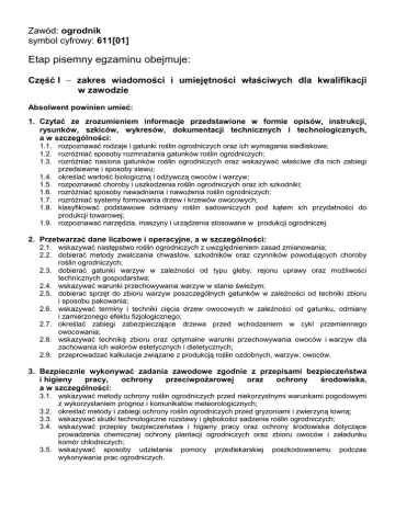 Zawód: ogrodnik symbol cyfrowy: 611[01] Etap pisemny egzaminu obejmuje: Część I zakres wiadomości i umiejętności właściwych dla kwalifikacji w zawodzie Absolwent powinien umieć: 1. Czytać ze zrozumieniem informacje przedstawione w formie opisów, instrukcji, rysunków, szkiców, wykresów, dokumentacji technicznych i technologicznych, a w szczególności: 1.1. rozpoznawać rodzaje i gatunki roślin ogrodniczych oraz ich wymagania siedliskowe; 1.2. rozróżniać sposoby rozmnażania gatunków roślin ogrodniczych; 1.3. rozróżniać nasiona gatunków roślin ogrodniczych oraz wskazywać właściwe dla nich zabiegi przedsiewne i sposoby siewu; 1.4. określać wartość biologiczną i odżywczą owoców i warzyw; 1.5. rozpoznawać choroby i uszkodzenia roślin ogrodniczych oraz ich szkodniki; 1.6. rozróżniać sposoby nawadniania i nawożenia roślin ogrodniczych; 1.7. rozróżniać systemy formowania drzew i krzewów owocowych; 1.8. klasyfikować podstawowe odmiany roślin sadowniczych pod kątem ich przydatności do produkcji towarowej; 1.9. rozpoznawać narzędzia, maszyny i urządzenia stosowane w produkcji ogrodniczej. 2. Przetwarzać dane liczbowe i operacyjne, a w szczególności: 2.1. wskazywać następstwo roślin ogrodniczych z uwzględnieniem zasad zmianowania; 2.2. dobierać metody zwalczania chwastów, szkodników oraz czynników powodujących choroby roślin ogrodniczych; 2.3. dobierać gatunki warzyw w zależności od typu gleby, rejonu uprawy oraz możliwości technicznych gospodarstwa; 2.4. wskazywać warunki przechowywania warzyw w stanie świeżym; 2.5. dobierać sprzęt do zbioru warzyw poszczególnych gatunków w zależności od techniki zbioru i sposobu pakowania; 2.6. wskazywać terminy i techniki cięcia drzew owocowych w zależności od gatunku, odmiany i zamierzonego efektu fizjologicznego; 2.7. określać zabiegi zabezpieczające drzewa przed wchodzeniem w cykl przemiennego owocowania; 2.8. wskazywać technikę zbioru oraz optymalne warunki przechowywania owoców i warzyw dla zachowania ich walorów estetycznych i dietetycznych; 2.9. przeprowadzać kalkulacje związane z produkcją roślin ozdobnych, warzyw, owoców. 3. Bezpiecznie wykonywać zadania zawodowe zgodnie z przepisami bezpieczeństwa i higieny pracy, ochrony przeciwpożarowej oraz ochrony środowiska, a w szczególności: 3.1. wskazywać metody ochrony roślin ogrodniczych przed niekorzystnymi warunkami pogodowymi z wykorzystaniem prognoz i komunikatów meteorologicznych; 3.2. określać metody i zabiegi ochrony roślin ogrodniczych przed gryzoniami i zwierzyną łowną; 3.3. wskazywać skutki technologiczne rozstawy i głębokości sadzenia roślin ogrodniczych; 3.4. wskazywać przepisy bezpieczeństwa i higieny pracy oraz ochrony środowiska dotyczące prowadzenia chemicznej ochrony plantacji ogrodniczych oraz zbioru owoców i załadunku komór chłodniczych; 3.5. wskazywać sposoby udzielania pomocy przedlekarskiej poszkodowanemu podczas wykonywania prac ogrodniczych. 611[01] Ogrodnik Część II zakres wiadomości i umiejętności związanych z zatrudnieniem i działalnością gospodarczą Absolwent powinien umieć: 1. Czytać ze zrozumieniem informacje przedstawione w formie opisów, instrukcji, tabel, wykresów, a w szczególności: 1.1. rozróżniać podstawowe pojęcia i terminy z obszaru funkcjonowania gospodarki oraz prawa pracy, prawa podatkowego i przepisów regulujących podejmowanie i wykonywanie działalności gospodarczej; 1.2. rozróżniać dokumenty związane z zatrudnieniem oraz podejmowaniem i wykonywaniem działalności gospodarczej; 1.3. identyfikować i analizować informacje dotyczące wymagań i uprawnień pracownika, pracodawcy, bezrobotnego i klienta. 2. Przetwarzać dane liczbowe i operacyjne, a w szczególności: 2.1. analizować informacje związane z podnoszeniem kwalifikacji, poszukiwaniem pracy i zatrudnieniem oraz podejmowaniem i wykonywaniem działalności gospodarczej; 2.2. sporządzać dokumenty związane z poszukiwaniem pracy i zatrudnieniem oraz podejmowaniem i wykonywaniem działalności gospodarczej; 2.3. rozróżniać skutki wynikające z nawiązania i rozwiązania stosunku pracy. Etap praktyczny egzaminu obejmuje praktyczne umiejętności z zakresu kwalifikacji w zawodzie, objęte tematami: 1. Wykonanie wskazanych prac w zakresie produkcji określonych roślin ozdobnych. 2. Wykonanie wskazanych prac w zakresie produkcji określonych warzyw. 3. Wykonanie wskazanych prac z zakresu szkółkarstwa i produkcji owoców. Absolwent powinien umieć: 1. Planować czynności związane z wykonaniem zadania: 1.1. sporządzić plan działania; 1.2. sporządzić wykaz niezbędnych surowców, materiałów, sprzętu kontrolno-pomiarowego, narzędzi; 1.3. wykonać niezbędne obliczenia, rysunki lub szkice pomocnicze. 2. Organizować stanowisko pracy: 2.1. zgromadzić i rozmieścić na stanowisku pracy materiały, narzędzia, urządzenia i sprzęt zgodnie z zasadami bezpieczeństwa i higieny pracy oraz ochrony przeciwpożarowej; 2.2. sprawdzić stan techniczny maszyn, urządzeń i sprzętu; 2.3. dobrać odzież roboczą i środki ochrony indywidualnej. 3. Wykonać zadanie egzaminacyjne z zachowaniem przepisów bezpieczeństwa i higieny pracy, ochrony przeciwpożarowej oraz ochrony środowiska i wykazać się umiejętnościami objętymi tematami: 2 611[01] Ogrodnik 3.1. Wykonanie wskazanych ozdobnych: prac w zakresie produkcji określonych roślin 3.1.1. przygotować podłoże zgodnie z wymaganiami gatunków roślin i sposobem ich rozmnażania; 3.1.2. przygotować nasiona, rośliny lub ich części do rozmnażania; 3.1.3. napełnić pojemniki podłożem; 3.1.4. wyznaczyć rozstawy i głębokość siewu lub sadzenia; 3.1.5. umieścić w podłożu nasiona, rośliny lub ich części; 3.1.6. zagęścić podłoże po siewie lub sadzeniu roślin; 3.1.7. zabezpieczyć warunki do wzrostu i rozwoju roślin, w zależności od sposobu ich rozmnażania i gatunku; 3.1.8. kontrolow