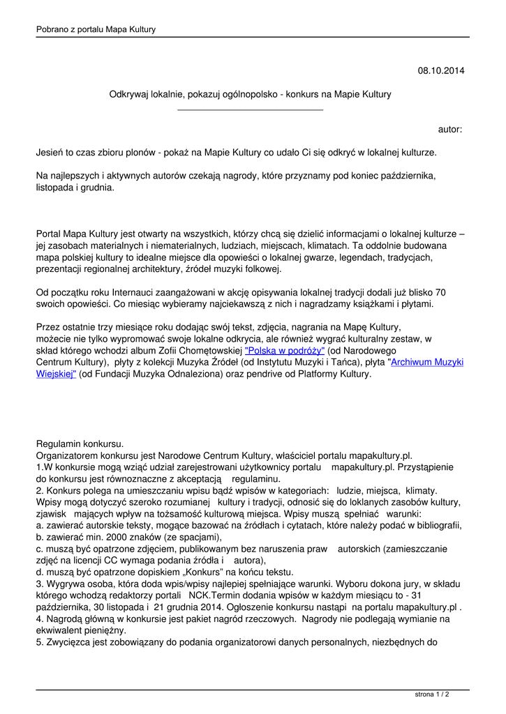 Pobrano z portalu Mapa Kultury 08.10.2014 Odkrywaj lokalnie, pokazuj ogólnopolsko - konkurs na Mapie Kultury ____________________________ autor: Jesień to czas zbioru plonów - pokaż na Mapie Kultury co udało Ci się odkryć w lokalnej kulturze. Na najlepszych i aktywnych autorów czekają nagrody, które przyznamy pod koniec października, listopada i grudnia. Portal Mapa Kultury jest otwarty na wszystkich, którzy chcą się dzielić informacjami o lokalnej kulturze – jej zasobach materialnych i niematerialnych, ludziach, miejscach, klimatach. Ta oddolnie budowana mapa polskiej kultury to idealne miejsce dla opowieści o lokalnej gwarze, legendach, tradycjach, prezentacji regionalnej architektury, źródeł muzyki folkowej. Od początku roku Internauci zaangażowani w akcję opisywania lokalnej tradycji dodali już blisko 70 swoich opowieści. Co miesiąc wybieramy najciekawszą z nich i nagradzamy książkami i płytami. Przez ostatnie trzy miesiące roku dodając swój tekst, zdjęcia, nagrania na Mapę Kultury, możecie nie tylko wypromować swoje lokalne odkrycia, ale również wygrać kulturalny zestaw, w skład którego wchodzi album Zofii Chomętowskiej "Polska w podróży" (od Narodowego Centrum Kultury), płyty z kolekcji Muzyka Źródeł (od Instytutu Muzyki i Tańca), płyta "Archiwum Muzyki Wiejskiej" (od Fundacji Muzyka Odnaleziona) oraz pendrive od Platformy Kultury. Regulamin konkursu. Organizatorem konkursu jest Narodowe Centrum Kultury, właściciel portalu mapakultury.pl. 1.W konkursie mogą wziąć udział zarejestrowani użytkownicy portalu mapakultury.pl. Przystąpienie do konkursu jest równoznaczne z akceptacją regulaminu. 2. Konkurs polega na umieszczaniu wpisu bądź wpisów w kategoriach: ludzie, miejsca, klimaty. Wpisy mogą dotyczyć szeroko rozumianej kultury i tradycji, odnosić się do loklanych zasobów kultury, zjawisk mających wpływ na tożsamość kulturową miejsca. Wpisy muszą spełniać warunki: a. zawierać autorskie teksty, mogące bazować na źródłach i cytatach, które należy podać w bibliografii, b. zawierać min. 2000 znaków (ze spacjami), c. muszą być opatrzone zdjęciem, publikowanym bez naruszenia praw autorskich (zamieszczanie zdjęć na licencji CC wymaga podania źródła i autora), d. muszą być opatrzone dopiskiem „Konkurs” na końcu tekstu. 3. Wygrywa osoba, która doda wpis/wpisy najlepiej spełniające warunki. Wyboru dokona jury, w składu którego wchodzą redaktorzy portali NCK.Termin dodania wpisów w każdym miesiącu to - 31 października, 30 listopada i 21 grudnia 2014. Ogłoszenie konkursu nastąpi na portalu mapakultury.pl . 4. Nagrodą główną w konkursie jest pakiet nagród rzeczowych. Nagrody nie podlegają wymianie na ekwiwalent pieniężny. 5. Zwycięzca jest zobowiązany do podania organizatorowi danych personalnych, niezbędnych do strona 1 / 2 Pobrano z portalu Mapa Kultury odbioru nagrody. 6. Organizator zastrzega sobie prawo do nierozstrzygnięcia, odwołania lub przerwania konkursu. strona 2 / 2