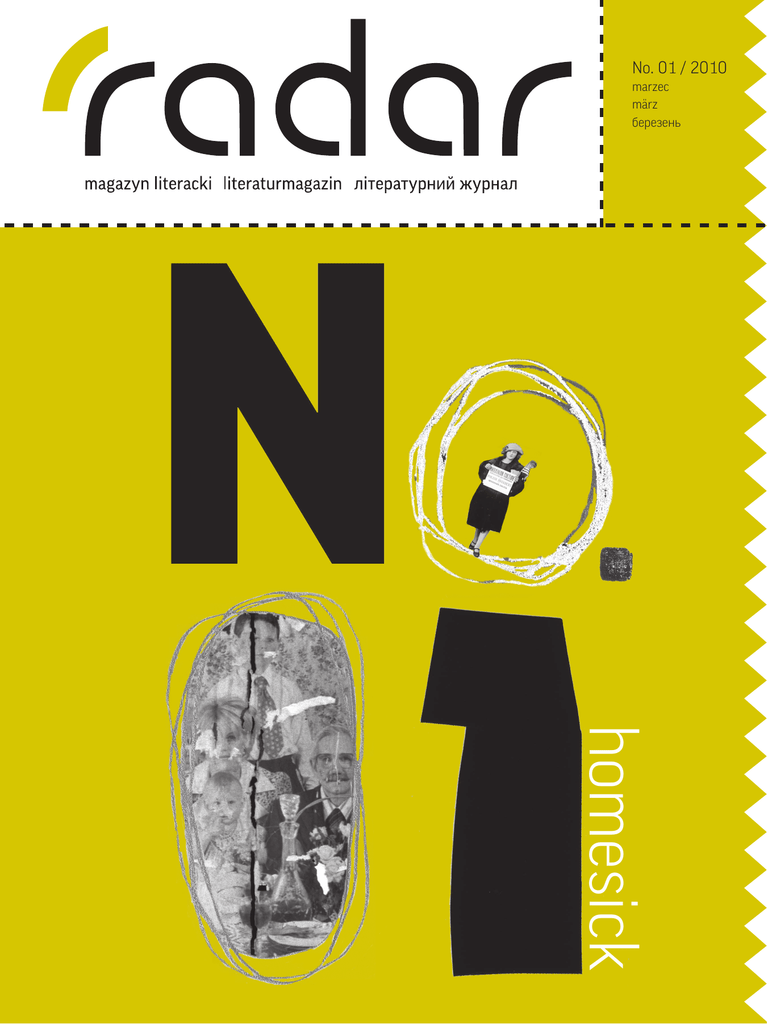 No. 01 / 2010 marzec märz березень homesick RADAR magazyn literacki Kraków 2010, nr 1 e-mail: [email protected] RADAR literaturmagazin Krakau 2010, nr. 1 e-mail: [email protected] РАДАР літературний журнал Краків 2010, № 1 eлектронна пошта: [email protected] REDAKCJA Renata Serednicka (redaktor naczelna) Małgorzata Różańska-Braniecka (sekretarz redakcji) Małgorzata Olszewska (serwis internetowy) zespół redakcyjny Jurij Izdryk Norbert Lange Robert Ostaszewski Rebecca Maria Salentin Ostap Sływynski Igor Stokfiszewski Natalka Śniadanko Andreas Volk współpracownicy Iwona Boruszkowska Karoline Gil Katarzyna Glinianowicz Urszula Pieczek Zuzanna Sipior Andrzej Tyrpa Elżbieta Zielińska REDAKTION Renata Serednicka (chef-redakteurin) Małgorzata Różańska-Braniecka (redaktionssekretärin) Małgorzata Olszewska (internetseite) redaktionsteam Jurij Izdryk Norbert Lange Robert Ostaszewski Rebecca Maria Salentin Ostap Slywynski Igor Stokfiszewski Natalka Sniadanko Andreas Volk zusammenarbeit Iwona Boruszkowska Karoline Gil Katarzyna Glinianowicz Urszula Pieczek Zuzanna Sipior Andrzej Tyrpa Elżbieta Zielińska РЕДАКЦІЯ Pената Cередницька (головний редактор) Малґожата Pужанська-Бранєцька (cекретар редакції) Малґожата Oльшевська (веб-редактор) редактори Юрій Iздрик Норберт Ланґе Pоберт Oсташевський Pебека Марія Залентін Oстап Cливинський Iґор Cтокфішевський Наталка Cняданко Aндреас Вольк cпівпрацівники Iвона Борушковська Кароліне Ґіль Катажина Ґлінянович Уршуля Пєчек Зузанна Сіпіор Анджей Тирпа Eльжбєта Зєлінська RADAR ONLINE www.e-radar.pl RADAR ONLINE www.e-radar.pl PROJEKT GRAFICZNY I ILUSTRACJE Dorota Gawryszewska Anna Jaworska (Pracownia Grafiki), Warszawa www.pracowniagrafiki.pl GRAPHIK UND ILLUSTRATIONEN Dorota Gawryszewska Anna Jaworska (Pracownia Grafiki), Warschau www.pracowniagrafiki.pl PROJEKT OKŁADKI Anna Jaworska ENTWURF DES UMSCHLAGS Anna Jaworska WYDAWCA Stowarzyszenie Willa Decjusza ul. 28 Lipca 17a PL 30-233 Kraków www.villa.org.pl HERAUSGEBER Verein Villa Decius ul. 28 Lipca 17a PL 30-233 Kraków www.villa.org.pl DRUK Drukarnia Leyko ul. Romanowicza 11 PL 30-702 Kraków www.leyko.pl DRUCK Druckerei Leyko ul. Romanowicza 11 PL 30-702 Kraków www.leyko.pl NAKŁAD 4.000 egz. AUFLAGE 4.000 ex. NUMER ZREALIZOWANO ZE ŚRODKÓW Ministra Kultury i Dziedzictwa Narodowego oraz Allianz Kulturstiftung VERWIRKLICHT AUS DEN MITTELN VON Allianz Kulturstiftung Minister für Kultur und Nationalerbe zdjęcie na okładce © Elżbieta Lempp foto auf dem umschlag © Elżbieta Lempp РАДАР ОНЛАЙН www.e-radar.pl ГРАФІЧНИЙ ДИЗАЙН Й ІЛЮСТРАЦІЇ Дорота Ґавришевська Анна Яворська (Pracownia Grafiki), Варшава www.pracowniagrafiki.pl Z przyjemnością przedstawiamy Wam pierwszy papierowy numer magazynu literackiego RADAR, który prezentuje literaturę z trzech obszarów językowych – niemieckiego, polskiego i ukraińskiego w oryginale oraz w przekładzie na każdy z dwóch pozostałych języków. RADAR powstał dzięki osobistym kontaktom autorów i tłumaczy z Niemiec, Polski i Ukrainy i jako wynik pewnego czytelniczego odkrycia, o którym pisze Igor Stokfiszewski w eseju „Literacki ruch oporu”. Okazało się, że literatura trzech narodów w gruncie rzeczy tworzy spójny obraz rzeczywistości, opisując te same, uniwersalne doświadczenia. Jednym z nich jest „home-sick” – motyw przewodni tego numeru. Ten temat przewijał się w rozmowach prowadzonych w krakowskiej Willi Decjusza podczas pobytów stypendialnych Homines Urbani przez pisarki i pisarzy z różnych krajów. Teraz z pytaniem o nostalgię czy problem jej braku, zmierzyli się autorzy pierwszego numeru RADARU. Eksponując przy tekstach nazwisko autora przekładu, pokazujemy, że cenimy tych, bez których idea literatury trzech języków nie mogłaby zaistnieć. To tłumacze wprowadzają nas w świat, który pozornie jest niedostępny – świat obcego języka. Dzięki ich pracy mamy szansę wczuć się w „innego” i odkryć, że tak naprawdę to jest ten sam/ta sama, tylko odmiennie opisany. Wśród granic, których uparcie nie chcemy dostrzegać, są również te między tekstem a nie-tekstem. Dlatego o uniwersalnej rzeczywistości, jaką pragniemy odkryć, na równi z pisarzami opowiadają artyści obrazu. Okładka i projekt typograficzny autorstwa Anny Jaworskiej i Doroty Gawryszewskiej podkreślają ideę trzech języków i jednej literatury. Fotografie Elżbiety Lempp, jakie znajdziecie wewnątrz numeru, dopowiadają to, czego o „home sick” nie można powiedzieć słowami. Zapraszamy do lektury. I przypominamy, że teksty naszych autorów, aktualności literackie i recenzje regularnie pojawiają się w serwisie internetowym www.e-radar.pl. Mit Freude präsentieren wir Euch die erste Druckausgabe des Magazins RADAR, das Literatur aus Deutschland, Polen und der Ukraine jeweils in allen drei Sprachen vorstellt. RADAR entstand durch persönliche Kontakte zwischen Autoren und Übersetzern aus den zuvor genannten Ländern und ist das Ergebnis einer Leseentdeckung, die Igor Stokfiszewski in seinem Essay „Die literarische Widerstandsbewegung“ beschreibt. Es stellte sich heraus, dass die Literatur dreier Nationen im Grunde ein einstimmiges Bild von der Wirklichkeit schafft, in dem sie die gleichen universellen Erfahrungen beschreibt. Daraus ist das Leitmotiv dieser Ausgabe „home-sick” entstanden. Dieses Thema zog sich durch die Gespräche, die in der Villa Decius im Rahmen des Programms Homines Urbani zwischen den Stipendiaten aus verschiedenen Ländern gef