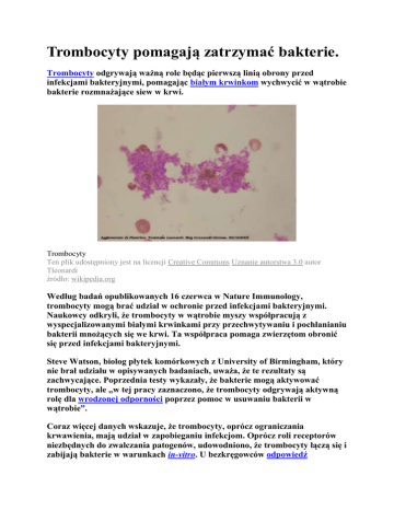 Trombocyty pomagają zatrzymać bakterie. Trombocyty odgrywają ważną role będąc pierwszą linią obrony przed infekcjami bakteryjnymi, pomagając białym krwinkom wychwycić w wątrobie bakterie rozmnażające siew w krwi. Trombocyty Ten plik udostępniony jest na licencji Creative Commons Uznanie autorstwa 3.0 autor Tleonardi źródło: wikipedia.org Według badań opublikowanych 16 czerwca w Nature Immunology, trombocyty mogą brać udział w ochronie przed infekcjami bakteryjnymi. Naukowcy odkryli, że trombocyty w wątrobie myszy współpracują z wyspecjalizowanymi białymi krwinkami przy przechwytywaniu i pochłanianiu bakterii mnożących się we krwi. Ta współpraca pomaga zwierzętom obronić się przed infekcjami bakteryjnymi. Steve Watson, biolog płytek komórkowych z University of Birmingham, który nie brał udziału w opisywanych badaniach, uważa, że te rezultaty są zachwycające. Poprzednia testy wykazały, że bakterie mogą aktywować trombocyty, ale „w tej pracy zaznaczono, że trombocyty odgrywają aktywną rolę dla wrodzonej odporności poprzez pomoc w usuwaniu bakterii w wątrobie”. Coraz więcej danych wskazuje, że trombocyty, oprócz ograniczania krwawienia, mają udział w zapobieganiu infekcjom. Oprócz roli receptorów niezbędnych do zwalczania patogenów, udowodniono, że trombocyty łączą się i zabijają bakterie w warunkach in-vitro. U bezkręgowców odpowiedź immunologiczna i zapobieganie krwawieniu jest zadaniem jednego typu komórek. Wygląda na to , że trombocyty odnalazły obie funkcje, mimo że kręgowce wytworzyły bardziej specjalistyczne komórki odpornościowe. Wykazanie, że trombocyty mogą współpracować z innymi komórkami przy oczyszczaniu krwi z mnożących się w niej bakteriach było możliwe poprzez obserwacje wątroby. W czasie obserwacji pod mikroskopem wyspecjalizowanych wątrobowych fagocytów, zwanych komórkami Kupffera, zespół zauważył niezwykłe oddziaływanie między fagocytami i trombocytami. Komórki Kupffera (z szarą cytoplazmą) Ten plik udostępniony jest na licencji Creative Commons Uznanie autorstwa 3.0 autor Nephron źródło: wikipedia.org Komórki Kupffera znajdujące się w naczyniach krwionośnych wątroby, pomagają przechwycić i zabić bakterie przepływające z krwią. Wykorzystując przyżyciową mikroskopię, naukowcy zauważyli, że u zdrowych myszy trombocyty wykonują ruchy nazwane „dotknij i idź” (krótka interakcja z komórkami Kupffera i oddalenie się). Jednak, gdy mysz jest zakażona jedną z bakterii (Bacillus cereus albo odporną na metycylinę Staphylococcus aureus, co ciekawe reakcja nie obejmuje podatnego na metycylinę Staphylococcus aureus), trombocyty łączą się na długo z komórkami Kupffera pochłaniając bakterie wyciągane z krwi. Gronkowiec złocisty To zdjęcie jest w domenie publicznej gdyż zawiera materiały pochodzące z Agricultural Research Service, agencji badawczej United States Department of Agriculture. źródło: wikipedia.org Dwa różne typy receptorów na trombocytach (znanych już z funkcji zapobiegających krwawieniu) pośredniczą w dwóch , obserwowanych przez naukowców, działaniach. Komórki Kupffera przyłączają czynnik von Willebranda (vWF) (wolna glikoproteina krwi) na swojej powierzchni. W „Dotknij i idź” zaangażowane jest przyłączanie vWF do trombocytowej glikoproteiny lb (Gplb), która zapewnia agregowanie trombocytów w miejscach zranień. W zmutowanych myszach, pozbawionych Gplb nie występuje „dotknij i idź”. Ale naukowcy zauważyli, że u myszy zakażonych B. cereus, w długiej interakcji potrzebują vFW do połączenia GpIIb-GpIIIa, które również pomagają agregowaniu trombocytów. Model wstążkowy białka von Willebranda. Ten utwór został udostępniony jako własność publiczna przez jego autora, PDB. Dotyczy to całego świata. źródło: wikipedia.org Jak się okazuje trombocyty pełnią rolę poprawiającą żywotność. Naukowcy pozbawili myszy trombocytów (lub użyli pozbawionych glikoproteiny lb) i zarazili je Bacillus cereus. Myszy pozbawione trombocytów zdechły 4 godziny po zainfekowaniu, 80% tych pozbawionych glikoproteiny bl również zdechło w 4 godziny, 90% dzikich myszy przeżyło 4 godziny. W przeciwieństwie do dzikich myszy, te pozbawione GpIb również nie potrafiły pozbyć się bakterii z krwi w czasie 4 godzin, co sugeruje, że interakcja trombocytów z komórkami Kupffera ma znaczenie przy zwalczaniu infekcji bakteryjnych. GpIb i GpIIb oprócz utrzymywania homeostazy trombocytów również spełniają funkcję odpornościową, co podkreśla Guy Zimmerman z the University of Utah, nie biorący udziału w opisywanych badaniach. Guy zaznacza, że nie jest pewne, że trombocyty i komórki Kupffera tak samo działają u ludzi. Ponadto badania powinny objąć również inne typy bakterii, nie tylko dwie gram dodatnim, ale również występującym w wątrobie gram ujemne, takie jak Escherichia coli. Pałeczka okrężnicy To zdjęcie jest w domenie publicznej gdyż zawiera materiały pochodzące z Agricultural Research Service, agencji badawczej United States Department of Agriculture źródło: wikipedia.org Jeśli ludzkie trombocyty spełniają podobną funkcję, pacjenci z już obniżoną odpornością nie powinni przyjmować leków wpływających na trombocyty (takich jak aspiryna), bo prowadziło, by to do pogorszenia stanu. Watson zauważa, że jest wiele sposobów aktywacji przyłączania GpIIb i aspiryna nie powinna znacząco wpływać na funkcje odpornościowe trombocytów u zdrowych ludzi. Ponadto, według niego, publikacja wskazuje, że w przypadkach urazów, trzeba zastąpić czymś trombocyty w celu uniknięcia krwawienia i zakażenia. Kwas acetylosalicylowy Ten utwór został udostępniony jako własność publiczna przez jego autora, Benjah-bmm27. Dotyczy to całego świata. źródło: wikipedia.org Poznanie mechanizmu, który stoi za przyłączaniem się trombocytów d