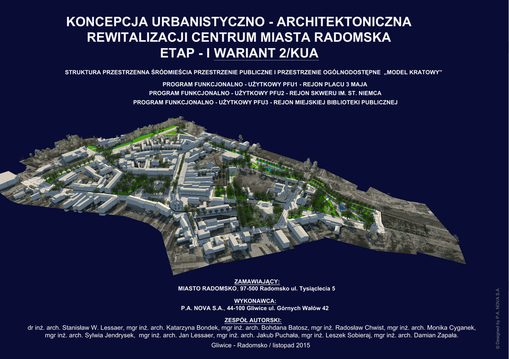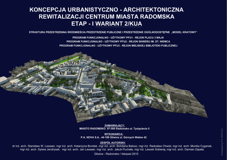 MIASTO RADOMSKO, WYKONAWCA: P.A. NOVA S.A., Gliwice - Radomsko / listopad 2015 Designed by P.A. NOVA S.A. KONCEPCJA URBANISTYCZNO - ARCHITEKTONICZNA REWITALIZACJI CENTRUM MIASTA RADOMSKA ETAP - I WARIANT 2/KUA „Koncepcja urbanistyczno - architektoniczna Rewitalizacji Centrum Miasta Radomska ” - Etap I - Wariant 2/KUA -------------------------------------------------------------------------------------------------------------------------------------------------------------------------------------------------------------------------------------------------------------------------------------------------------------------------- KONCEPCJA URBANISTYCZNO - ARCHITEKTONICZNA REWITALIZACJI CENTRUM MIASTA RADOMSKA ETAP - I WARIANT 2/KUA STRUKTURA PRZESTRZENNA ŚRÓDMIEŚCIA, PRZESTRZENIE PUBLICZNE I PRZESTRZENIE OGÓLNODOSTĘPNE - „MODEL KRATOWY” PROGRAM FUNKCJONALNO UŻYTKOWY PFU1 - REJON PLACU 3 MAJA PROGRAM FUNKCJONALNO UŻYTKOWY PFU2 - REJON SKWERU NIEMCA PROGRAM FUNKCJONALNO UŻYTKOWY PFU3 - REJON MIEJSKIEJ BIBLIOTEKI PUBLICZNEJ ZAMAWIAJĄCY MIASTO RADOMSKO, 97-500 RADOMSKO, UL. TYSIĄCLECIA 5 WYKONAWCA WYKONAWCA: P.A.NOVA S.A., 44-100 GLIWICE, UL. GÓRNYCH WAŁÓW 42 ZESPÓŁ AUTORSKI dr inż. arch. Stanisław Lessaer, mgr inż. arch. Katarzyna Bondek, mgr inż. arch. Bohdana Batosz, mgr inż. arch. Sylwia Jendrysek, mgr inż. arch. Jakub Puchała, mgr inż. arch. Jan Lessaer, inż. Leszek Sobieraj, mgr inż. arch. Damian Zapała, mgr inż. Radosław Chwist, mgr inż. arch. Monika Cyganek -------------------------------------------------------------------------------------------------------------------------------------------------------------------------------------------------------------------------------------------------------------------------------------------------------------------------Gliwice - Radomsko / listopad 2015 1 „Koncepcja urbanistyczno - architektoniczna Rewitalizacji Centrum Miasta Radomska ” - Etap I - Wariant 2/KUA -------------------------------------------------------------------------------------------------------------------------------------------------------------------------------------------------------------------------------------------------------------------------------------------------------------------------- Wariant 2/KUA „ Koncepcja urbanistyczno - architektoniczna Rewitalizacji Centrum Miasta Radomska, Etap - I ” 1/ WPROWADZENIE Koncepcja urbanistyczno - architektoniczna (KUA) Rewitalizacji Centrum Miasta Radomska została opracowana dla obszaru o powierzchni 25,50 ha, w granicach bezpośrednich, uwzględniając ponadto 50,00 metrowe otoczenie (łącznie 39,60 ha). Zadaniem i celem koncepcji jest ukształtowanie spójnej pod względem przestrzennym i programowym wizji rozwoju, a właściwie stopniowego przekształcania się centralnej historycznej części miasta Radomska. Koncepcję opracowano z wykorzystaniem następujących, udostępnionych przez Urząd Miasta Radomska i strony trzecie materiałów wejściowych: - mapa cyfrowa w skali 1: 500, zaktualizowana dla celów projektowych, - wyrys z ewidencji gruntów, - ortofotomapa z Centralnego Ośrodka Dokumentacji Geodezyjnej i Kartograficznej w Warszawie, - chmura punktów z Centralnego Ośrodka Dokumentacji Geodezyjnej i Kartograficznej w Warszawie, - Inwentaryzacja Zieleni - opracowanie dendrologiczne wykonane w październiku 2015, przez S.C.COLLAGE z Gliwic, - Studium uwarunkowań i kierunków zagospodarowania przestrzennego miasta Radomsko, zatwierdzone uchwałą Rady Miejskiej w Radomsku Nr LXIII/476/10 z dnia 30 września 2010 r., - projekt koncepcyjny zagospodarowania Al. Jana Pawła II, - projekt budowlany ronda przy ul. Brzeźnickiej/Piłsudskiego, - założenia do projektu „Eliminacji zagrożeń środowiskowych i poprawy wizerunku rzeki Radomki”, - fragment miejscowego planu zagospodarowania przestrzennego dla centrum miasta Radomska (dotyczy głównie projektowanej drogi dojazdowej w rejonie Alei Jana Pawła II wraz z uwzględnieniem miejsc postojowych do obsługi obiektu Muzeum Regionalnego w Radomsku i Urzędu Stanu Cywilnego), - miejscowy plan zagospodarowania przestrzennego Brzeźnicka/PKP, zatwierdzony uchwałą Rady Miejskiej w Radomsku Nr XXXVIII/338/13 z dnia 20 maja 2013 r. w sprawie miejscowego planu zagospodarowania przestrzennego fragmentu terenu miasta Radomska w rejonie ulic: Warszyca Brzeźnicka - Piłsudskiego, przedłużenie Targowej, do terenów PKP (Dziennik Urzędowy Województwa Łódzkiego z dnia 11 marca 2014 r., poz. 1199), - miejscowy plan zagospodarowania przestrzennego Metalurgia, zatwierdzony uchwałą Rady Miejskiej w Radomsku Nr XXXIII/167/12 z dnia 21 marca 2012 r. w sprawie miejscowego planu -------------------------------------------------------------------------------------------------------------------------------------------------------------------------------------------------------------------------------------------------------------------------------------------------------------------------Gliwice - Radomsko / listopad 2015 2 „Koncepcja urbanistyczno - architektoniczna Rewitalizacji Centrum Miasta Radomska ” - Etap I - Wariant 2/KUA -------------------------------------------------------------------------------------------------------------------------------------------------------------------------------------------------------------------------------------------------------------------------------------------------------------------------- zagospodarowania przestrzennego fragmentu miasta Radomska w rejonie ulic Reymonta i Kościuszki (Dziennik Urzędowy Województwa Łódzkiego z dnia 7 maja 2012 r., poz. 1389), oo. Franciszkanów, Aleja Jana Pawła II zakończona nowym Placem nad Wodą, Polder Południowy będący wielofunkcyjnym teren rekreacyjno - wypoczynkowym dla młodzieży. - Program Opieki nad Zabytkami, przyjęty uchwałą Rady Miejskiej w Radomsku Nr IX/51/15 z dnia 23 marca 2015 (Dziennik Urzędowy Województwa