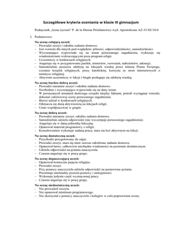 Szczegółowe kryteria oceniania w klasie III gimnazjum Podręcznik „Jezus życiem” P. de la Herran Próchniewicz wyd. Apostolicum AZ-33-02/10-0 I. Podstawowe: Na ocenę celującą uczeń: – Prowadzi zeszyt i odrabia zadania domowe. – Jest wzorem dla innych pod względem: pilności, odpowiedzialności, samodzielności. – Wyczerpująco wypowiada się na temat poruszanego zagadnienia, wykazuje się wiadomościami wykraczającymi poza program religii. – Uczestniczy w konkursach religijnych. – Angażuje się w przygotowanie jasełek, misteriów, rozważań, nabożeństw, adoracji. – Samodzielnie poszerza zdobytą na lekcjach wiedzę przez lekturę Pisma Świętego, czytanie książek religijnych, prasy katolickiej, korzysta ze stron internetowych o tematyce religijnej. – Aktywnie uczestniczy w lekcji i biegle posługuje się zdobytą wiedzą. Na ocenę bardzo dobrą uczeń: – Prowadzi starannie zeszyt i odrabia zadania domowe. – Swobodnie i wyczerpująco wypowiada się na dany temat. – W poruszanych tematach dostrzega związki między faktami, potrafi wyciągnąć wnioski, dokonać całościowej oceny poruszanego zagadnienia. – Bierze udział w konkursach religijnych. – Odznacza się dużą aktywnością na lekcjach religii. – Umie współpracować w grupie. Na ocenę dobrą uczeń: – Prowadzi starannie zeszyt, odrabia zadania domowe. – Samodzielnie udziela odpowiedzi (nie wyczerpuje poruszonego zagadnienia). – Angażuje się w daną jednostkę lekcyjną. – Opanował materiał programowy z religii. – Konsekwentnie wykonuje zadaną pracę, stara się być aktywnym na lekcji. Na ocenę dostateczną uczeń: – Przychodzi przygotowany do zajęć. – Prowadzi zeszyt, stara się mieć zawsze odrobione zadanie domowe. – Opanował łatwe, całkowicie niezbędne wiadomości na poziomie dostatecznym. – Udziela odpowiedzi na pytania nauczyciela. – Czasem angażuje się w pracę grupy. Na ocenę dopuszczającą uczeń: – Opanował konieczne pojęcia religijne. – Prowadzi zeszyt. – Przy pomocy nauczyciela udziela odpowiedzi na postawione pytania. – Prezentuje minimalny poziom postawy i umiejętności. – Wykonuje jedynie część wyznaczonej pracy. – Czasem angażuje się w pracę grupy. Na ocenę niedostateczną uczeń: – Nie prowadził zeszytu. – Nie opanował minimum programowego. – Nie skorzystał z pomocy nauczyciela i kolegów w celu poprawienia oceny. II. Szczegółowe: Na ocenę celującą uczeń: – Opanował materiał przewidziany programem w stopniu bardzo dobrym. – Biegle posługuje się zdobytą wiedzą. – Uzupełnia zdobytą na lekcjach wiedzę przez lekturę literatury religijnej. – Wykonuje dodatkowe (ponadprogramowe) prace (prezentacje, referaty, albumy itp.). – Zajmuje wysokie miejsca w organizowanych konkursach religijnych. – Jest wzorem i przykładem dla innych uczniów. – W życiu codziennym kieruje się dobrem własnym i drugiego człowieka. Na ocenę bardzo dobrą uczeń: – Potrafi wyjaśnić, na czym polega godność człowieka. – Definiuje wspólnotę, jej cechy i rozróżnia rodzaje wspólnot. – Potrafi zdefiniować i scharakteryzować główne religie świata. – Definiuje terminy: religia, monoteizm, politeizm, Objawienie Boże i wiara. – Zna najważniejsze informacje na temat Biblii (powstanie, podział, natchnienie biblijne, gatunki biblijne). – Umie korzystać z przypisów i sigli biblijnych. – Wyjaśnia różnice między biblijnym opisem stworzenia świata a teoriami naukowymi. – Zna i analizuje najważniejsze perykopy Księgi Rodzaju. – Zna i analizuje najważniejsze perykopy Księgi Wyjścia. – Dokładnie przedstawia czasy patriarchów biblijnych, wyjaśnia rolę patriarchów w Bożym planie zbawienia. – Definiuje pojęcie sędziego i zna najważniejsze wydarzenia w epoce sędziów. – Wyjaśnia znaczenie powołania, sens i symbol namaszczenia na króla (król Dawid). – Zna istotę Ksiąg Prorockich (definicja proroka, najważniejsi prorocy, misja prorocka Chrystusa, profetyzm. – Zna chronologię wydarzeń biblijnych, potrafi je umieścić w historii powszechnej. – Wyjaśnia proroctwa mesjańskie. – Przedstawia biblijne i pozabiblijne świadectwa historyczności Jezusa. – Przedstawia program życia chrześcijańskiego (Kazanie na Górze). – Analizuje przypowieści o królestwie Bożym oraz perykopy o cudach Jezusa. – Definiuje odkupienie i zbawienie; zna perykopy o zmartwychwstaniu Jezusa. – Opowiada o narodzinach Kościoła, pierwszych wspólnotach chrześcijan, prześladowaniach i rozwoju Kościoła po Edykcie mediolańskim. – Zna i wyjaśnia sens najważniejszych elementów roku liturgicznego (Adwent, Boże Narodzenie, Wielki Post, Wielkanoc). – Posiada uzupełniony zeszyt. Na ocenę dobrą uczeń: – Rozumie istotę godności człowieka. – Wyjaśnia pojęcie wspólnoty. – Definiuje główne religie świata. – Zna podstawowe informacje na temat Biblii (powstanie, podział, natchnienie biblijne, gatunki biblijne). – Umie korzystać z przypisów i sigli biblijnych. – Zna dwa biblijne opisy stworzenia świata i współczesne teorie naukowe. – Zna najważniejsze perykopy Księgi Rodzaju. – Zna najważniejsze perykopy Księgi Wyjścia. – Przedstawia rolę patriarchów w Bożym planie zbawienia. – Definiuje proroka i profetyzm; zna najważniejszych proroków (Izajasz, Jeremiasz). – Zna chronologię wydarzeń biblijnych, potrafi je umieścić w historii powszechnej. – Zna proroctwa mesjańskie. – Przedstawia biblijne i pozabiblijne świadectwa historyczności Jezusa. – Zna program życia chrześcijańskiego (Kazanie na Górze). – Wyjaśnia sens przypowieści o królestwie Bożym i zna najważniejsze cuda Jezusa. – Opowiada o najważniejszych faktach dotyczących narodzin Kościoła, pierwszych wspólnotach chrześcijan, prześladowaniach i rozwoju Kościoła po Edykcie mediolańskim. – Rozumie sens Adwentu, Bożego Narodzeni