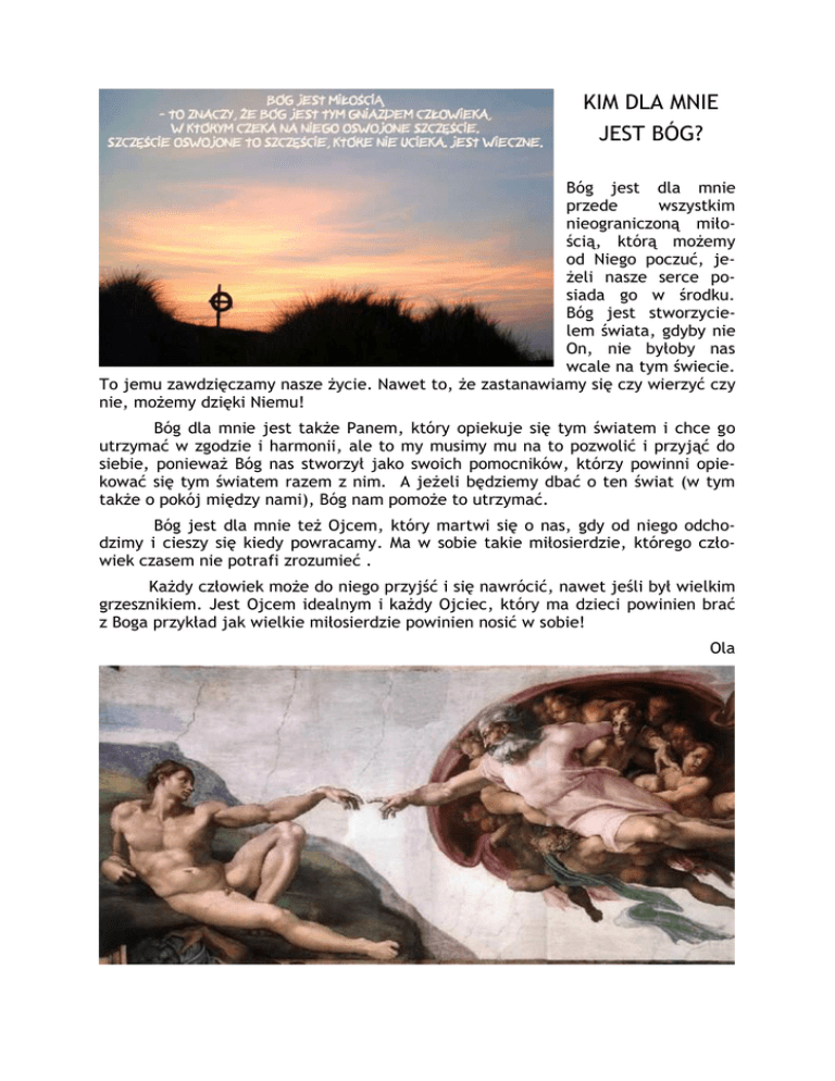 KIM DLA MNIE JEST BÓG? Bóg jest dla mnie przede wszystkim nieograniczoną miłością, którą możemy od Niego poczuć, jeżeli nasze serce posiada go w środku. Bóg jest stworzycielem świata, gdyby nie On, nie byłoby nas wcale na tym świecie. To jemu zawdzięczamy nasze życie. Nawet to, że zastanawiamy się czy wierzyć czy nie, możemy dzięki Niemu! Bóg dla mnie jest także Panem, który opiekuje się tym światem i chce go utrzymać w zgodzie i harmonii, ale to my musimy mu na to pozwolić i przyjąć do siebie, ponieważ Bóg nas stworzył jako swoich pomocników, którzy powinni opiekować się tym światem razem z nim. A jeżeli będziemy dbać o ten świat (w tym także o pokój między nami), Bóg nam pomoże to utrzymać. Bóg jest dla mnie też Ojcem, który martwi się o nas, gdy od niego odchodzimy i cieszy się kiedy powracamy. Ma w sobie takie miłosierdzie, którego człowiek czasem nie potrafi zrozumieć . Każdy człowiek może do niego przyjść i się nawrócić, nawet jeśli był wielkim grzesznikiem. Jest Ojcem idealnym i każdy Ojciec, który ma dzieci powinien brać z Boga przykład jak wielkie miłosierdzie powinien nosić w sobie! Ola