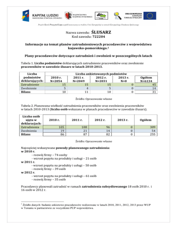 Nazwa zawodu: ŚLUSARZ Kod zawodu: 722204 Informacje na temat planów zatrudnieniowych pracodawców z województwa kujawsko-pomorskiego.1 Plany pracodawców dotyczące zatrudnień i zwolnień w poszczególnych latach Tabela 1. Liczba podmiotów deklarujących zatrudnienie pracowników oraz zwolnienie pracowników w zawodzie ślusarz w latach 2010-2013. Liczba podmiotów deklarujących: Zatrudnienie Zwolnienie Bilans 2010 r. N=2054 15 5 10 Liczba ankietowanych podmiotów 2011 r. 2012 r. 2013 r. N=2049 N=2031 N=0 15 15 0 4 5 0 11 10 0 Ogółem N=6134 45 14 31 Źródło: Opracowanie własne Tabela 2. Planowana wielkość zatrudnienia pracowników oraz zwolnienia pracowników w latach 2010-2013 (liczba osób wskazana w planach pracodawców w zawodzie ślusarz). Liczba osób ujęta w deklaracjach: Zatrudnienia Zwolnienia Bilans 2010 r. 105 19 86 2011 r. 108 21 87 2012 r. 2013 r. 96 14 82 Ogółem 0 0 0 309 54 255 Źródło: Opracowanie własne Najczęściej wskazywane powody planowanego zatrudnienia: w 2010 r. - rozwój firmy – 74 osoby - wzrost popytu na produkty i usługi – 21 osób w 2011 r. - wzrost popytu na produkty i usługi – 50 osób - rozwój firmy – 39 osób w 2012 r. - wzrost popytu na produkty i usługi – 61 osób - rozwój firmy – 35 osób Pracodawcy planowali zatrudnić w ramach zatrudnienia subsydiowanego 18 osób 2010 r. i 16 osób w 2012 r. 1 Źródło danych: badanie ankietowe pracodawców realizowane w latach 2010, 2011, 2012, 2013 przez WUP w Toruniu w partnerstwie ze wszystkimi PUP województwa. Najczęściej wskazywane powody planowanych zwolnień: w 2010 r. - pogorszenie sytuacji finansowej firmy – 10 osób - brak popytu na produkty, spadek liczby zamówień i zleceń – 9 osób w 2011 r. - brak popytu na produkty, spadek liczby zamówień i zleceń – 20 osób w 2012 r. - brak popytu na produkty, spadek liczby zamówień i zleceń – 7 osób - pracownik nie spełnia oczekiwań – 5 osób DANE OGÓŁEM Z CZTERECH EDYCJI BADANIA – 2010, 2011, 2012, 2013; N=309 (liczba osób planowanych do zatrudnienia) Profil pracodawcy: 1. 275 osób w zawodzie ślusarz planowano zatrudnić w podmiotach dużych. 2. Wszystkie oferty pochodziły od pracodawców z sektora prywatnego. 3. Zdecydowana większość (284) z sekcji: Przetwórstwo przemysłowe Potrzeby pracodawców: Oczekiwania wobec kandydatów na stanowiska pracy w zawodzie ślusarz: 1. Znajomość obsługi programów komputerowych Nie była wymagana w przypadku 262 wolnych miejsc pracy. 2. Znajomość języka obcego Pracodawcy nie oczekiwali znajomości języka w przypadku 299 stanowisk, tylko 4 oferty dotyczyły znajomości języka angielskiego. 3. Ogólne doświadczenie zawodowe Pracodawcy najczęściej poszukiwali kandydatów z dłuższym niż dwuletnie (124 oferty) oraz co najmniej dwuletnim (76 ofert) doświadczeniem zawodowym. W przypadku 41 ofert doświadczenie nie było wymagane. 4. Doświadczenie na podobnym stanowisku 48 oferowanych miejsc pracy nie wymagało od kandydatów doświadczenia w zawodzie ślusarza, 101 ofert wiązało się z dłuższym niż dwuletnie doświadczeniem, 91 - z co najmniej dwuletnim. 5. Cechy indywidualne Nie były wymagane tylko w przypadku 23 oferowanych miejsc pracy. Pracodawcy najczęściej wskazywali na 8 cech z 10 zamieszczonych w katalogu badania. Lista wybranych cech w kolejności od najczęściej oczekiwanej znajduje się poniżej (na jednym stanowisku można było wskazać kilka cech jednocześnie): • Staranność wykonywania pracy – 259 stanowisk2 • Obowiązkowość – 190 stanowisk • Umiejętność pracy zespołowej – 175 stanowisk 2 Oznacza to, że w przypadku 259 oferowanych miejsc pracy, pracodawca będzie oczekiwał od kandydata staranności wykonywania pracy. • Samodzielność – 152 stanowiska • Radzenie sobie ze stresującymi sytuacjami – 88 stanowisk • Szybkość uczenia się – 80 stanowisk • Gotowość do podnoszenia kwalifikacji – 69 stanowisk • Komunikatywność – 23 stanowiska 6. Wiedza specjalistyczna, ukończone dodatkowe specjalistyczne kursy, szkolenia W przypadku ponad połowy oferowanych stanowisk (179) pracodawcy nie będą wymagać dodatkowej wiedzy, 73 miejsca pracy dotyczyły posiadania wiedzy z zakresu technologii produkcji, 9 – znajomości zasad BHP. 7. Prawo jazdy Prawo jazdy nie było wskazywane na 287 stanowiskach, 5 wiązało się z posiadaniem prawa jazdy kategorii B. 8. Inne: 10 ofert dotyczyło znajomości rysunku technicznego, 4 - posiadania orzeczenia o stopniu niepełnosprawności.