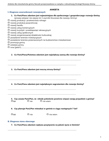 Ankieta dla mieszkańców gminy Stoczek przeprowadzana w związku z aktualizacją Strategii Rozwoju Gminy ANKIETA I. Diagnoza uwarunkowań rozwojowych 1. Co Pani/Pana zdaniem jest najważniejsze dla społecznego i gospodarczego rozwoju Gminy (proszę wskazać nie więcej niż 3 czynniki kluczowe dla rozwoju Gminy): 1 rozwój produkcji i przetwórstwa rolnego 1 rozwój produkcji pozarolniczej 1 rozwój handlu 1 rozwój usług komercyjnych 1 rozwój turystyki i przedsięwzięć rekreacyjnych 1 rozwój usług społecznych 1 rozwój zorganizowanej działalności kulturalnej 1 posiadanie terenów inwestycyjnych 1 posiadanie terenów przeznaczonych na budownictwo mieszkaniowe 1 promocja gminy 1 estetyka gminy 1 inne (jakie?)........................................................................................................................................... 2. Co Pani/Pana/Państwa zdaniem jest największą szansą dla rozwoju Gminy? ....................................................................................................................................................................... …………………………………………………………………………………………………………………………. 3. Co Pani/Pana zdaniem jest mocną stroną Gminy? ....................................................................................................................................................................... …………………………………………………………………………………………………………………………. 4. Co Pani/Pana zdaniem jest największym zagrożeniem dla rozwoju Gminy? ………………………………………………………………………………………………………………………… ………………………………………………………………………………………………………………………… 5. Czy uważa Pani/Pan, że młode pokolenie powinno wiązać swoją przyszłość z gminą? 1tak 1 nie 1 nie wiem 6. Czy planuje Pani/Pan mieszkać w gminie w ciągu następnych 7 lat? 1tak 1 nie 1 nie wiem II. Diagnoza stanu obecnego 7. Co Pani/Pana zdaniem wpływa pozytywnie na jakość życia w Gminie? ............................................................................................................................................................. 1 Ankieta dla mieszkańców gminy Stoczek przeprowadzana w związku z aktualizacją Strategii Rozwoju Gminy ............................................................................................................................................................. 8. Co Pani/Pana zdaniem wpływa negatywnie na jakość życia w Gminie? ............................................................................................................................................................. ............................................................................................................................................................. 9. Co Pani/Pana zdaniem należy zmienić/poprawić w Gminie w pierwszej kolejności? ............................................................................................................................................................. ............................................................................................................................................................. 10. Jak ocenia Pani/Pan sytuację społeczno-gospodarczą Gminy? 1 bardzo dobra 1 dobra 1 zadowalająca 1 zła 1 bardzo zła 1 nie mam zdania 11. Jak zmieniła się sytuacja materialna Pani/Pana rodziny w ciągu ostatnich 2 lat? 1 zdecydowanie się poprawiła 1 nieco poprawiła się 1 nieco pogorszyła się 1 nie zmieniła się 1 zdecydowanie pogorszyła się 12. Które dziedziny Pani/Pana zdaniem, powinny być szczególnie wspierane przez samorząd Gminy? Proszę zaznaczyć NIE WIĘCEJ NIŻ TRZY pozycje na liście: 1 bezpieczeństwo publiczne 1 pomoc społeczna 1 oświata i opieka przedszkolna 1 sport i rekreacja 1 przydomowe oczyszczalnie ścieków 1 ochrona zdrowia i profilaktyka 1 rozbudowa dróg 1 wodociągi i kanalizacja 1 zajęcia pozalekcyjne dla dzieci 1 działalność instytucji kultury 1 wsparcie organizacji społecznych 1 tereny rekreacyjne 1 czystość ulic i terenów publicznych 1 inna dziedzina (prosimy podać jaka?)……………………………………………...……………. 13. Jak ocenia Pani/Pan poszczególne dziedziny życia w Gminie (proszę wstawić oceny w skali od 1 – najgorzej, do 5 - najlepiej, 0 - nie mam zdania) 1. Możliwość znalezienia zatrudnienia 2. Warunki do prowadzenia działalności gospodarczej (handel i usługi, produkcja) 3. Warunki mieszkaniowe 4. Bezpieczeństwo mieszkańców 5. Udział mieszkańców w życiu publicznym 6. Dostępność i funkcjonowanie infrastruktury wodociągowej kanalizacja) 2 Ankieta dla mieszkańców gminy Stoczek przeprowadzana w związku z aktualizacją Strategii Rozwoju Gminy 7. Dostępność i funkcjonowanie infrastruktury kanalizacyjnej 8. Czystość i porządek w gminie, w tym gospodarka odpadami 9. Stan dróg i chodników 10. Dostępność i jakość działania pomocy społecznej 11. Dostępność i jakość działania przedszkoli 12. Poziom kształcenia w szkołach podstawowych 13. Poziom kształcenia w gimnazjach 14. Poziom kształcenia w liceum 15. Oferta kulturalna w gminie 16. Działanie podstawowej opieki zdrowotnej (lekarze I kontaktu, pielęgniarki) 17. Stan środowiska naturalnego 18. Atrakcje turystyczne/obsługa turystów 19. Warunki dla rekreacji i uprawiania sportów amatorskich 20. Ilość i jakość placówek handlowych 21. Dostęp do internetu 22. Dostępność transportu zbiorowego na terenie gminy (np. PKS -u, busów) 14. Czy jako mieszkaniec gminy czuje się Pani/Pan w niej bezpiecznie? 1zdecydowanie tak 1raczej tak 1raczej nie 1zdecydowanie nie 1nie mam zdania 15. Wed