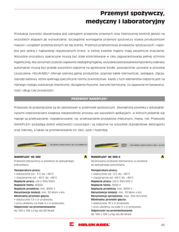 Przemysł spożywczy, medyczny i laboratoryjny Produkcja żywności obwarowana jest szeregiem przepisów prawnych oraz intensywnej kontroli jakości na wszystkich etapach jej wytwarzania. Szczególne wymagania przemysł spożywczy stawia producentom maszyn i urządzeń przeznaczonych do tej branży. Przemysł przetwórstwa produktów spożywczych i napojów jest jedną z najbardziej regulowanych branż, w której kwestie higieny mają zasadnicze znaczenie. Wszystkie procedury operacyjne muszą być stale kontrolowane w celu zagwarantowania pełnej ochrony higienicznej. Aby utrzymać czystość i zapewnić niezbędną higienę, wszystkie zastosowane komponenty z zakresu automatyki muszą być przede wszystkim odporne na agresywne środki, powszechnie używane w procesie czyszczenia. HELUKABEL® oferuje szeroką gamę produktów, poprzez kable sterownicze, zasilające, złącza, osprzęt kablowy, które spełniają specyficzne normy żywnościowe. Każdy z tych elementów odporny jest na różnego rodzaju substancje chemiczne, obciążenia fizyczne, warunki termiczne, co zapewnia im bezawaryjność i długi cykl żywotności. PRZEWODY NANOFLEX® Przewody te przeznaczone są do zastosowań w przemyśle spożywczym. Zewnętrzna powłoka z antybakteryjnymi właściwościami zwiększa niezawodność procesu we wszystkich aplikacjach, w których jedzenie lub napoje są przetwarzane, rozpakowywane, np. przetwarzanie produktów mlecznych, mięsa, ryb. Przewody NANOFLEX® posiadają dobre właściwości czyszczące i są odporne na wszystkie standardowe detergenty oraz mikroby, a także na promieniowanie UV, tlen, ozon i hydrolizę. NANOFLEX® HC 500 A NANOFLEX® HC 500-C Przewód sterowniczy w powłoce ze specjalnego poliuretanu Ekranowany przewód sterowniczy w powłoce ze specjalnego poliuretanu Temperatura pracy: • elastycznie od – 5°C do +80°C • stacjonarnie od – 40°C do +80°C Napięcie pracy: U0/U 300/500V Napięcie testu: 4000V Napięcie przebicia: min. 8000 V Rezystancja izolacji: min. 20 Mom x km Minimalny promień gięcia: • elastycznie 7,5 x ∅ przewodu • przy ułożeniu na stałe 4 x ∅ przewodu Odporność na promieniowanie: do 100 x 106 cJ/kg (do 80 Mrad) Temperatura pracy: • elastycznie od –5°C do +80°C • stacjonarnie od –40°C do +80°C Napięcie pracy: U0/U 300/500 V Napięcie testu: 3000 V Napięcie przebicia: min. 6000 V Rezystancja izolacji: min. 20 Mom x km Rezystancja sprzężenia: max. 250 Om/kme. Minimalny promień gięcia: • elastycznie 10 x ∅ przewodu • przy ułożeniu na stałe 5 x ∅ przewodu Odporność na promieniowanie: do 100 x 106 cJ/kg (do 80 Mrad) A 45 Przewody NANOFLEX® TRONIC, TRONIC-C. Specjalnie opracowany materiał izolacyjny przyczynia się zapobieganiu skażeniom wywołanym przez zanieczyszczenia i rozwój mikroorganizmów na osłonach zewnętrznych. Przewody są odporne na wszystkie standardowe detergenty i dają się łatwo czyścić. Dla zastosowanego materiału przeciwbakteryjnego wydano FCN (Food Contact Notification). Posiadamy świadectwo z badań uznające właściwości przeciwbakteryjne, wydane przez federalną agencję badań materiałowych. Ekranowany przewód sterowniczy ze specjalnego PUR do przesyłu danych, kolorowe żyły. Wszystkie przewody NANOFLEX® są samogasnące i płomienioodporne, zgodnie z DIN VDE 0482–332–1-2, DIN EN 60332–1/ IEC 60332–1 (zgodny z normą DIN VDE 0472 część 804, test metodą B). Materiały użyte do ich produkcji nie zawierają silikonu, kadmu ani substancji zakłócających lakierowanie. NANOFLEX® HC TRONIC A NANOFLEX® HC TRONIC-C A Przewód sterowniczy ze specjalnego PUR do przesyłu danych, kolorowe żyły. Ekranowany przewód sterowniczy ze specjalnego PUR do przesyłu danych, kolorowe żyły Temperatura pracy: • elastycznie od –5°C do +80°C • stacjonarnie od –40°C do +80°C Szczytowe napięcie robocze: (nie nadaje się do zastosowań silnoprądowych) • 0,14 mm² = 350 V • 0,25 mm² = 500 V Napięcie testu: • do 0,25 mm² 1200 V • od 0,34 mm² 4000 V Napięcie przebicia: • do 0,25 mm² 2400 V • od 0,34 mm² 4000 V Rezystancja izolacji min. 20 Mom x km Pojemność (wartość przybliżona) dla 800 Hz • 0,14 mm² 120pF/m • 0,25 mm² 150pF/m Indukcyjność: ok. 0,65 mH/km Impedancja: ok. 78 Om Minimalny promień gięcia: • elastycznie 7,5 x ∅ przewodu • przy ułożeniu na stałe 4 x ∅ przewodu Odporność na promieniowanie: do 100 x 106 cJ/kg (do 80 Mrad) Temperatura pracy: • elastycznie od –5°C do +80°C • stacjonarnie od –40°C do +80°C Szczytowe napięcie robocze (nie nadaje się do zastosowań silnoprądowych) • 0,14 mm² = 350V • 0,25 mm² = 500V Napięcie testu: • żyła/żyła 1200V • żyła/ekran 800V Napięcie przebicia: min. 2400 V Rezystancja izolacji: min. 20 Mom x km Pojemność (wartość przybliżona) dla 800 Hz • żyła/żyła 0,14 mm² 120pF/m • żyła/żyła 0,25 mm² 150pF/m • żyła/żyła 0,14 mm² 240pF/m • żyła/żyła 0,25 mm² 270pF/m Indukcyjność: ok. 0,65 mH/km Impedancja: ok. 78 Om Rezystancja sprzężenia: max. 250 Om/km Minimalny promień gięcia: • elastycznie 10 x ∅ przewodu • przy ułożeniu na stałe 5 x ∅ przewodu Odporność na promieniowanie: do 100 x 106 cJ/kg (do 80 Mrad) Ofertę dla branży spożywczej uzupełniają przewody: H05VV5-F, H05VVC4V5-K – zalecane do pracy w wilgotnym środowisku, do zasilania i sterowania pracy maszyn w browarach, rozlewniach, myjniach samochodowych A 46 A OZ-BL, OZ-BL-CY, OB-BL-PAAR-CY stosowane na obszarach niebezpiecznych, zagrożonych wybuchem A A A BIOFLEX-500®-JZ, BIOFLEX-500®-JZ-C przewody sterownicze o dużej odporności na ścieranie i rozdarcie oraz bio-paliwa, oleje, emulsje chłodzące, są również odporne na działanie bakterii, tlen i ozon. A A KOMPOFLEX®JZ-500, KOMPOFLEX®JZ-500-C bardzo wytrzymałe, bezhalogenowe przewody sterownicze, odporne na działanie mikrobów, UV, tlen, ozon, kwasy hydrofluorowe i