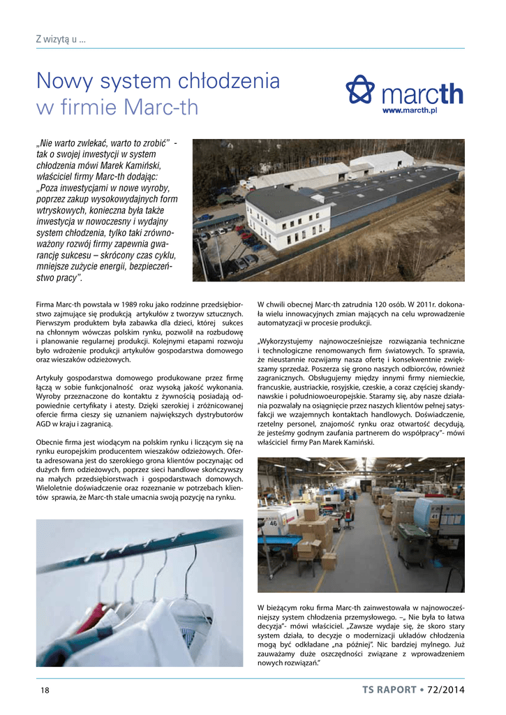 Z wizytą u ... Nowy system chłodzenia w firmie Marc-th „Nie warto zwlekać, warto to zrobić” tak o swojej inwestycji w system chłodzenia mówi Marek Kamiński, właściciel firmy Marc-th dodając: „Poza inwestycjami w nowe wyroby, poprzez zakup wysokowydajnych form wtryskowych, konieczna była także inwestycja w nowoczesny i wydajny system chłodzenia, tylko taki zrównoważony rozwój firmy zapewnia gwarancję sukcesu – skrócony czas cyklu, mniejsze zużycie energii, bezpieczeństwo pracy”. Firma Marc-th powstała w 1989 roku jako rodzinne przedsiębiorstwo zajmujące się produkcją artykułów z tworzyw sztucznych. Pierwszym produktem była zabawka dla dzieci, której sukces na chłonnym wówczas polskim rynku, pozwolił na rozbudowę i planowanie regularnej produkcji. Kolejnymi etapami rozwoju było wdrożenie produkcji artykułów gospodarstwa domowego oraz wieszaków odzieżowych. Artykuły gospodarstwa domowego produkowane przez firmę łączą w sobie funkcjonalność oraz wysoką jakość wykonania. Wyroby przeznaczone do kontaktu z żywnością posiadają odpowiednie certyfikaty i atesty. Dzięki szerokiej i zróżnicowanej ofercie firma cieszy się uznaniem największych dystrybutorów AGD w kraju i zagranicą. Obecnie firma jest wiodącym na polskim rynku i liczącym się na rynku europejskim producentem wieszaków odzieżowych. Oferta adresowana jest do szerokiego grona klientów poczynając od dużych firm odzieżowych, poprzez sieci handlowe skończywszy na małych przedsiębiorstwach i gospodarstwach domowych. Wieloletnie doświadczenie oraz rozeznanie w potrzebach klientów sprawia, że Marc-th stale umacnia swoją pozycję na rynku. W chwili obecnej Marc-th zatrudnia 120 osób. W 2011r. dokonała wielu innowacyjnych zmian mających na celu wprowadzenie automatyzacji w procesie produkcji. „Wykorzystujemy najnowocześniejsze rozwiązania techniczne i technologiczne renomowanych firm światowych. To sprawia, że nieustannie rozwijamy nasza ofertę i konsekwentnie zwiększamy sprzedaż. Poszerza się grono naszych odbiorców, również zagranicznych. Obsługujemy między innymi firmy niemieckie, francuskie, austriackie, rosyjskie, czeskie, a coraz częściej skandynawskie i południowoeuropejskie. Staramy się, aby nasze działania pozwalały na osiągnięcie przez naszych klientów pełnej satysfakcji we wzajemnych kontaktach handlowych. Doświadczenie, rzetelny personel, znajomość rynku oraz otwartość decydują, że jesteśmy godnym zaufania partnerem do współpracy”- mówi właściciel firmy Pan Marek Kamiński. W bieżącym roku firma Marc-th zainwestowała w najnowocześniejszy system chłodzenia przemysłowego. –„ Nie była to łatwa decyzja”- mówi właściciel. „Zawsze wydaje się, że skoro stary system działa, to decyzje o modernizacji układów chłodzenia mogą być odkładane „na później”. Nic bardziej mylnego. Już zauważamy duże oszczędności związane z wprowadzeniem nowych rozwiązań.” 18 TS RAPORT • 72/2014 Z wizytą u ... Firma Wadim Plast Narojek Sp. J. przy współpracy z dostawcą urządzeń chłodniczych firmą Frigel Firenze z Włoch oddała w bieżącym roku do użytku nowy dwu-obiegowy system chłodzenia oleju i form. Przedmiotem dostawy był projekt, urządzenia chłodnicze, zestawy pompowe, zbiorniki oraz modernizacja i budowa nowego systemu rur na hali. Część istniejących urządzeń chłodniczych została wykorzystana przy budowie nowego systemu chłodzenia. W obecnej chwili, jeden obieg chłodzenia, nie izolowany cieplnie, służy do chłodzenia oleju wtryskarek. Drugi obieg, izolowany cieplnie od otoczenia, służy do chłodzenia form bezpośrednio lub poprzez termostaty stanowiskowe. 1. Obieg chłodzenia oleju Obieg chłodzenia oleju wykorzystuje energooszczędną chłodnię wentylatorową Frigel o mocy chłodzenia 240 kW, która schładza medium do temperatury nastawy. Chłodzenie medium (wody z glikolem) polega na przepuszczaniu otaczającego powietrza przez wymiennik w chłodni w kształcie litery V. Latem, w sytuacji gdy temperatura w obiegu przekroczy zadaną wartość, system automatycznie poda niewielką ilość czystej wody z zewnętrznego źródła - nie bezpośrednio na wymiennik chłodni, ale pomiędzy specjalne filtry tworzące tzw. komorę adiabatyczną (patent firmy Frigel Firenze). Dzięki temu eliminuje się kontakt wody z powierzchnią wymiennika ciepła i konieczność jego częstego czyszczenia. Zraszanie obniża temperaturę zasysanego powietrza, co sprawia, że medium na wyjściu z chłodni ma temperaturę zazwyczaj nie wyższą niż 30-32 °C. Zestaw pomp głównych składa się z dwóch pomp i tłoczy zimne medium na wymienniki we wtryskarkach. Założono, że pracuje jedna pompa, a druga jest w 100 % zapasowa. Zamiana pomp odbywa się automatycznie. Regulacja ciśnienia medium w układzie oleju odbywa się poprzez tzw. falownik. Nastawa ciśnienia w układzie oleju może wynosić tylko 1,5 bar! (co świadczy o dobrym przewymiarowaniu systemu rur i energooszczędnej pracy systemu pomp). Ogrzane przez wymienniki wtryskarek medium kierowane jest do filtra z przyłączami 4 cale wyposażonego w czujniki ciśnienia informujące o stanie zabrudzenia wkładu filtra. Jeżeli różnica ciśnień wynosić będzie powyżej określonej wartości, nastąpi alarm na panelu PMR 0 informujący o konieczności czyszczenia filtra. Chłodnia firmy Frigel wyposażona jest w nowoczesne silniki bezszczotkowe – zapewniające energooszczędność i brak zakłóceń elektromagnetycznych. Wszystkie wentylatory chłodni posiadają płynną regulację prędkości obrotowej. Centralny panel sterowania PMR 0 steruje płynną pracą wszystkich wentylatorów w chłodni, zraszacza oraz jej pompy pomocniczej. Jeżeli temperatura w układzie chłodzenia oleju przekroczy ustaloną wartość, to załączy się do pracy istniejąca chłodnia wentylatorowa o mocy chłodzenia około 300 kW wraz z jej pomp