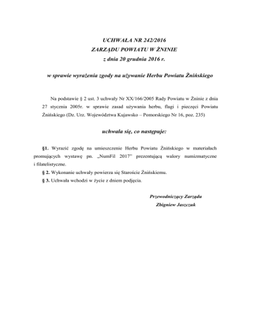UCHWAŁA NR 242/2016 ZARZĄDU POWIATU W ŻNINIE z dnia 20 grudnia 2016 r. w sprawie wyrażenia zgody na używanie Herbu Powiatu Żnińskiego Na podstawie § 2 ust. 3 uchwały Nr XX/166/2005 Rady Powiatu w Żninie z dnia 27 stycznia 2005r. w sprawie zasad używania herbu, flagi i pieczęci Powiatu Żnińskiego (Dz. Urz. Województwa Kujawsko – Pomorskiego Nr 16, poz. 235) uchwala się, co następuje: §1. Wyrazić zgodę na umieszczenie Herbu Powiatu Żnińskiego w materiałach promujących wystawę pn. „NumFil 2017” prezentującą walory numizmatyczne i filatelistyczne. § 2. Wykonanie uchwały powierza się Staroście Żnińskiemu. § 3. Uchwała wchodzi w życie z dniem podjęcia. Przewodniczący Zarządu Zbigniew Jaszczuk Uzasadnienie Polski Związek Filatelistów Koło Terenowe w Żninie zwrócił się z wnioskiem o wyrażenie zgody na użycie Herbu Powiatu Żnińskiego w materiałach promujących wystawę numizmatyczną i filatelistyczną „NumFil 2017”, która będzie miała miejsce na początku 2017 roku w Muzeum Ziemi Pałuckiej w Żninie. Koło Terenowe działa na terenie całego Powiatu Żnińskiego aktywnie włączając się w inicjatywy służące m.in. edukacji młodzieży szkolnej. Zarząd Powiatu w Żninie na podstawie § 2 ust. 3 uchwały Nr XX/166/2005 Rady Powiatu w Żninie z dnia 27 stycznia 2005r. w sprawie zasad używania herbu, flagi i pieczęci Powiatu Żnińskiego wyraża zgodę na umieszczenie w materiałach promocyjnych poświęconych ww. wystawie Herbu Powiatu Żnińskiego. Biorąc powyższe pod uwagę podjęcie uchwały jest uzasadnione i zgodne z przyjętą procedurą używania Herbu Powiatu Żnińskiego. ŁK/HC Przewodniczący Zarządu Zbigniew Jaszczuk