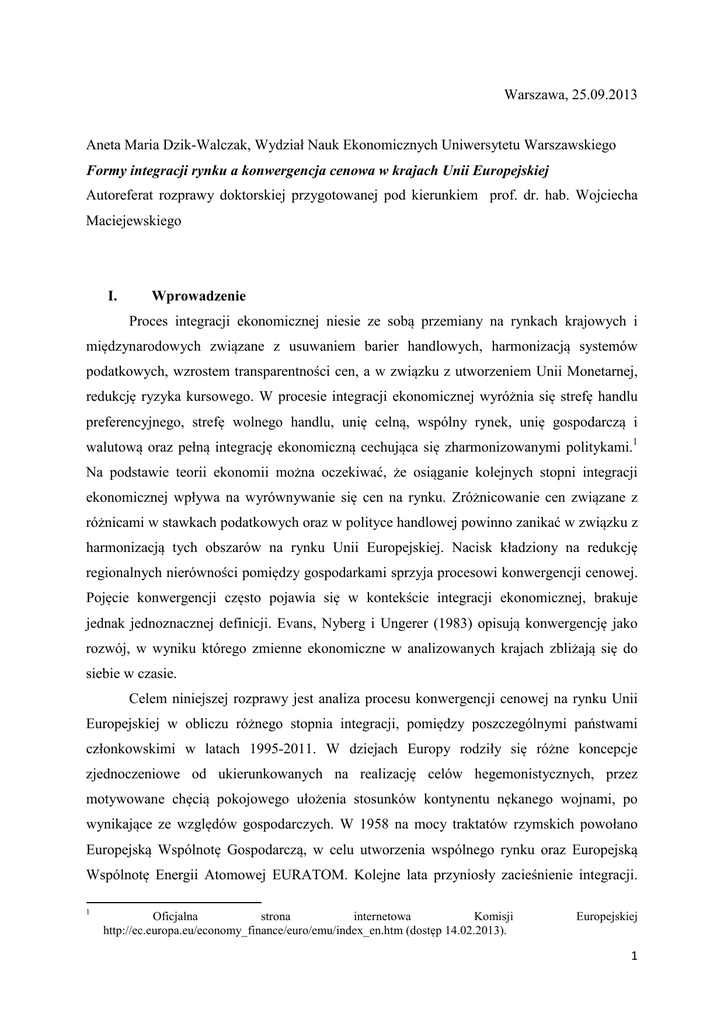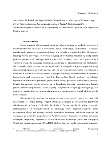 Warszawa, 25.09.2013 Aneta Maria Dzik-Walczak, Wydział Nauk Ekonomicznych Uniwersytetu Warszawskiego Formy integracji rynku a konwergencja cenowa w krajach Unii Europejskiej Autoreferat rozprawy doktorskiej przygotowanej pod kierunkiem prof. dr. hab. Wojciecha Maciejewskiego I. Wprowadzenie Proces integracji ekonomicznej niesie ze sobą przemiany na rynkach krajowych i międzynarodowych związane z usuwaniem barier handlowych, harmonizacją systemów podatkowych, wzrostem transparentności cen, a w związku z utworzeniem Unii Monetarnej, redukcję ryzyka kursowego. W procesie integracji ekonomicznej wyróżnia się strefę handlu preferencyjnego, strefę wolnego handlu, unię celną, wspólny rynek, unię gospodarczą i walutową oraz pełną integrację ekonomiczną cechująca się zharmonizowanymi politykami.1 Na podstawie teorii ekonomii można oczekiwać, że osiąganie kolejnych stopni integracji ekonomicznej wpływa na wyrównywanie się cen na rynku. Zróżnicowanie cen związane z różnicami w stawkach podatkowych oraz w polityce handlowej powinno zanikać w związku z harmonizacją tych obszarów na rynku Unii Europejskiej. Nacisk kładziony na redukcję regionalnych nierówności pomiędzy gospodarkami sprzyja procesowi konwergencji cenowej. Pojęcie konwergencji często pojawia się w kontekście integracji ekonomicznej, brakuje jednak jednoznacznej definicji. Evans, Nyberg i Ungerer (1983) opisują konwergencję jako rozwój, w wyniku którego zmienne ekonomiczne w analizowanych krajach zbliżają się do siebie w czasie. Celem niniejszej rozprawy jest analiza procesu konwergencji cenowej na rynku Unii Europejskiej w obliczu różnego stopnia integracji, pomiędzy poszczególnymi państwami członkowskimi w latach 1995-2011. W dziejach Europy rodziły się różne koncepcje zjednoczeniowe od ukierunkowanych na realizację celów hegemonistycznych, przez motywowane chęcią pokojowego ułożenia stosunków kontynentu nękanego wojnami, po wynikające ze względów gospodarczych. W 1958 na mocy traktatów rzymskich powołano Europejską Wspólnotę Gospodarczą, w celu utworzenia wspólnego rynku oraz Europejską Wspólnotę Energii Atomowej EURATOM. Kolejne lata przyniosły zacieśnienie integracji. 1 Oficjalna strona internetowa Komisji http://ec.europa.eu/economy_finance/euro/emu/index_en.htm (dostęp 14.02.2013). Europejskiej 1 Chcąc uodpornić Wspólnotę na wahania kursowe kraje członkowskie Europejskiej Wspólnoty Gospodarczej wprowadziły w 1972 dla wszystkich walut maksymalny dopuszczalny zakres wahań kursowych, a dla zapewnienia funkcjonowania systemu utworzono Europejski Fundusz Współpracy Walutowej. W celu wzmocnienia współpracy w sferze polityki walutowej powstał Europejski System Walutowy, którego istotę stanowiły Europejski Mechanizm Kursowy oraz europejska jednostka rozrachunkowa, ECU (European Currency Unit), będąca zalążkiem wspólnej waluty. Kolejnym krokiem w kierunku pełnej integracji gospodarczej i walutowej, było uchwalenie Jednolitego Aktu Europejskiego. Przewidywano utworzenie jednolitego rynku, funkcjonującego na podstawie swobody przepływu osób, towarów, usług i kapitału. Dążono do wyeliminowania kosztów transakcyjnych związanych z wymianą walut i redukcji wahań kursowych poprzez utworzenie Unii Walutowej. W Traktacie z Maastricht, który wszedł w życie w 1993 roku sprecyzowano etapy tworzenia Unii Gospodarczej i Walutowej. Założono również zacieśnienie współpracy między bankami centralnymi oraz wzmocnienie koordynacji polityk gospodarczych państw członkowskich. W 1999 działalność rozpoczął Europejski Bank Centralny oraz usztywniono kursy wymiany walut.2 W 2000 przyjęto Strategię Lizbońską, której celem było uczynienie z Unii Europejskiej najbardziej dynamicznej, konkurencyjnej i opartej na wiedzy gospodarki na świecie, zdolnej do zapewnienia zrównoważonego wzrostu. Traktat nicejski, miał umożliwić Unii Europejskiej sprawne działanie po przyjęciu nowych krajów z Europy Środkowej i Południowej. Kolejne traktaty wprowadzały zmiany instytucjonalne mające usprawnić proces decyzyjny i umocnić pozycję Wspólnoty na arenie międzynarodowej. Teoretyczne ramy analizy konwergencji cenowej Z procesem konwergencji cenowej wiążą się nierozerwalnie główne koncepcje makroekonomiczne. Goldberg i Knetter (1997) jako teorie ekonomii wyjaśniające kształtowanie się cen wymieniają prawo jednej ceny (ang. law of one price- LOOP), mechanizm transmisji kursu walutowego (ang. exchange rate pass-through), mechanizm pricing-to-market. Analiza prawa jednej ceny prowadzi natomiast do teorii parytetu siły nabywczej (ang. purchasing power parity - PPP) i efektu Ballasy-Samuelsona. Działania 2 W 1999 usztywniono kursy walut w następujących państwach: Austria, Belgia, Finlandia, Francja, Hiszpania, Holandia, Irlandia, Luksemburg, Niemcy, Portugalia i Włochy. W późniejszych latach kolejne kraje przystąpiły do trzeciego etapu UGW i dołączyły do strefy euro: Grecja (2001), Słowenia (2007), Cypr (2008), Malta (2008), Słowacja (2009). 2 podejmowane przez banki centralne w związku z realizacją polityki pieniężnej i fiskalnej również znajdują odzwierciedlenie w cenach dóbr. Punktem wyjścia dla teoretycznych rozważań konwergencji cenowej jest prawo jednej ceny stanowiące, że na konkurencyjnych rynkach wolnych od kosztów transport i oficjalnych barier handlowych homogeniczne dobra są sprzedawane po tej samej cenie. W przeciwnym wypadku, różnice cenowe dają możliwość arbitrażu. Prawo jednej ceny implikuje, że cena dobra jest taka sama w krajach oraz po przeliczeniu na wspólną walutę. Jeśli dla dobra prawo jednej ceny zachodzi dla wszystkich analizowanych krajów to mówimy, że badany rynek jest zintegrowany. W związku z tym, że spełnienie założeń o braku kosztów transportu i barier handlowych jest mało prawdopodobne zdefiniowano relatywną wersję prawa jednej cen
