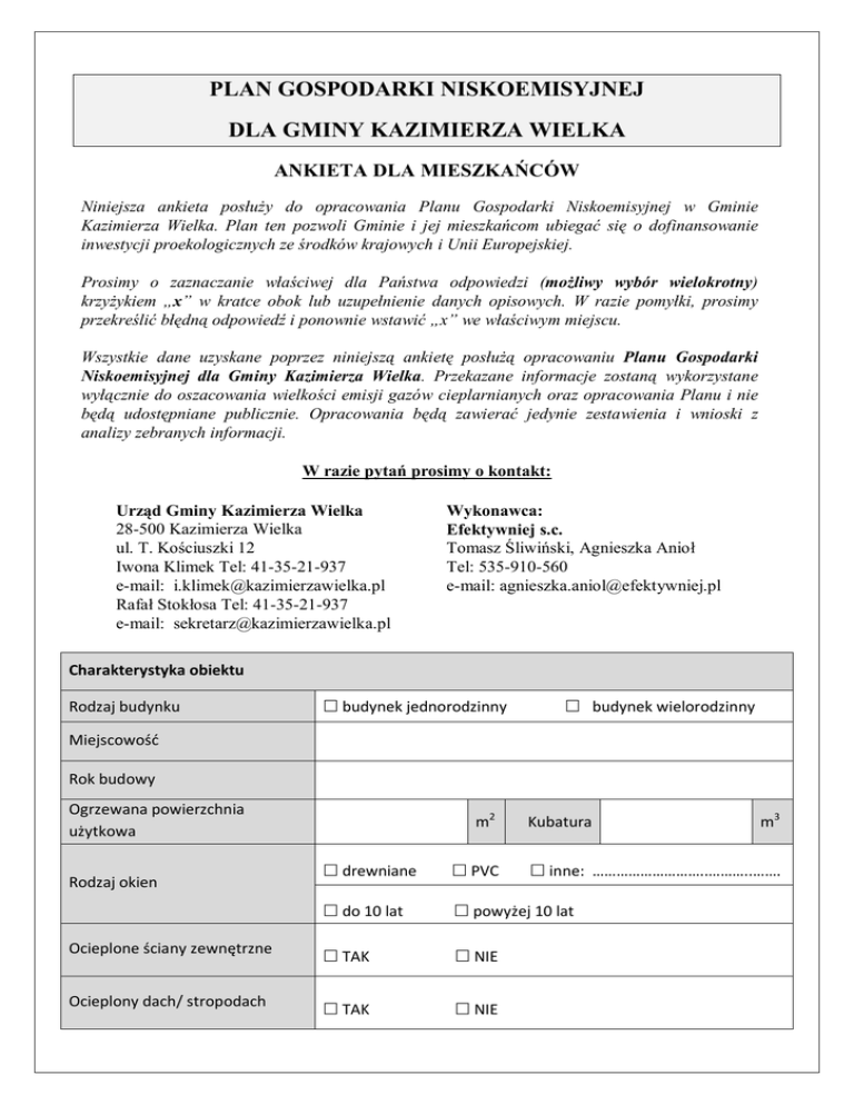PLAN GOSPODARKI NISKOEMISYJNEJ DLA GMINY KAZIMIERZA WIELKA ANKIETA DLA MIESZKAŃCÓW Niniejsza ankieta posłuży do opracowania Planu Gospodarki Niskoemisyjnej w Gminie Kazimierza Wielka. Plan ten pozwoli Gminie i jej mieszkańcom ubiegać się o dofinansowanie inwestycji proekologicznych ze środków krajowych i Unii Europejskiej. Prosimy o zaznaczanie właściwej dla Państwa odpowiedzi (możliwy wybór wielokrotny) krzyżykiem „x” w kratce obok lub uzupełnienie danych opisowych. W razie pomyłki, prosimy przekreślić błędną odpowiedź i ponownie wstawić „x” we właściwym miejscu. Wszystkie dane uzyskane poprzez niniejszą ankietę posłużą opracowaniu Planu Gospodarki Niskoemisyjnej dla Gminy Kazimierza Wielka. Przekazane informacje zostaną wykorzystane wyłącznie do oszacowania wielkości emisji gazów cieplarnianych oraz opracowania Planu i nie będą udostępniane publicznie. Opracowania będą zawierać jedynie zestawienia i wnioski z analizy zebranych informacji. W razie pytań prosimy o kontakt: Urząd Gminy Kazimierza Wielka 28-500 Kazimierza Wielka ul. T. Kościuszki 12 Iwona Klimek Tel: 41-35-21-937 e-mail: [email protected] Rafał Stokłosa Tel: 41-35-21-937 e-mail: [email protected] Wykonawca: Efektywniej s.c. Tomasz Śliwiński, Agnieszka Anioł Tel: 535-910-560 e-mail: [email protected] Charakterystyka obiektu Rodzaj budynku budynek jednorodzinny budynek wielorodzinny Miejscowość Rok budowy Ogrzewana powierzchnia użytkowa m2 Kubatura drewniane PVC do 10 lat powyżej 10 lat Ocieplone ściany zewnętrzne TAK NIE Ocieplony dach/ stropodach TAK NIE Rodzaj okien m3 inne: ………………………..………..……. Charakterystyka źródeł ciepła Sposób ogrzewania pomieszczeń kotłownia węglowa, ekogroszek kocioł na pelet kotłownia olejowa kotłownia gazowa ogrzewanie elektryczne pompa ciepła sieć miejska gaz LPG inne: …………………………………………………………. Moc: Wiek kotła w latach: kotłownia węglowa, ekogroszek kotłownia olejowa ogrzewanie elektryczne Sposób przygotowania ciepłej sieć miejska inne: ……………………………………………… wody użytkowej (CWU) kocioł na pelet kotłownia gazowa pompa ciepła kolektory słoneczne gaz LPG Moc: Wiek kotła w latach: TAK * NIE * jeśli „TAK”: Rodzaj OZE (np. fotowoltaika, kolektory słoneczne, turbiny wiatrowe): Aktualnie wykorzystywane odnawialne źródła energii (OZE) Moc zainstalowanych urządzeń: Ilość : Cel (przeznaczenie) wykorzystywania OZE: Roczne zużycia paliw i energii DO OGRZEWANIA (dane za cały rok 2014, a w przypadku danych z lat wcześniejszych lub innego okresu czasu niż styczeń-grudzień prosimy o adnotację) Zużycie energii elektrycznej kWh/rok (na ogrzewanie i cwu) Zużycie oleju opałowego m3/rok Zużycie gazu LPG m3/rok Zużycie węgla ton (Mg) /rok Zużycie innego paliwa ………………………….……(rodzaj) ………../rok PRACE TERMOMODERNIZACYJNE Wymiana okien wykonano w ciągu ostatnich 10 lat planowane w ciągu najbliższych 5 lat nie widzę potrzeby Ocieplenie ścian wykonano w ciągu ostatnich 10 lat planowane w ciągu najbliższych 5 lat nie widzę potrzeby Ocieplenie dachu/ stropodachu wykonano w ciągu ostatnich 10 lat planowane w ciągu najbliższych 5 lat nie widzę potrzeby Planuję wymianę źródła ciepła (kotła) do ogrzewania budynku na: ekogroszek gazowe Planuję wymianę źródła ciepła (kotła) do przygotowania ciepłej wody użytkowej (CWU) na: Planuję zakup i montaż odnawialnych źródeł energii (OZE) (np. kolektory słoneczne, fotowoltaika, pompa ciepła, wiatraki) ekogroszek gazowe kolektory słoneczne biomasa/pelet pompa ciepła inne…………………………………….………………………………….. NIE PLANUJĘ biomasa/pelet pompa ciepła inne…………………………………….………………………………..… NIE PLANUJĘ TAK : rodzaj………………………………………………………………………………….…… Ilość, moc ……………………………..……………………………………………………………… NIE Informacje uzupełniające Czy do 2020 roku planowane są przedsięwzięcia inwestycyjne mające znaczący wpływ na zmianę zużycia nośników energii? np. rozbudowa budynków, zmiana technologii, termomodernizacja, zakup energooszczędnych urządzeń, itp. Opis: TAK NIE TRANSPORT – informacje o pojazdach osobowe motocykl Ciągnik rolniczy, kombajn lub inne Liczba samochodów Benzyna Zużycie paliwa roczne (w przybliżeniu) szt. Benzyna + LPG szt. Benzyna Diesel szt. Litry Benzyna szt. Litry Benzyna + LPG szt. Benzyna Diesel szt. Litry Benzyna szt. Litry Benzyna + LPG szt. Benzyna Diesel szt. Litry litry LPG litry LPG litry LPG NIE, ponieważ (brak funduszy, nie widzę sensu takich działań) …………………………………………………………………………………………………………………………………… Jeśli „TAK”, jaki maksymalny wkład własny mógłby być wniesiony? 30% 50% 70% Litry Litry Litry Czy są Państwo zainteresowani udziałem w działaniach gminy Kazimierza Wielka na rzecz redukcji CO2 poprzez np. wymianę źródła ciepła na niskoemisyjne? TAK Litry inny (jaki) .…………% Uwagi, spostrzeżenia: ……………………………………………………………………………………………………………………………………………… ……………………………………………………………………………………………………………………………………………… ……………………………………………………………………………………………………………………………………………… ……………………………………………………………………………………………………………………………………
