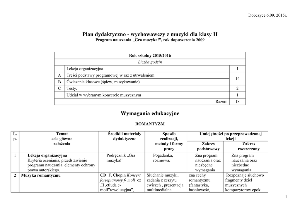 Dobczyce 6.09. 2015r. Plan dydaktyczno - wychowawczy z muzyki dla klasy II Program nauczania „Gra muzyka!”, rok dopuszczenia 2009 Rok szkolny 2015/2016 Liczba godzin Lekcja organizacyjna 1 A Treści podstawy programowej w raz z utrwaleniem. B Ćwiczenia klasowe (śpiew, muzykowanie). C Testy. 2 Udział w wybranym koncercie muzycznym 1 14 Razem 18 Wymagania edukacyjne ROMANTYZM L. p. 1 2 Temat cele główne założenia Lekcja organizacyjna Kryteria oceniania, przedstawienie programu nauczania, elementy ochrony prawa autorskiego. Muzyka romantyzmu Środki i materiały dydaktyczne Podręcznik „Gra muzyka!” CD: F. Chopin Koncert fortepianowy f- moll cz .II ,etiuda cmoll”rewolucyjna”, Sposób realizacji, metody i formy pracy Pogadanka, rozmowa. Słuchanie muzyki, zadania z zeszytu ćwiczeń , prezentacja multimedialna. Umiejętności po przeprowadzonej lekcji Zakres Zakres podstawowy rozszerzony Zna program nauczania oraz niezbędne wymagania zna cechy romantyzmu (fantastyka, baśniowość, Zna program nauczania oraz niezbędne wymagania Rozpoznaje słuchowo fragmenty dzieł muzycznych kompozytorów epoki. 1 H.Wieniawski- ShercoTarantela, S. Moniuszko- „ Prząsniczka”, N. Paganini- Kaprys. 3 4 Chopin o sobie przybliżenie postaci kompozytora (okresu młodzieńczego – Warszawa, Wiedeń), poznanie wybranych utworów Chopina jako ważnych faktów jego życia, docenienie folkloru, jako źródła inspiracji, uświadomienie roli dokumentów z epoki (listy, recenzje) jako przekazu wiedzy i możliwości bliższego obcowania z postacią kompozytora, ukazanie postaci Chopina jako twórcy narodowego stylu w muzyce a także modelu patriotycznej postawy (przywiązanie do narodowej tradycji, utożsamianie się z losem rodaków, poczucie odpowiedzialności za losy ojczyzny). Śpiewanie piosenki do wyboru CD: F. Chopin – Mazurki: D-dur i B- dur, II i III cz. Koncertu fmoll, Etiuda c-moll „Rewolucyjna”, Polonez A-dur Prezentacja multimedialna, słuchanie muzyki – obserwacja, na rytmie jakich tańców oparte są mazurki, przebiegu utworu, stylu narodowego, gra na instrumencie rozwiązanie arkusza ucznia. wyrażanie osobistych uczuć) Zna przedstawicieli romantyzmu (Wieniawski,Moniuszko,Paganini, Chopin), charakteryzuje epokę wie, kim był F. Chopin. zna najważniejsze fakty z życia kompozytora, umie wymienić kilka utworów Chopina Zna założenia romantyzmu jako stylu w muzyce umie rozpoznać, na rytmie jakich tańców Chopin oparł Mazurki D-dur i B -dur, potrafi bezbłędnie wypełnić arkusz wiedzy o Chopinie potrafi uzasadnić fakt, że Chopin był pierwszym w Europie twórcą narodowego stylu w muzyce 2 5 Muzyka narodowa uwrażliwienie na charakterystyczne cechy utworów opartych na folklorze różnych narodów, głównie europejskich, ukazanie folkloru jako inspiracji w twórczości kompozytorów, To, co polskie ludowe – to, co polskie narodowe zaznajomienie z polskimi tańcami narodowymi (charakter, kroki podstawowe, figury taneczne), przedstawienie sylwetki Stanisława Moniuszki, przypomnienie ze szkoły podstawowej librett oper: Straszny dwór i Halka, podkreślenie roli muzyki narodowej w obronie i rozwoju polskiej kultury w czasach niewoli, doskonalenie śpiewu i gry na instrumentach. CD: H. Wieniawski Kujawiak, B. Smetana Wełtawa, M. Musorgski Hopak, P. Czajkowski Taniec rosyjski i Taniec hiszpański z Dziadka do orzechów „Plansze demonstracyjne – muzyka”– tablice: Polonez, Mazur, Kujawiak, Oberek; dzwonki; CD: F. Chopin Polonez A-dur, S. Moniuszko Dziad i baba, Mazur z opery Halka; DVD: opera Halka dyskusja słuchanie muzyki – obserwacja charakterystycznych cech wskazujących, na jakim folklorze oparty jest utwór śpiew piosenki gra na instrumentach tematów utworów gra na instrumentach rozmowa nauczająca obserwacja na planszach strojów i figur tanecznych taniec – poznanie kroków podstawowych i niektórych figur polskich tańców narodowych zaprezentowanie fragmentu opery Halka czytanie listów Moniuszki słuchanie muzyki – zwrócenie uwagi na charakter i nastrój utworów śpiew melodii ze Strasznego dworu wie, co to są szkoły narodowe w epoce romantyzmu zna głównych twórców szkoły czeskiej, polskiej, rosyjskiej wie, co to jest stylizacja potrafi wymienić polskie tańce narodowe umie rozróżnić rytmy i charakter polskich tańców wie, kim był Stanisław Moniuszko zna główne fakty z życia kompozytora zna libretto Strasznego dworu i Halki potrafi rozróżnić muzykę opartą na folklorze polskim, rosyjskim i czeskim umie wskazać pojawienie się motywu Bieriozki w IV Symfonii Czajkowskiego potrafi zagrać temat z poematu symfonicznego Wełtawa potrafi wyklaskać rytm niektórych polskich tańców umie zatańczyć kilka figur wybranego tańca polskiego umie zagrać motyw Poloneza A-dur Chopina umie zaśpiewać melodię z opery Straszny dwór Moniuszki 3 6 Folklor polski uświadomienie uczniom istoty i funkcji folkloru w kulturze, uwrażliwienie na charakterystyczne cechy poznanych polskich pieśni i tańców ludowych, ukazanie bogactwa polskiego folkloru (muzyka, przyśpiewki, pieśni, instrumenty, kapele, stroje), przedstawienie sylwetki Oskara Kolberga – polskiego etnografa, przybliżenie regionów Polski, poznanie terminów związanych z folklorem polskim, oddanie ruchem charakteru pieśni ludowej Tam, w ogródeczku, doskonalenie śpiewu. 7 Opera romantyczna Programowość w muzyce „Plansze demonstracyjne – muzyka” – tablice: Folklor polski, Instrumenty i kapele ludowe; CD: autentyczny śpiew ludowy, kapela góralska słuchanie muzyki – obserwacja i określanie rodzaju muzyki, jej wykonania i charakteru wykonanie ruchowe piosenki improwizacja przyśpiewki weselnej wskazywanie na planszy regionów Polski zapis tańców ludowych omówienie strojów ludowych rozmowa na temat instrumentów ludowych CD :G .Verdi, Marsz słuchanie muzyki – triumfalny, Traviata, G. obserwacja w Bizet- Carmen, G. utworach ich Rossini- Cyrulik