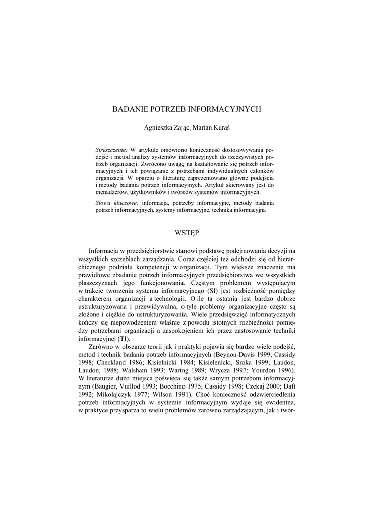 BADANIE POTRZEB INFORMACYJNYCH Agnieszka Zając, Marian Kuraś Streszczenie: W artykule omówiono konieczność dostosowywania podejść i metod analizy systemów informacyjnych do rzeczywistych potrzeb organizacji. Zwrócono uwagę na kształtowanie się potrzeb informacyjnych i ich powiązanie z potrzebami indywidualnych członków organizacji. W oparciu o literaturę zaprezentowano główne podejścia i metody badania potrzeb informacyjnych. Artykuł skierowany jest do menadżerów, użytkowników i twórców systemów informacyjnych. Słowa kluczowe: informacja, potrzeby informacyjne, metody badania potrzeb informacyjnych, systemy informacyjne, technika informacyjna WSTĘP Informacja w przedsiębiorstwie stanowi podstawę podejmowania decyzji na wszystkich szczeblach zarządzania. Coraz częściej też odchodzi się od hierarchicznego podziału kompetencji w organizacji. Tym większe znaczenie ma prawidłowe zbadanie potrzeb informacyjnych przedsiębiorstwa we wszystkich płaszczyznach jego funkcjonowania. Częstym problemem występującym w trakcie tworzenia systemu informacyjnego (SI) jest rozbieżność pomiędzy charakterem organizacji a technologii. O ile ta ostatnia jest bardzo dobrze ustrukturyzowana i przewidywalna, o tyle problemy organizacyjne często są złożone i ciężkie do ustrukturyzowania. Wiele przedsięwzięć informatycznych kończy się niepowodzeniem właśnie z powodu istotnych rozbieżności pomiędzy potrzebami organizacji a zaspokojeniem ich przez zastosowanie techniki informacyjnej (TI). Zarówno w obszarze teorii jak i praktyki pojawia się bardzo wiele podejść, metod i technik badania potrzeb informacyjnych (Beynon-Davis 1999; Cassidy 1998; Checkland 1986; Kisielnicki 1984; Kisielenicki, Sroka 1999; Laudon, Laudon, 1988; Walsham 1993; Waring 1989; Wrycza 1997; Yourdon 1996). W literaturze dużo miejsca poświęca się także samym potrzebom informacyjnym (Baugier, Vuillod 1993; Bocchino 1975; Cassidy 1998; Czekaj 2000; Daft 1992; Mikołajczyk 1977; Wilson 1991). Choć konieczność odzwierciedlenia potrzeb informacyjnych w systemie informacyjnym wydaje się ewidentna, w praktyce przysparza to wielu problemów zarówno zarządzającym, jak i twór- com systemów informacyjnych. Przyczyn takiej sytuacji może być wiele. Związane one są z nieznajomością możliwości jakie daje technika informacyjna przez członków organizacji a z drugiej strony niezrozumienia potrzeb przedsiębiorstwa przez specjalistów z zakresu TI. Celem artykułu jest zwrócenie uwagi na kształtowanie się potrzeb informacyjnych, ich znaczenie w procesie działalności organizacji oraz przedstawienie głównych koncepcji i metodyk badania potrzeb informacyjnych. W pierwszej części artykułu zaprezentowano znaczenie informacji w przedsiębiorstwie oraz główne czynniki wpływające na kształtowanie się potrzeb. Zaprezentowano również zestawienie standardowych obszarów wyłaniania się potrzeb informacyjnych. Drugi rozdział poświęcony jest koncepcjom metodycznym badania potrzeb informacyjnych oraz ich różnorodności i próbie klasyfikacji. W rozdziale trzecim omówiono główne podejścia oraz metody analizy i projektowania systemów w kontekście dostosowania rozwiązań do potrzeb informacyjnych organizacji. Artykuł zamykają wnioski dotyczące zakresu i konieczności badania potrzeb informacyjnych w dobie ery informacyjnej 1. KSZTAŁTOWANIE SIĘ POTRZEB INFORMACYJNYCH Informacje w organizacji stanowią podstawę budowania wiedzy wszystkich osób zaangażowanych w proces ich pozyskiwania i wykorzystywania. Kształtują świadomość o zjawiskach zachodzących w samym przedsiębiorstwie oraz jego otoczeniu. Umożliwiają dostosowywanie organizacji do zmieniającej się rzeczywistości i umożliwiają przekształcanie tej rzeczywistości w celu sprawnego funkcjonowania. Dzięki informacjom przedsiębiorstwo może uzmysłowić sobie istniejące problemy i szukać ich rozwiązań. Daft (1992, s. 285) definiując informację w kontekście systemu informacyjnego (SI) zauważa, że „informacja jest to to, co zmienia i wspomaga zrozumienie, natomiast dane stanowią wejście kanału komunikacji. Dane są materialne i składają się z numerów, słów, rozmów telefonicznych lub wydruków komputerowych wysłanych lub otrzymanych. Dane nie staną się informacją dopóki ludzie nie użyją ich do poprawy swojego zrozumienia. Menadżerowie potrzebują informacji nie danych. Systemy informacyjne organizacji, powinny dostarczać raczej informacji niż danych”. Postrzeganie informacji jako przetworzonych danych pomija ważną rolę interpretacji informacji przez człowieka. Jako najbardziej przejrzystą i przydatną definicję danych, informacji i wiedzy można przyjąć tę, którą przedstawił Beynon-Davis (1999, s. 16): Dane to fakty. Dana, jako jednostka danych, jest to jeden lub kilka symboli, użytych do reprezentowania czegoś. Informacja to zinterpretowane dane. Informacje to dane umieszczone w znaczącym kontekście. Informacja ma charakter subiektywny. Informacja musi być zawsze rozpatrywana w kontekście jej odbiorcy. Te same dane mogą być różnie interpretowane przez różnych ludzi w zależności od posiadanej wiedzy. Wiedza jest otrzymywana z informacji przez jej zintegrowanie z wiedzą istniejącą. W kontekście niepewności i/lub niejednoznaczności powstają potrzeby informacyjne decydentów. „Sytuacje organizacyjne stwarzają niepewność i niejednoznaczność dla menadżerów, która przekłada się na wymagania (potrzeby) w stosunku do ilości i bogactwa informacji1. Wskazanie jak różnicują się potrzeby informacyjne menadżerów i jednostek organizacyjnych w tych dwóch wymiarach i jak zaprojektować informacyjny system wspomagający to kluczowe problemy do rozwiązania dla organizacji” (Daft, 1992, s. 308). Potrzeby informacyjne to zbiór treści (danych, wiadomości, informacji) niezbędnych (koniecznych) do wypełniania misji i osiągan